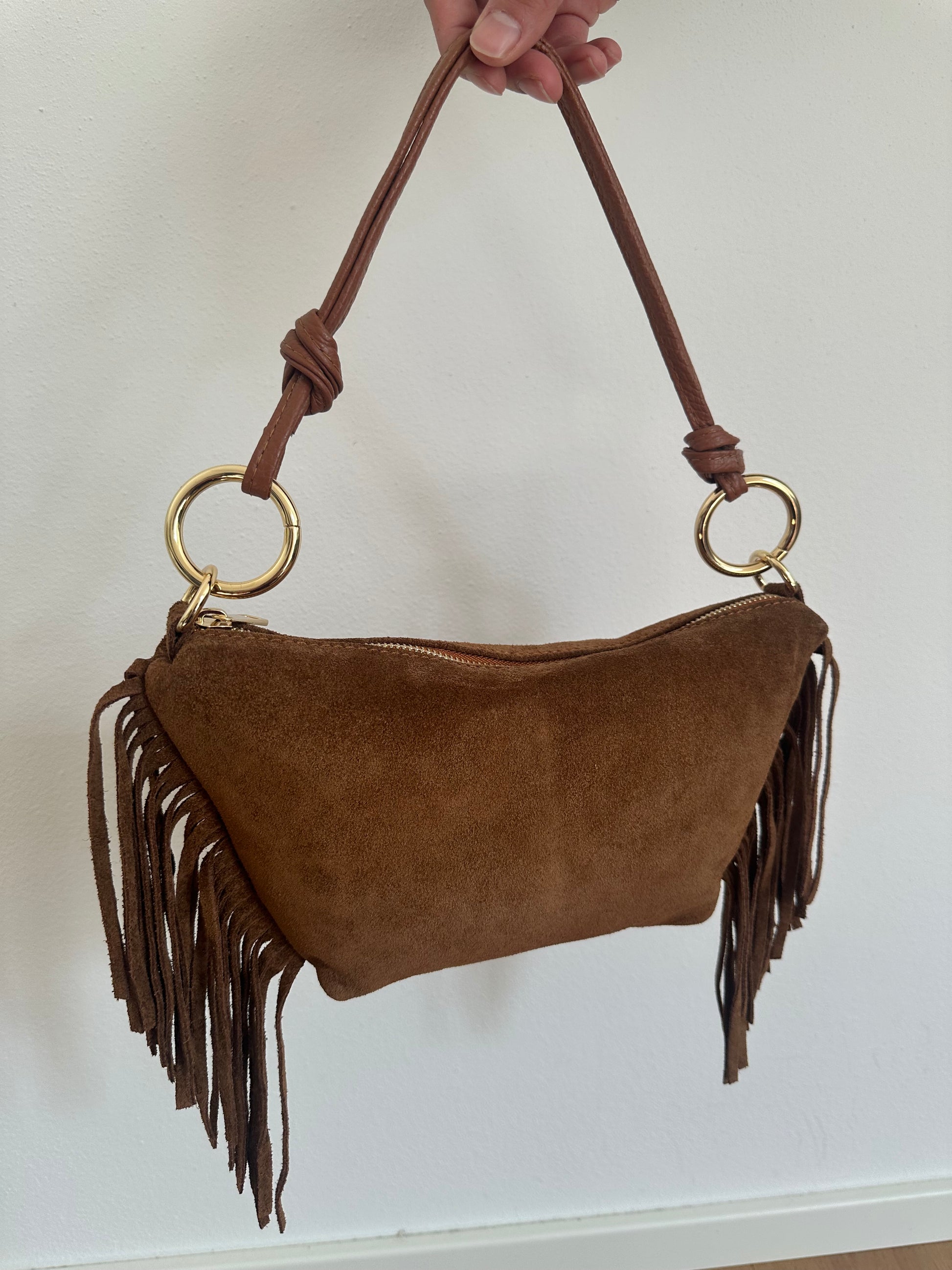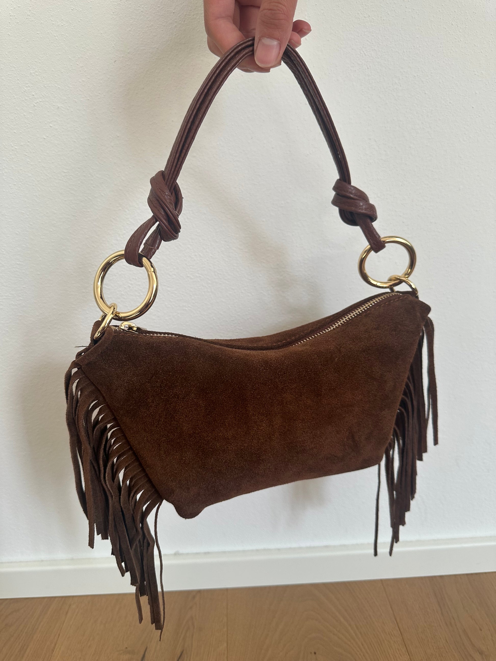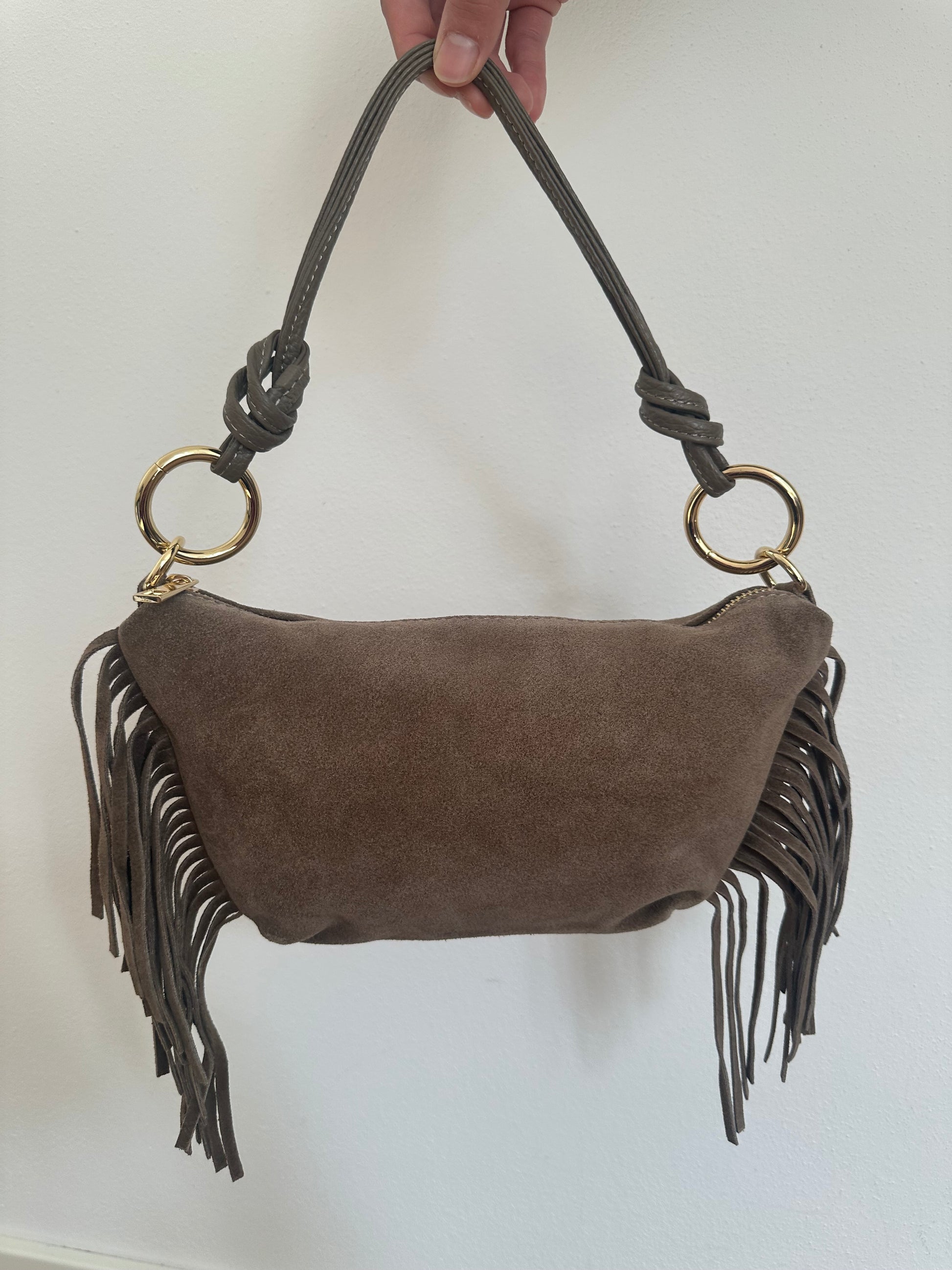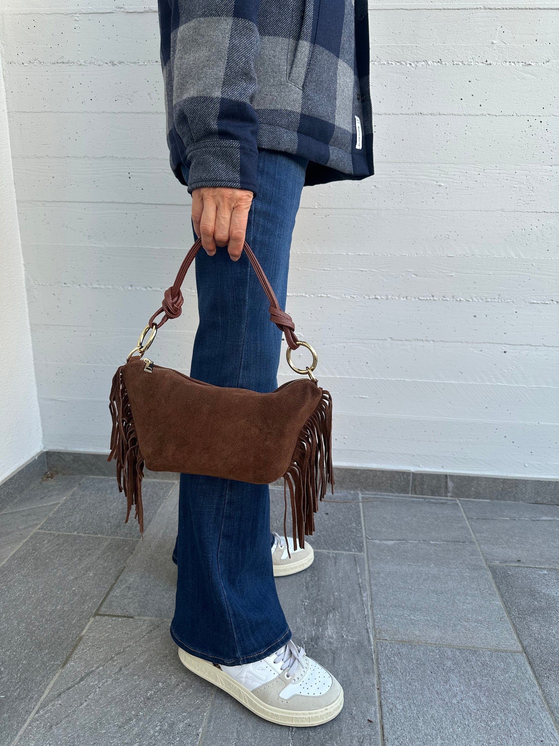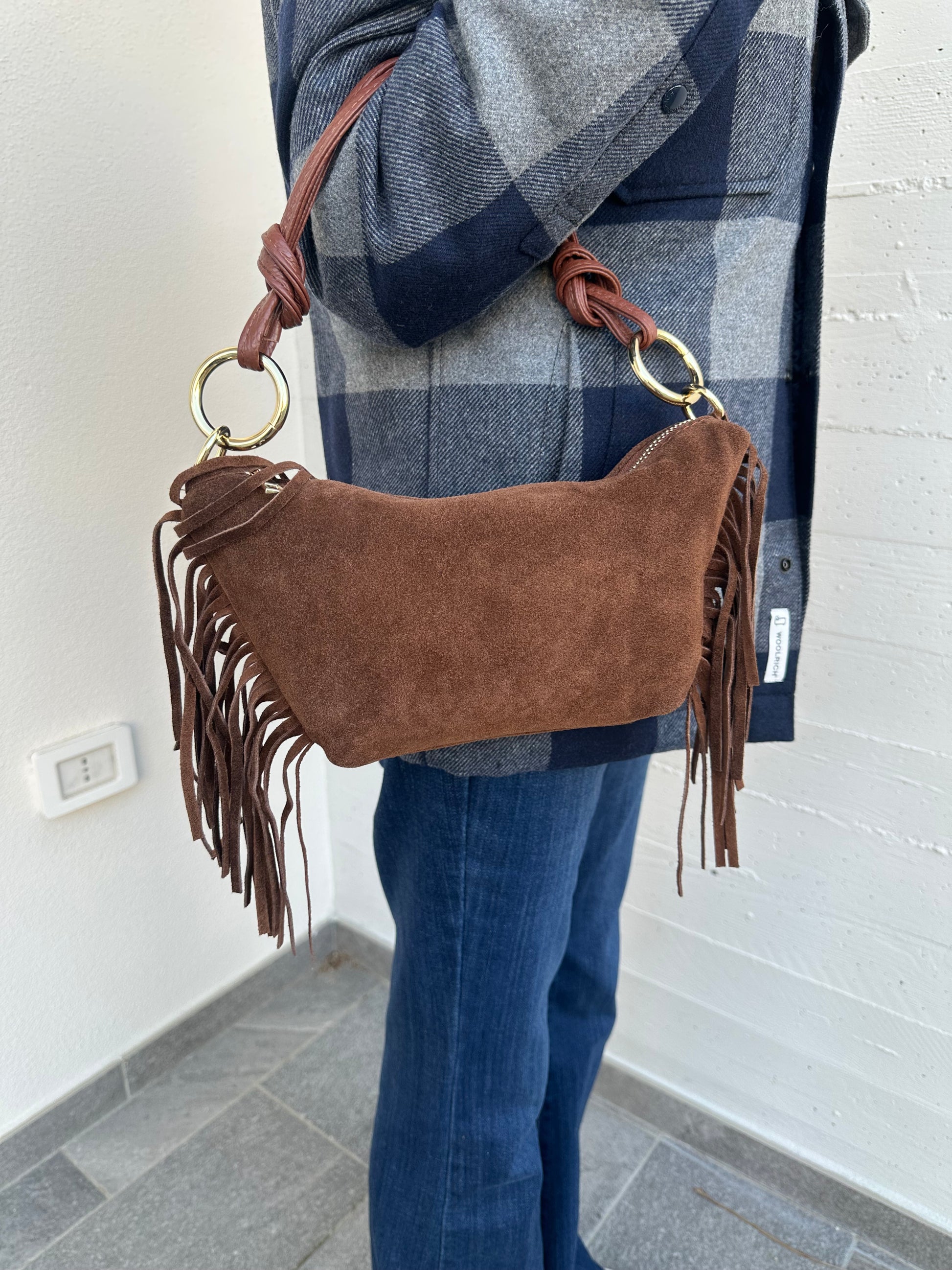 Borsa a spalla in vera pelle scamosciata Made in Italy, con frange laterali e tracolla regolabile compresa.