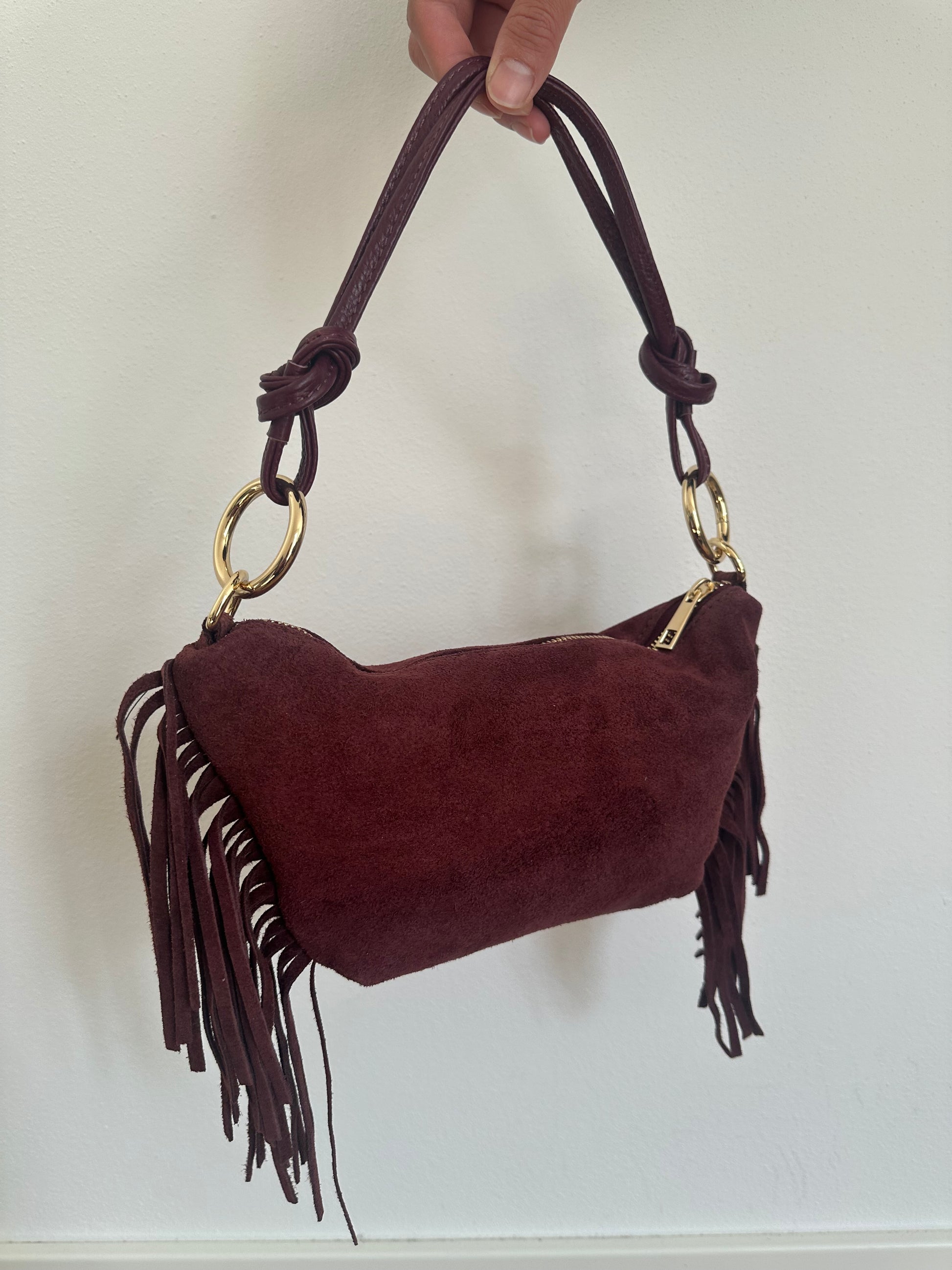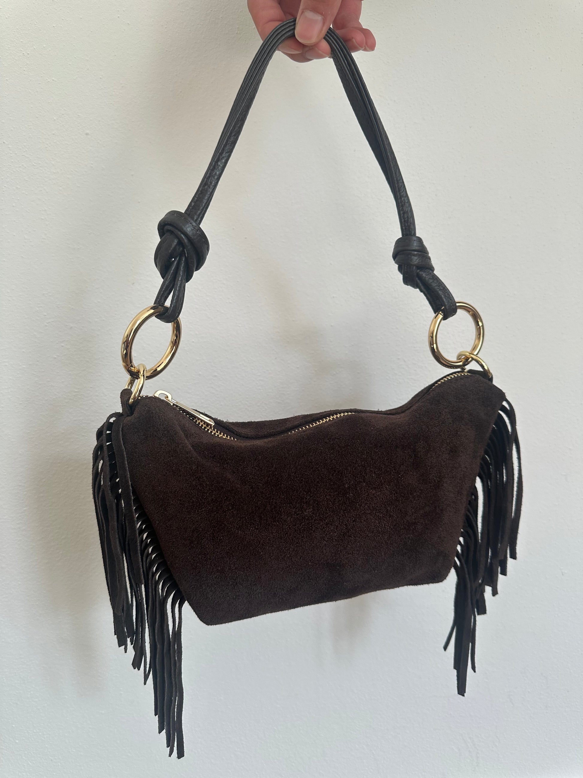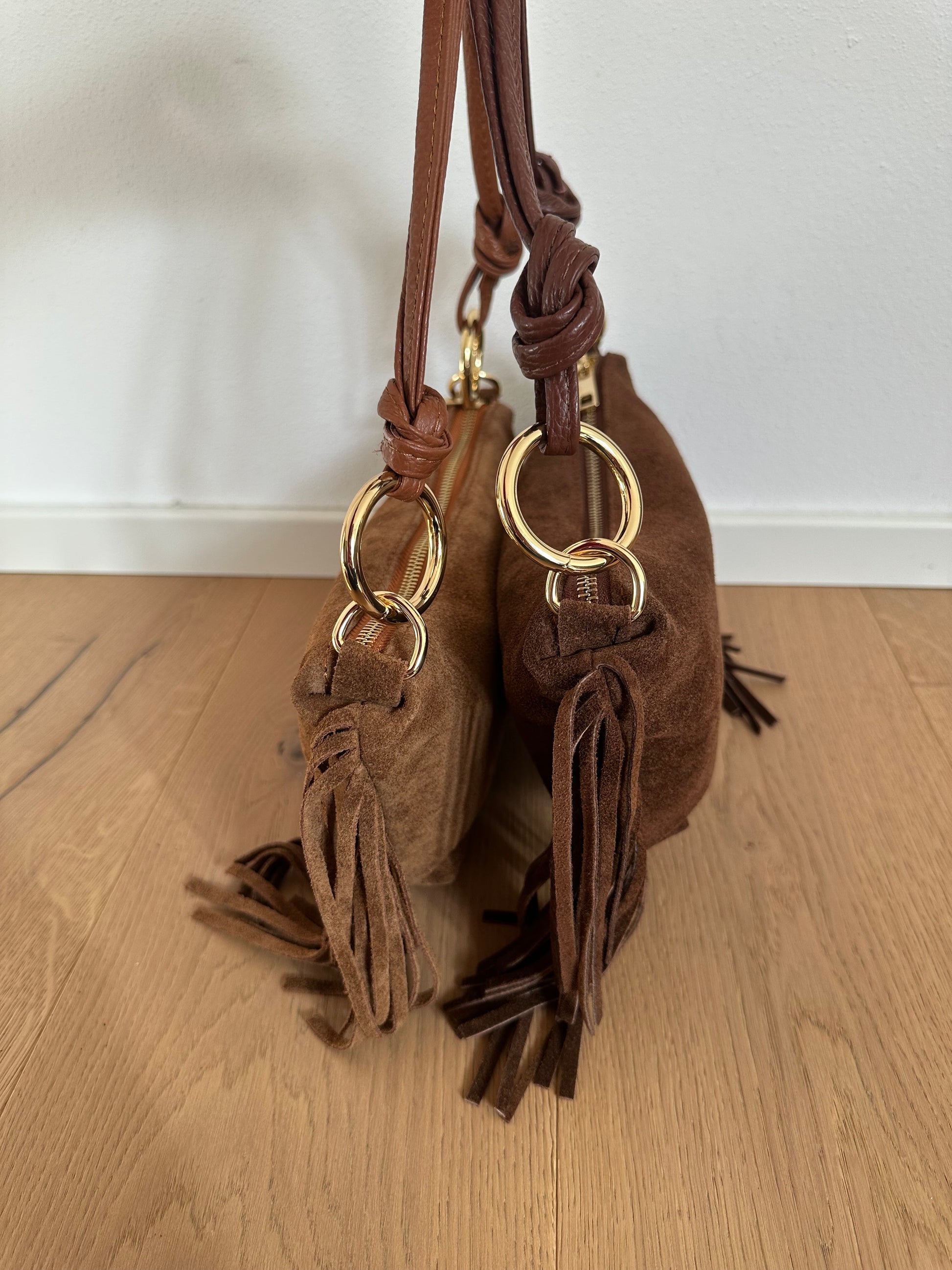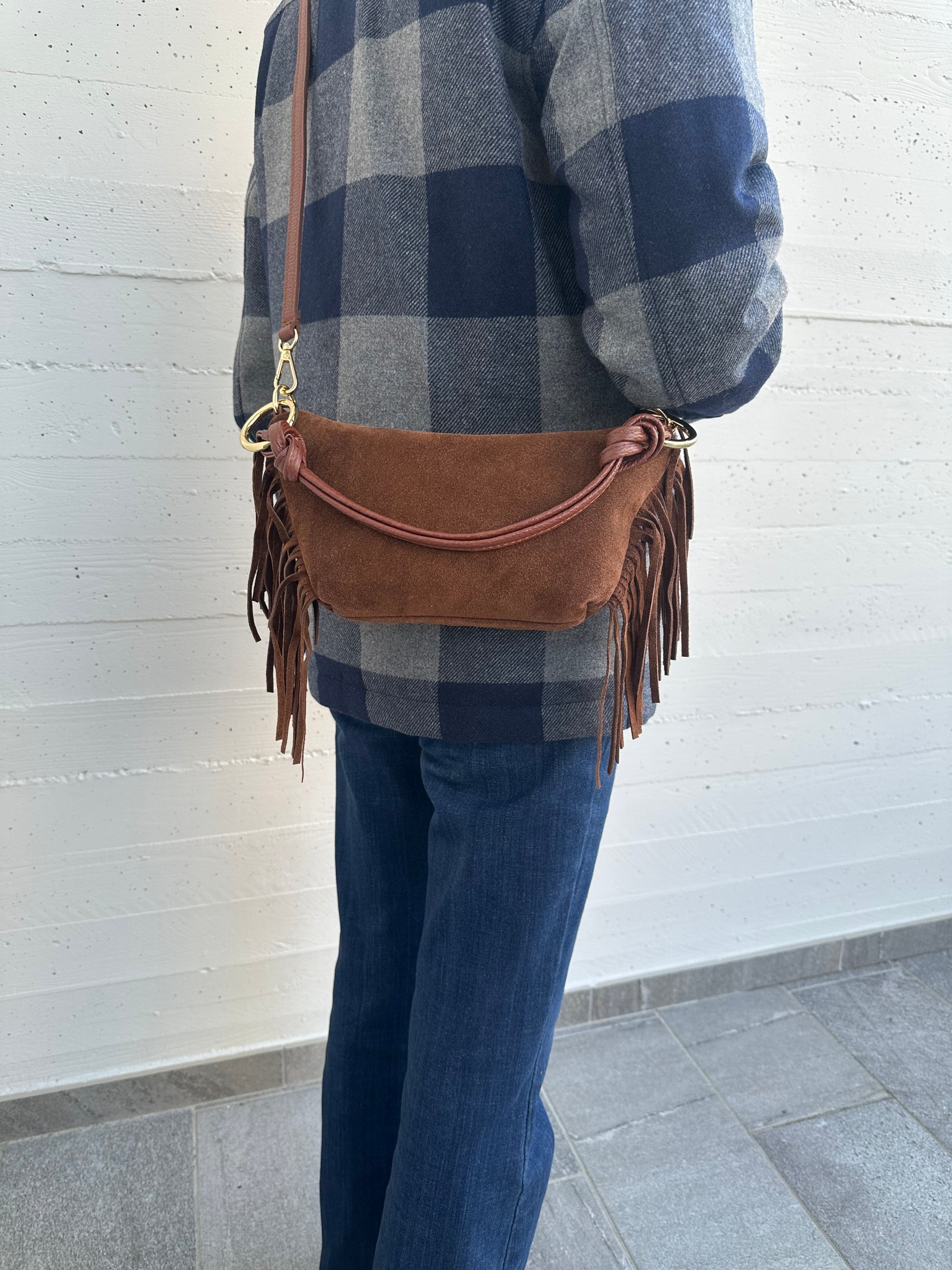Borsa a spalla in vera pelle scamosciata Made in Italy, con frange laterali e tracolla regolabile compresa.
