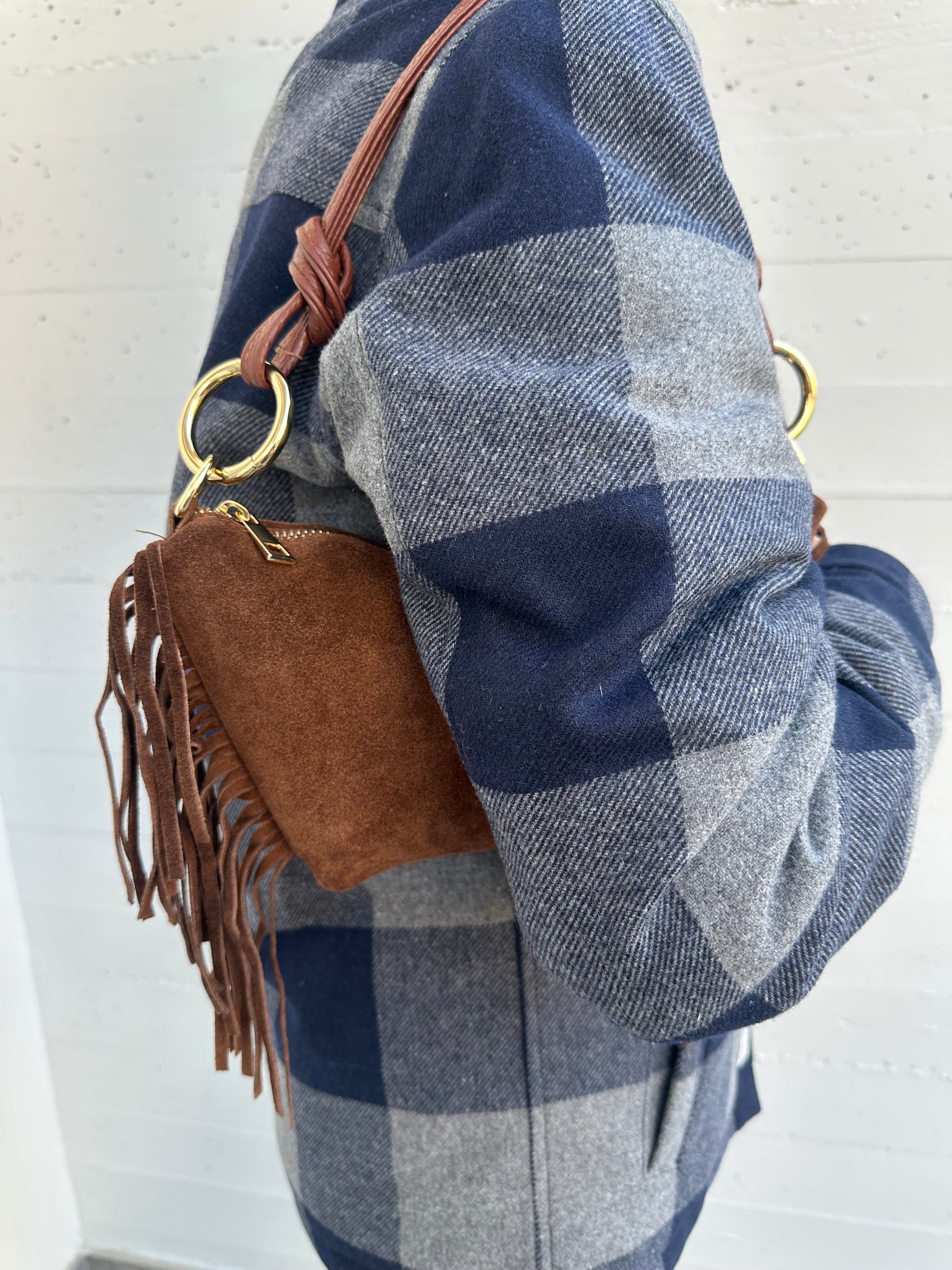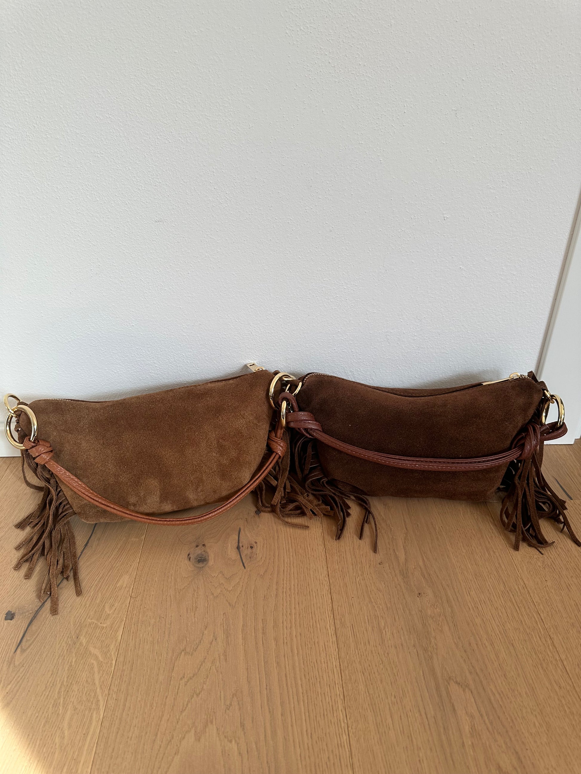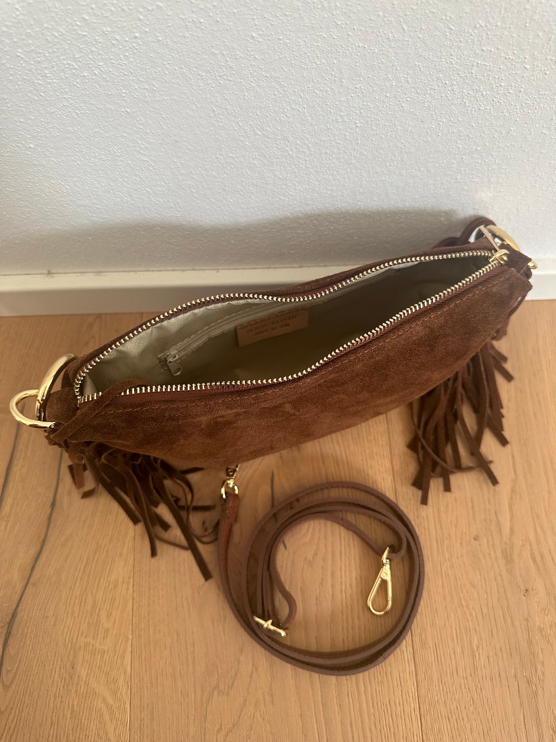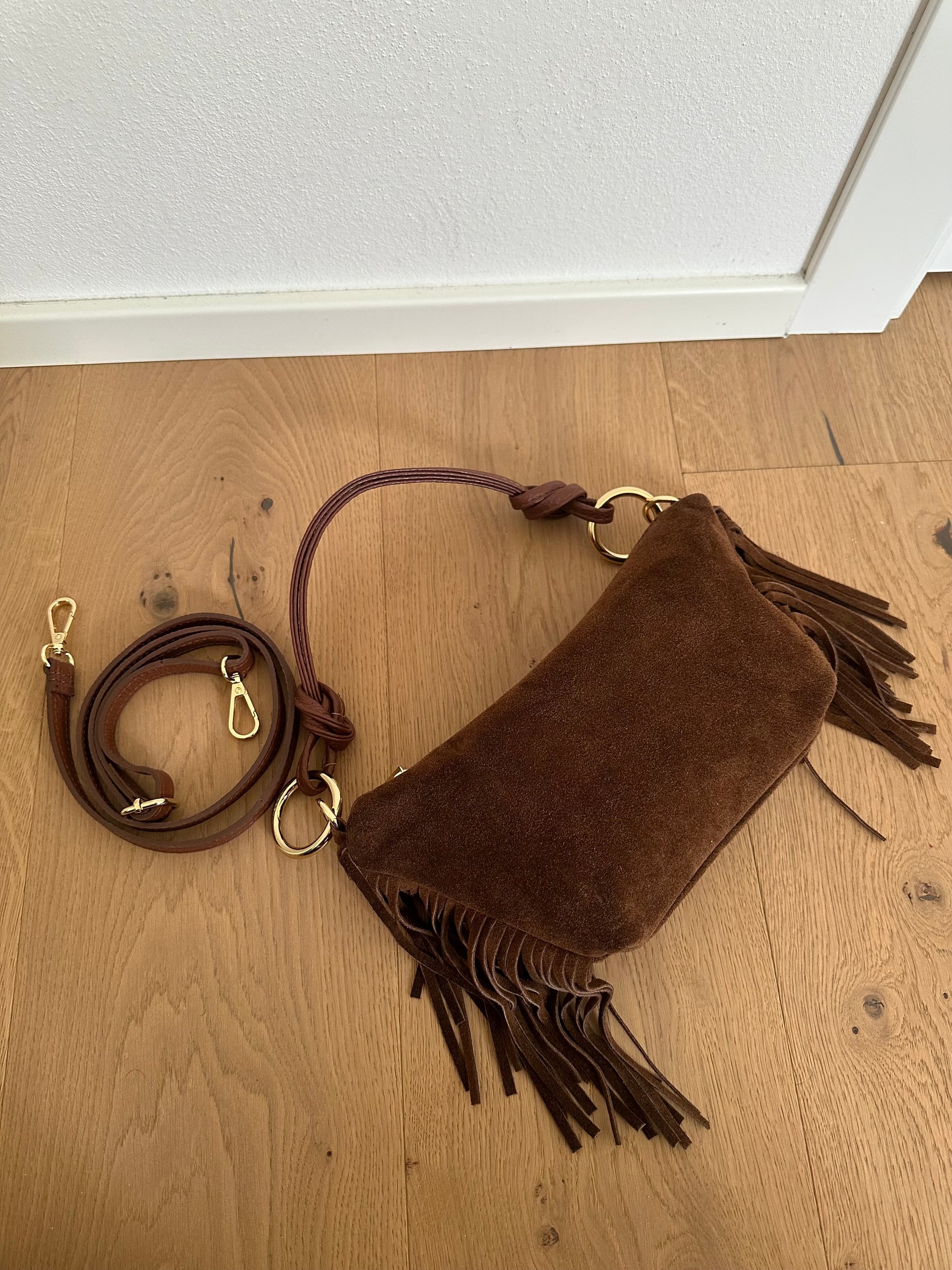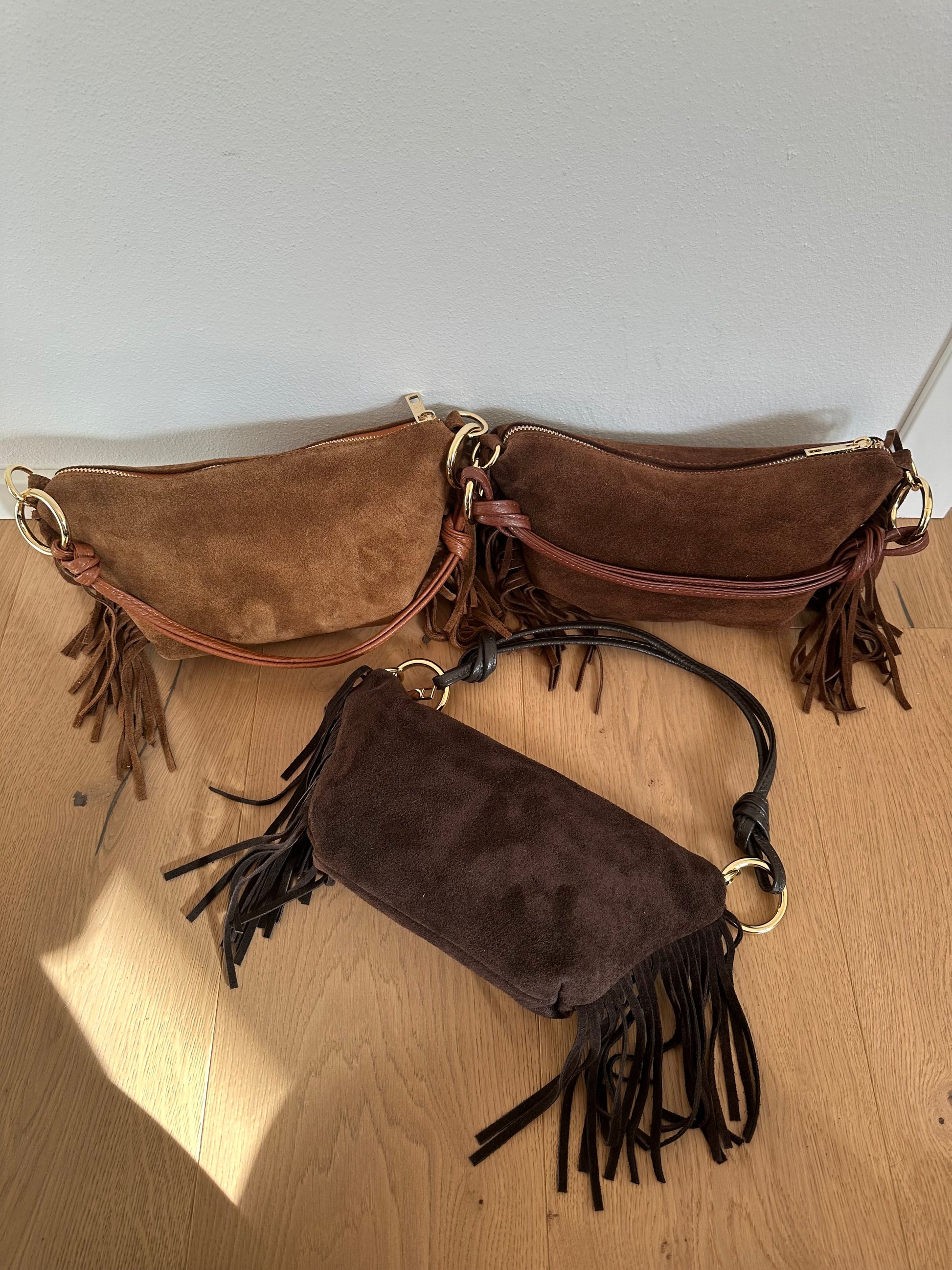 Borsa a spalla in vera pelle scamosciata Made in Italy, con frange laterali e tracolla regolabile compresa.