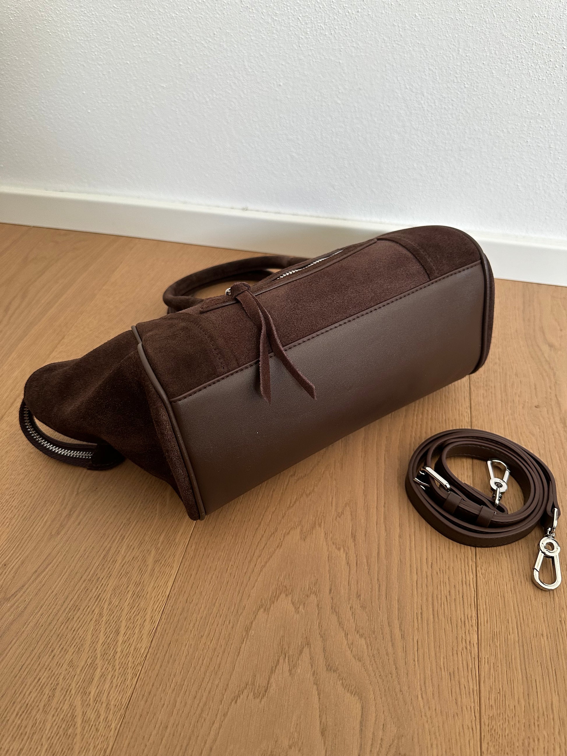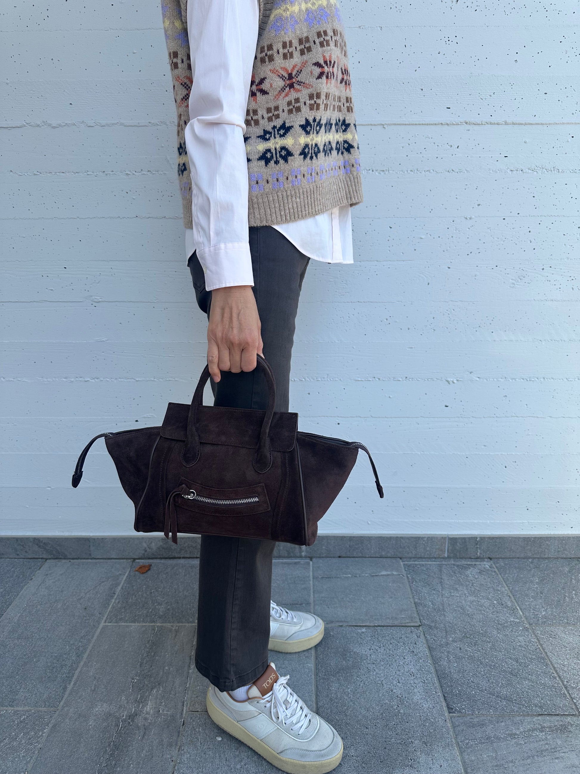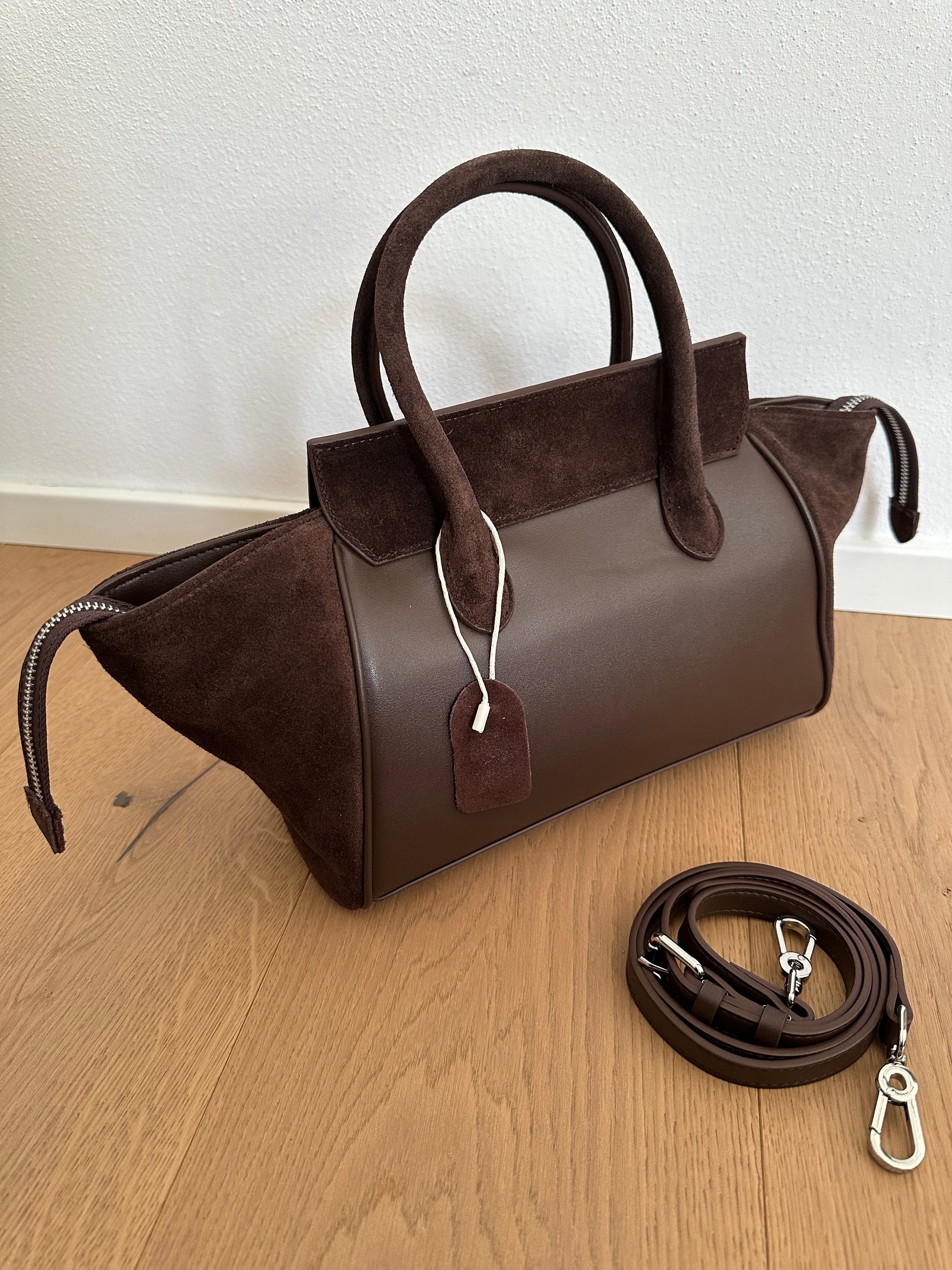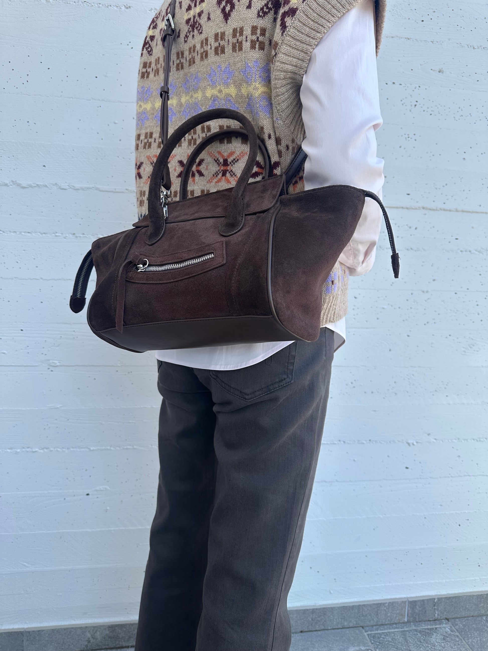 Borsa a mano con tracolla regolabile in vera pelle scamosciata e rifiniture in vera pelle liscia di vitello.