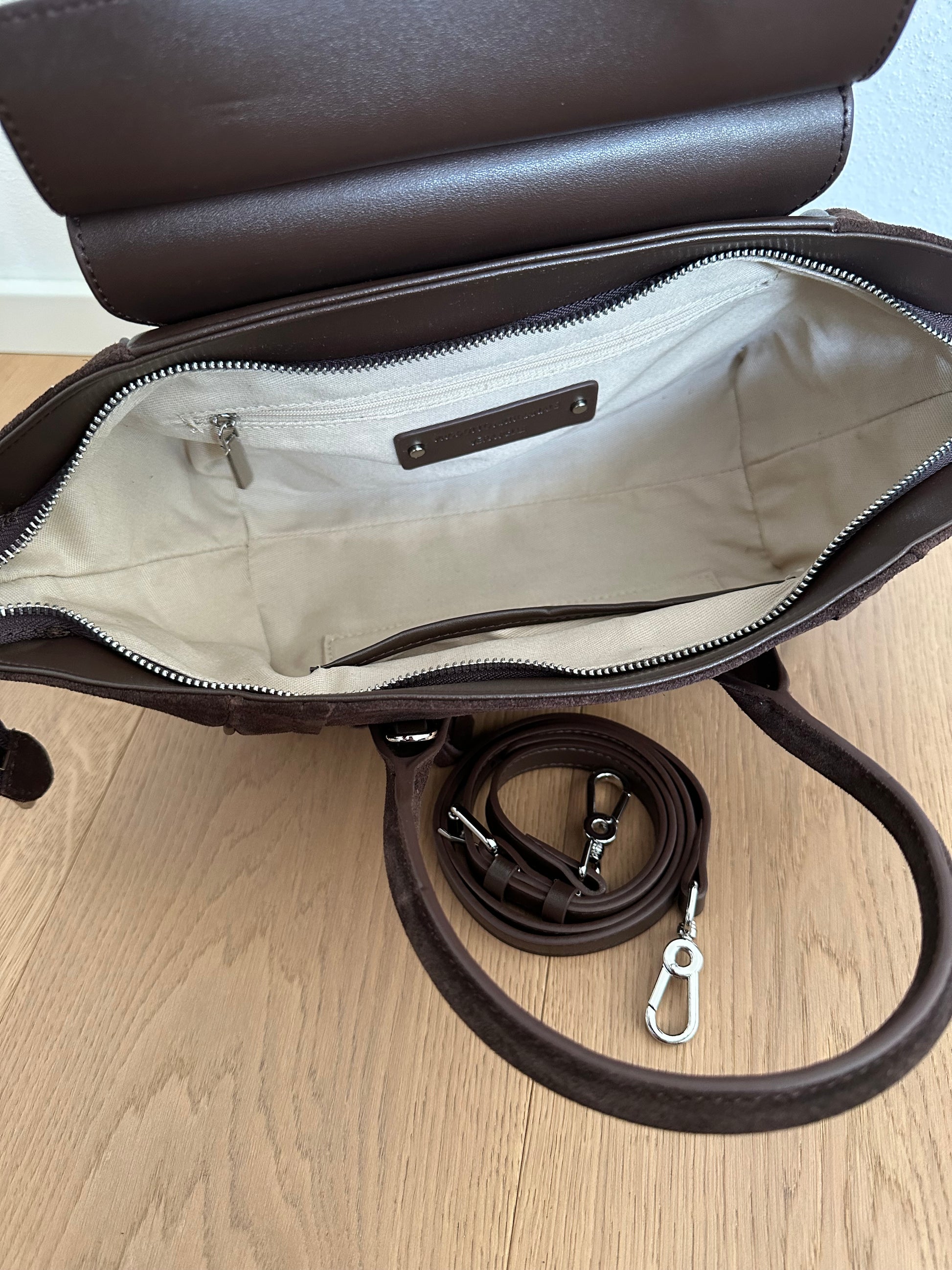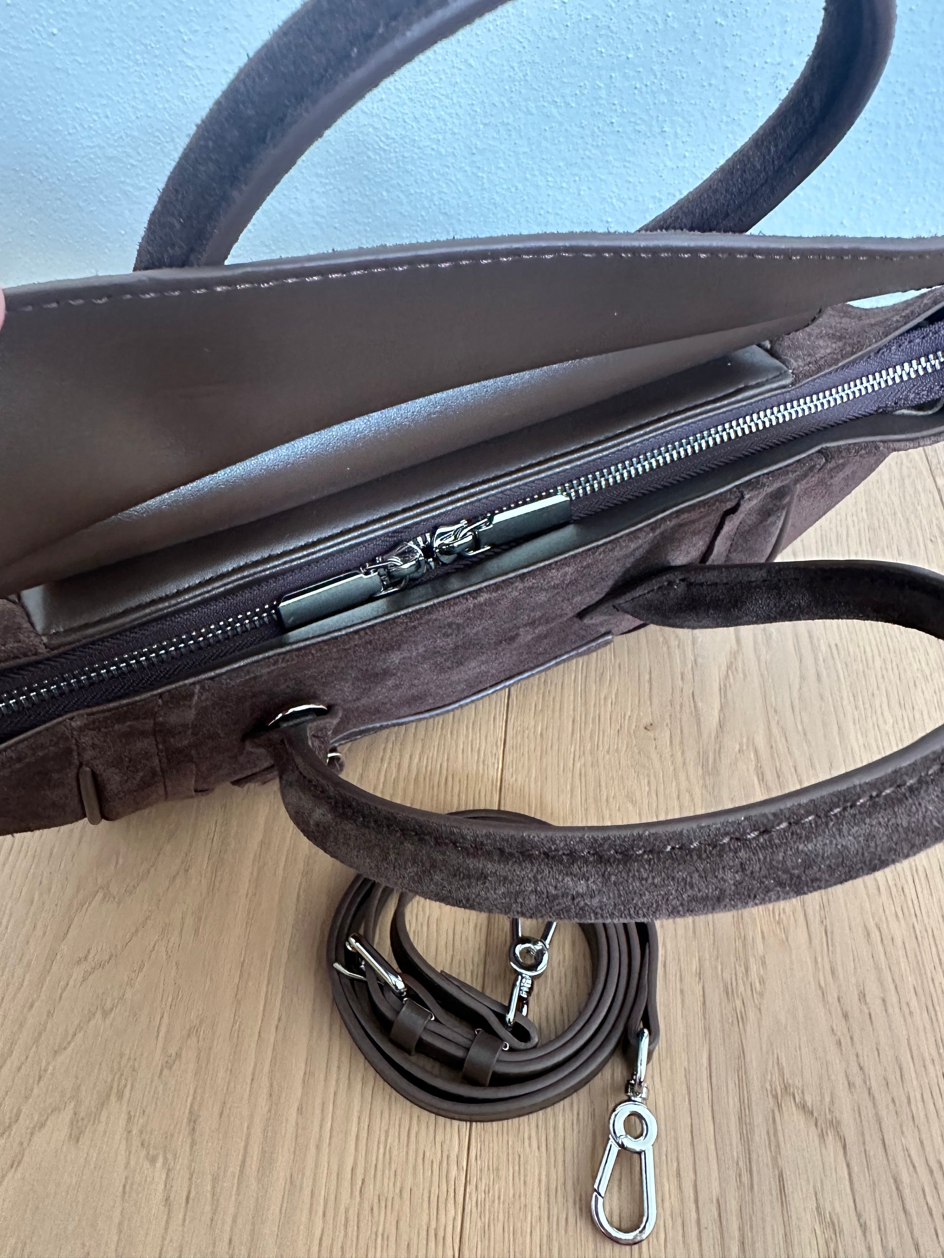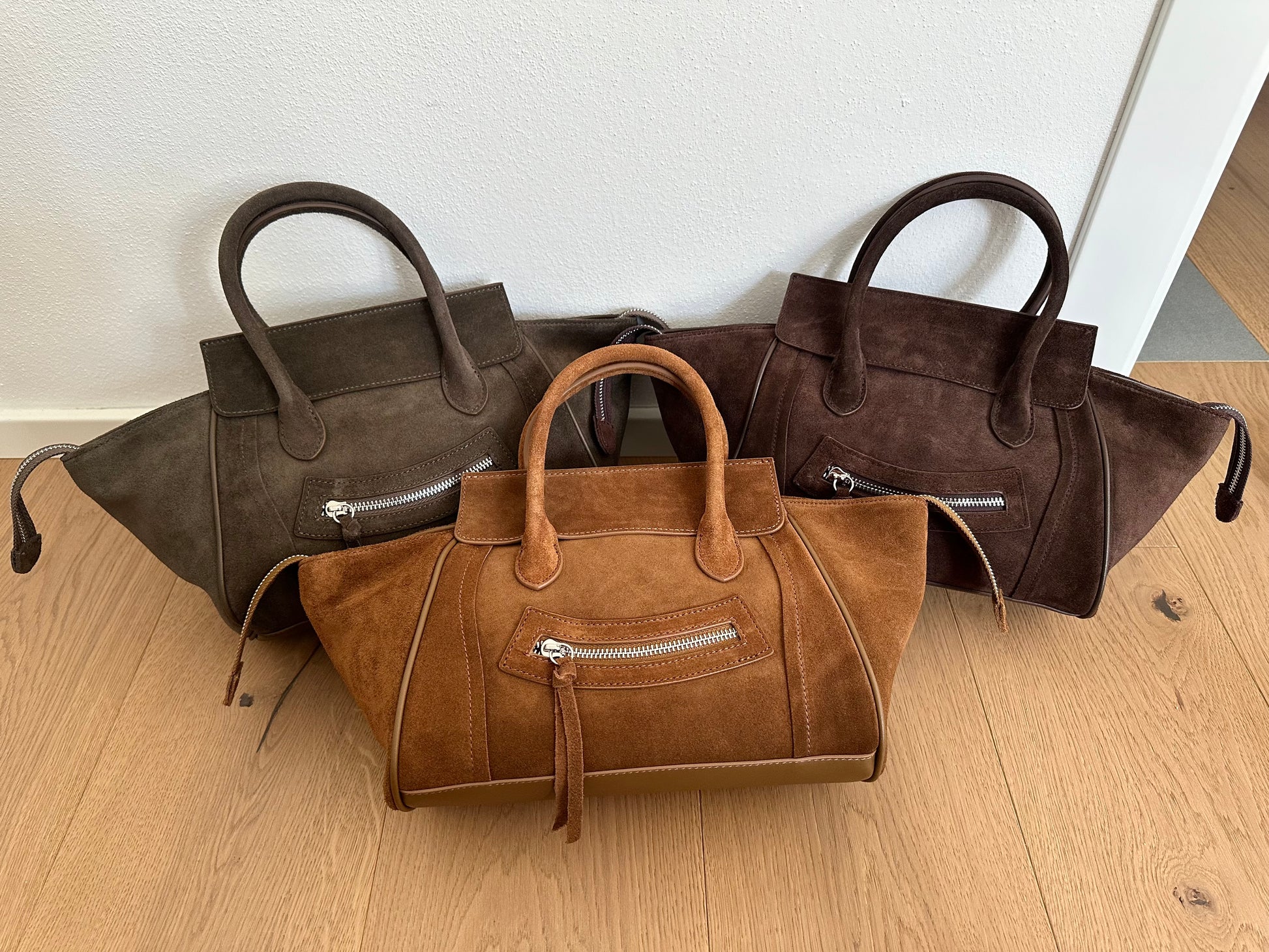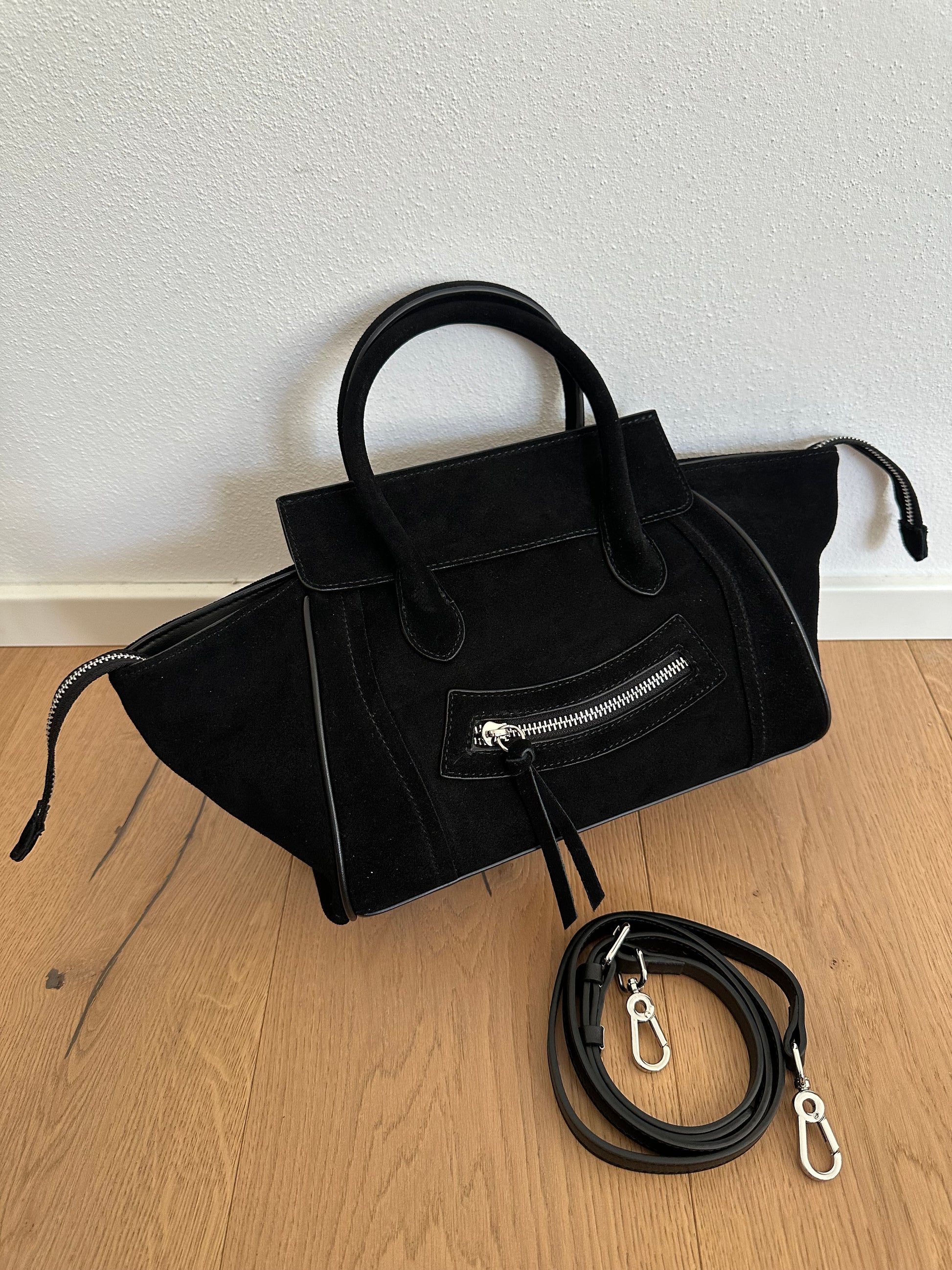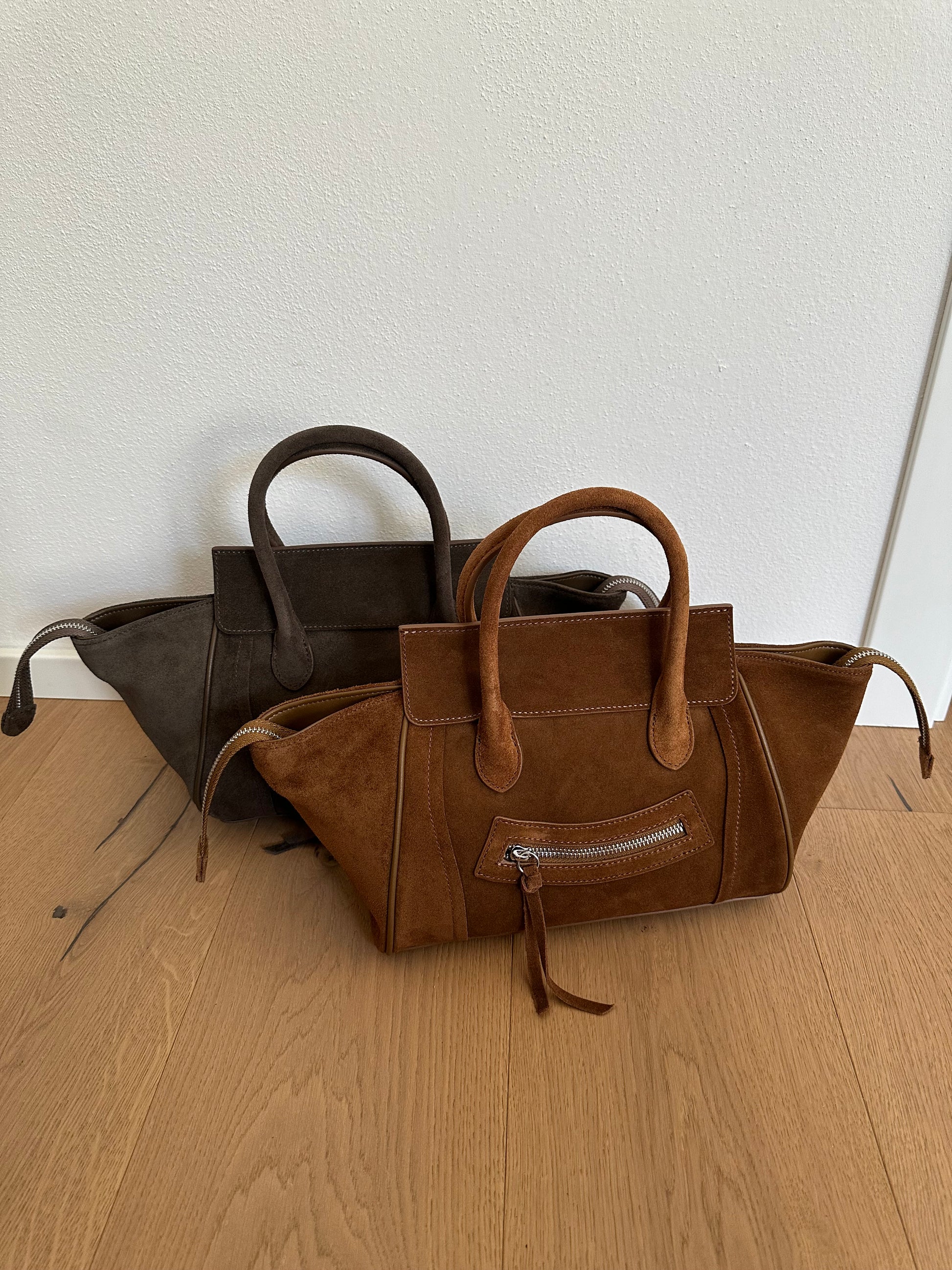 Borsa a mano con tracolla regolabile in vera pelle scamosciata e rifiniture in vera pelle liscia di vitello.