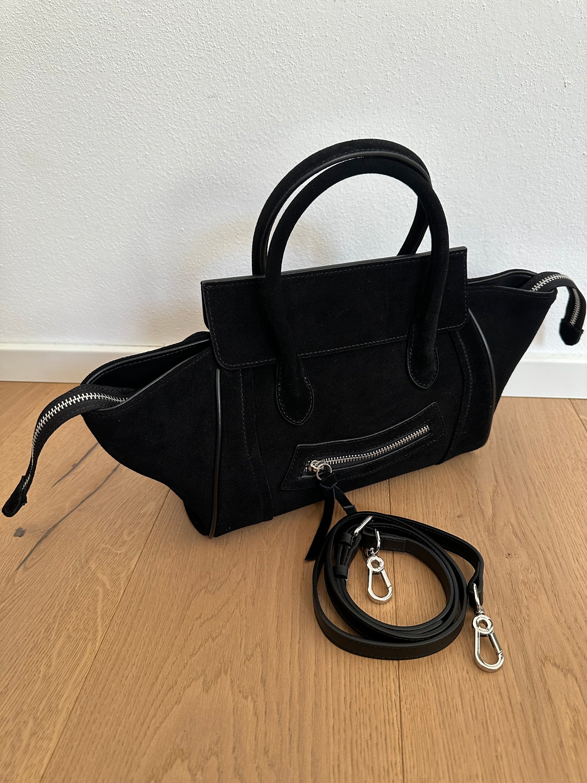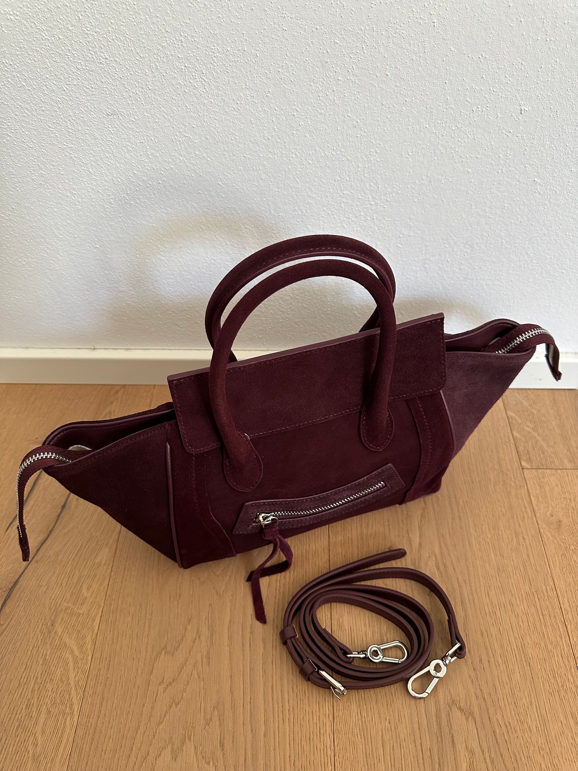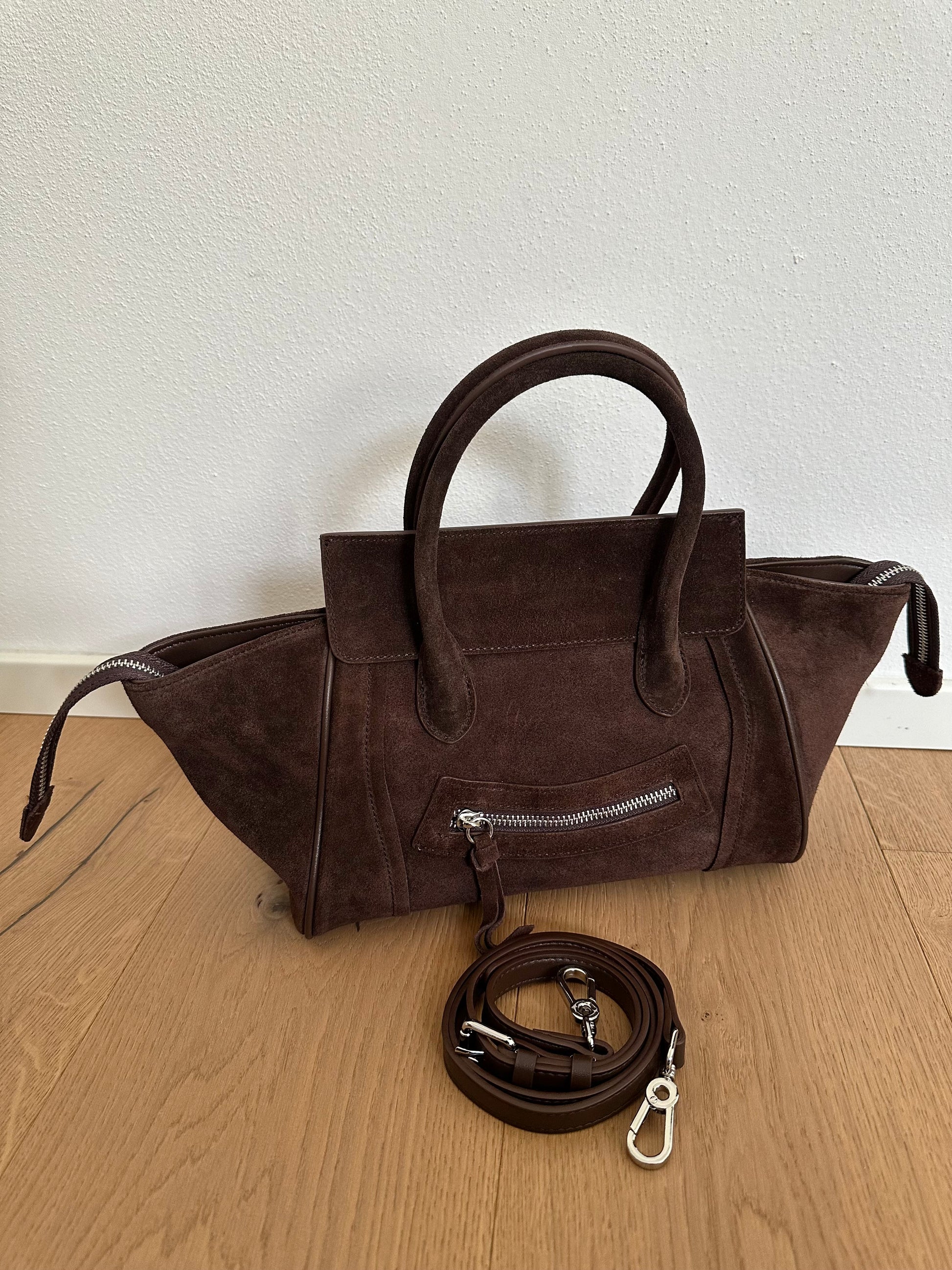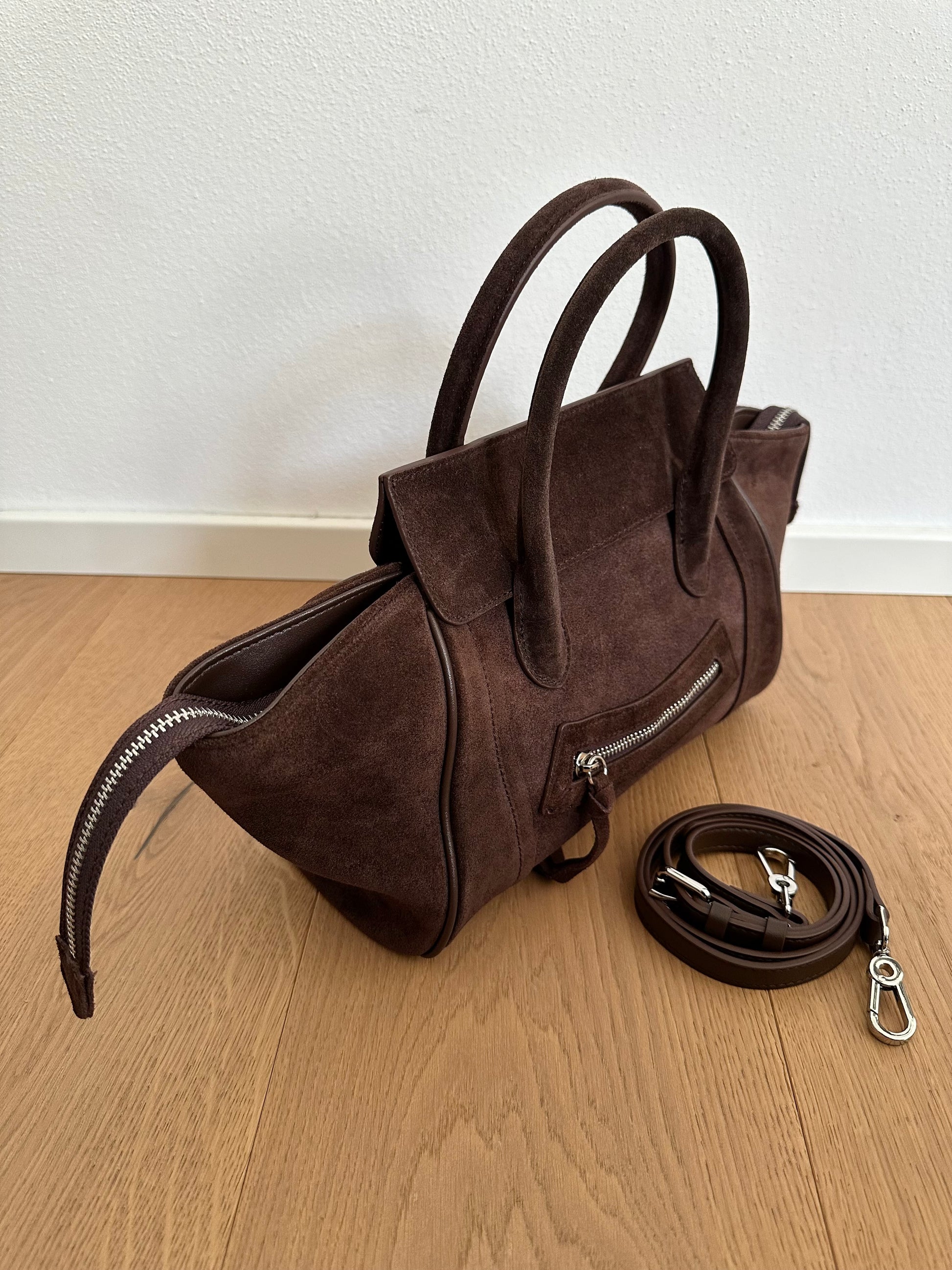 Borsa a mano con tracolla regolabile in vera pelle scamosciata e rifiniture in vera pelle liscia di vitello.