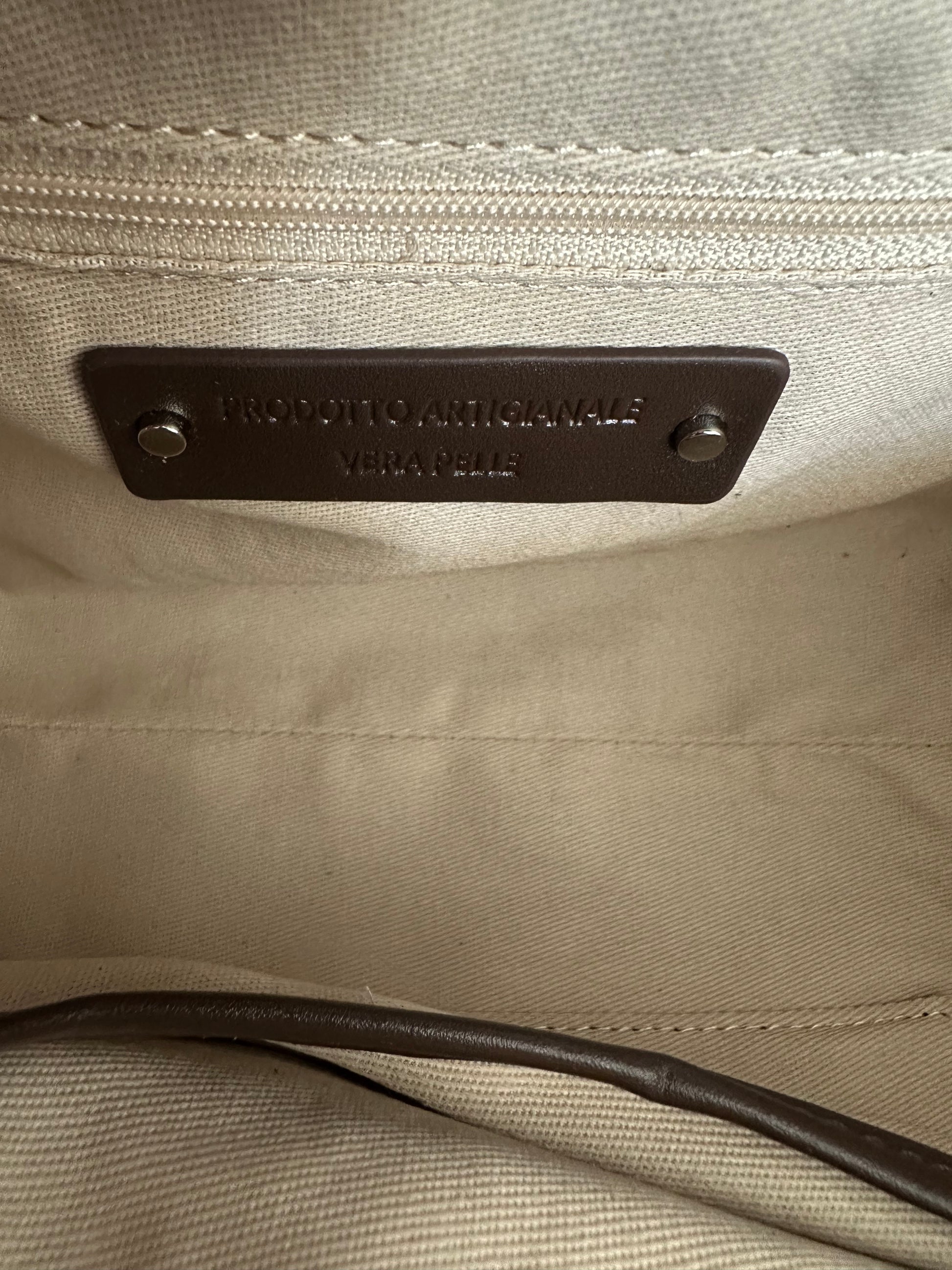Particolare ma classica, doppi manici fissi e chiusura a doppia cerniera. Foderato interno in cotone misto, con varie tasche.