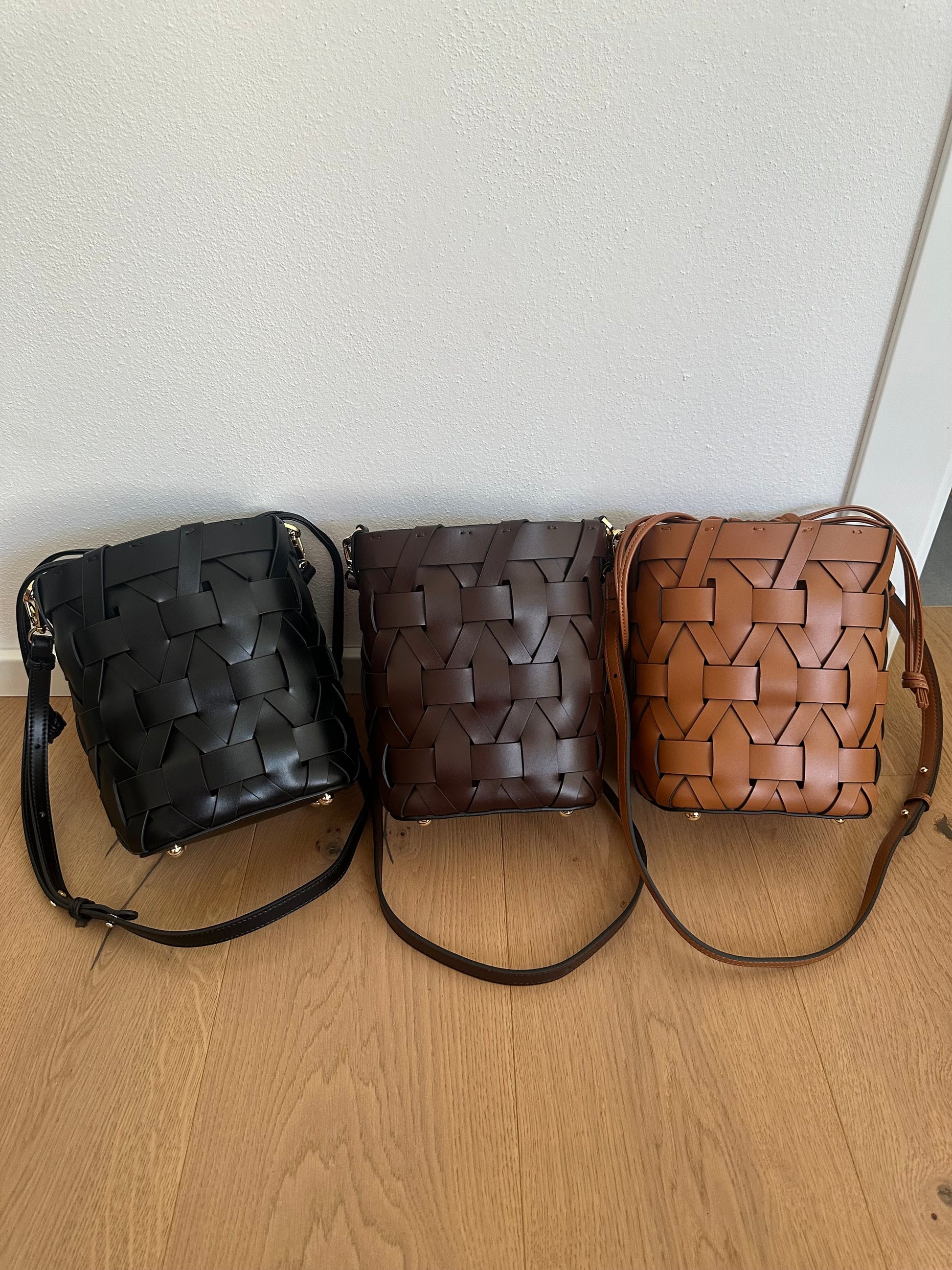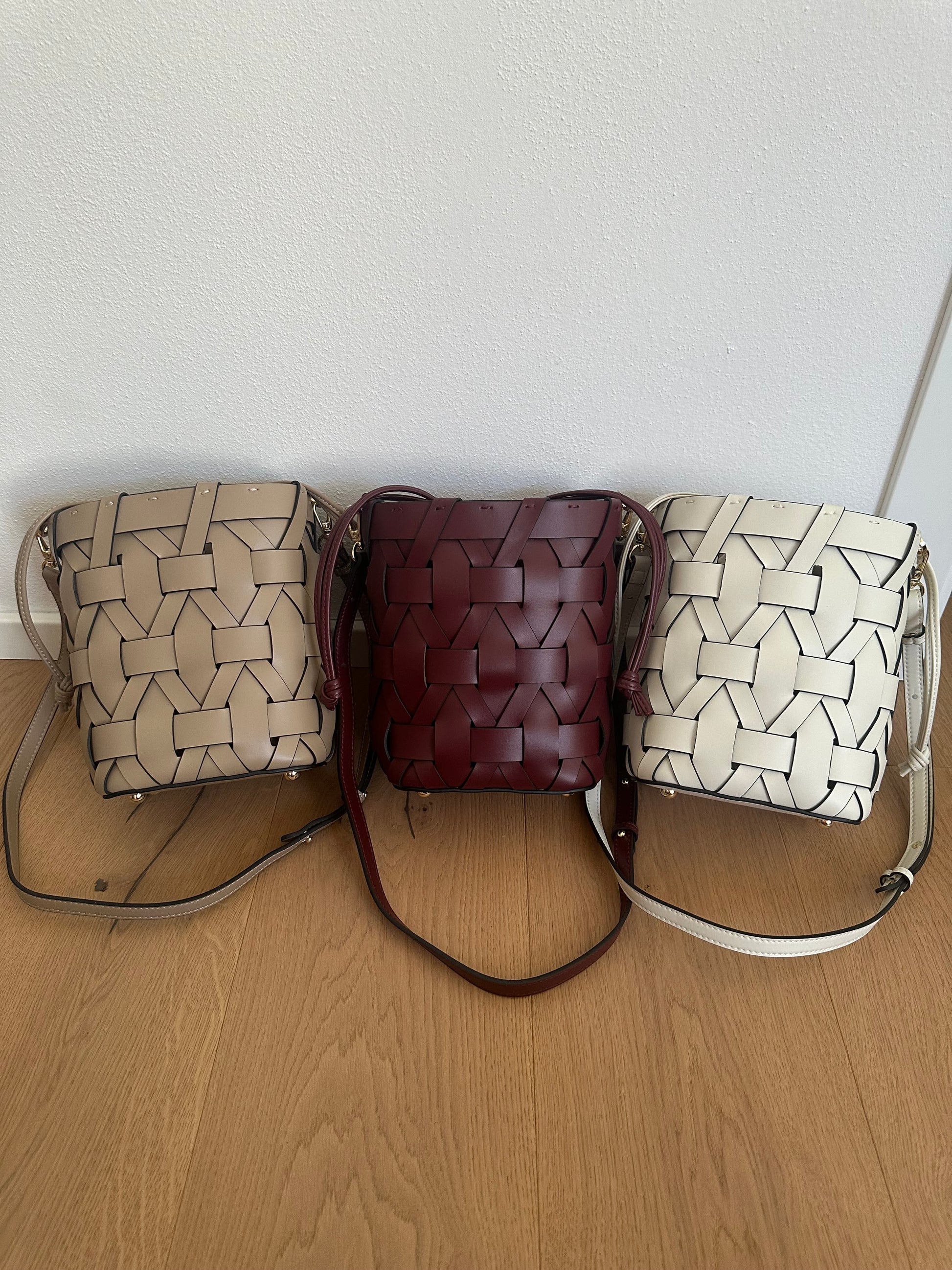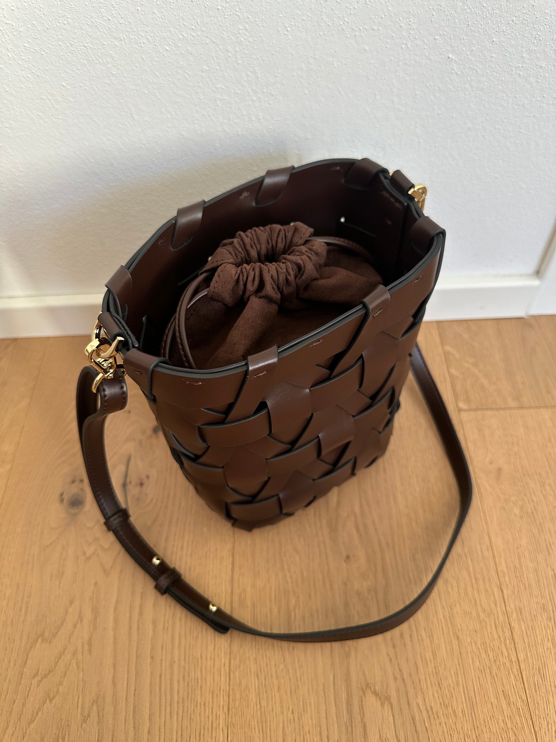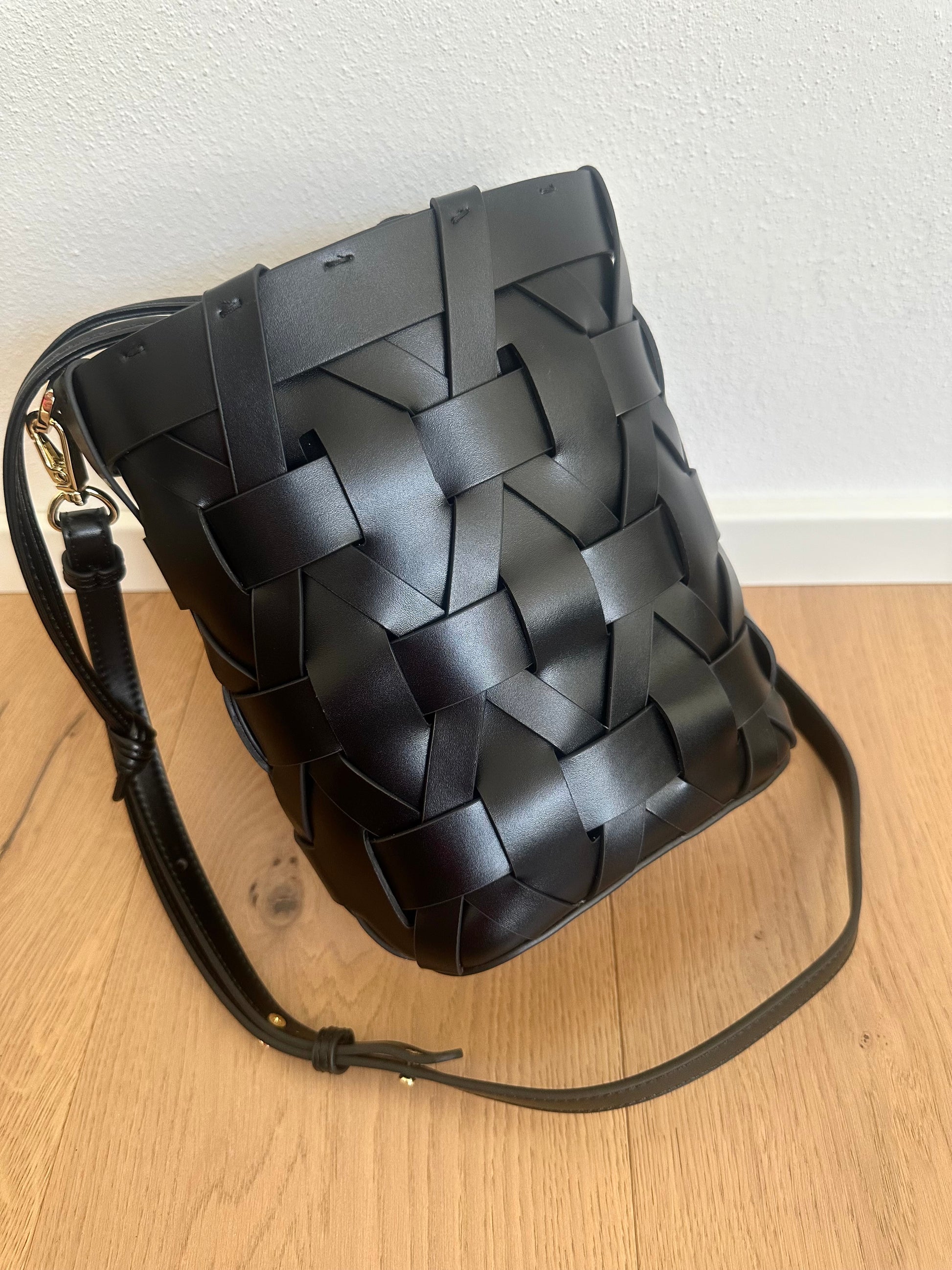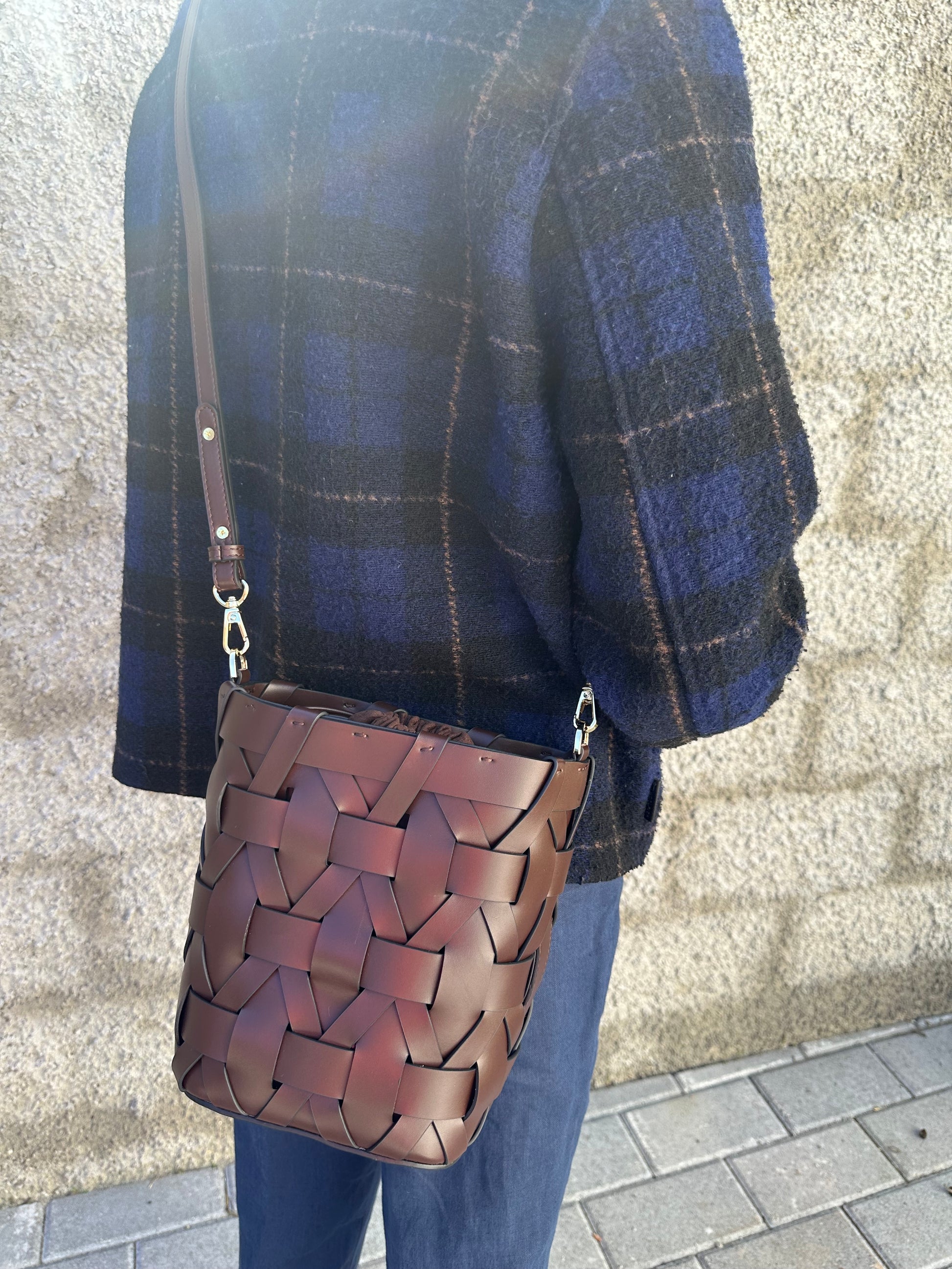 Forma a secchiello, compresa la sua pochette da riporre al suo interno con chiusura a coulisse, e tracolla regolabile. Perfetta per tutte le stagioni, e da abbinare a look più eleganti o anche casual.