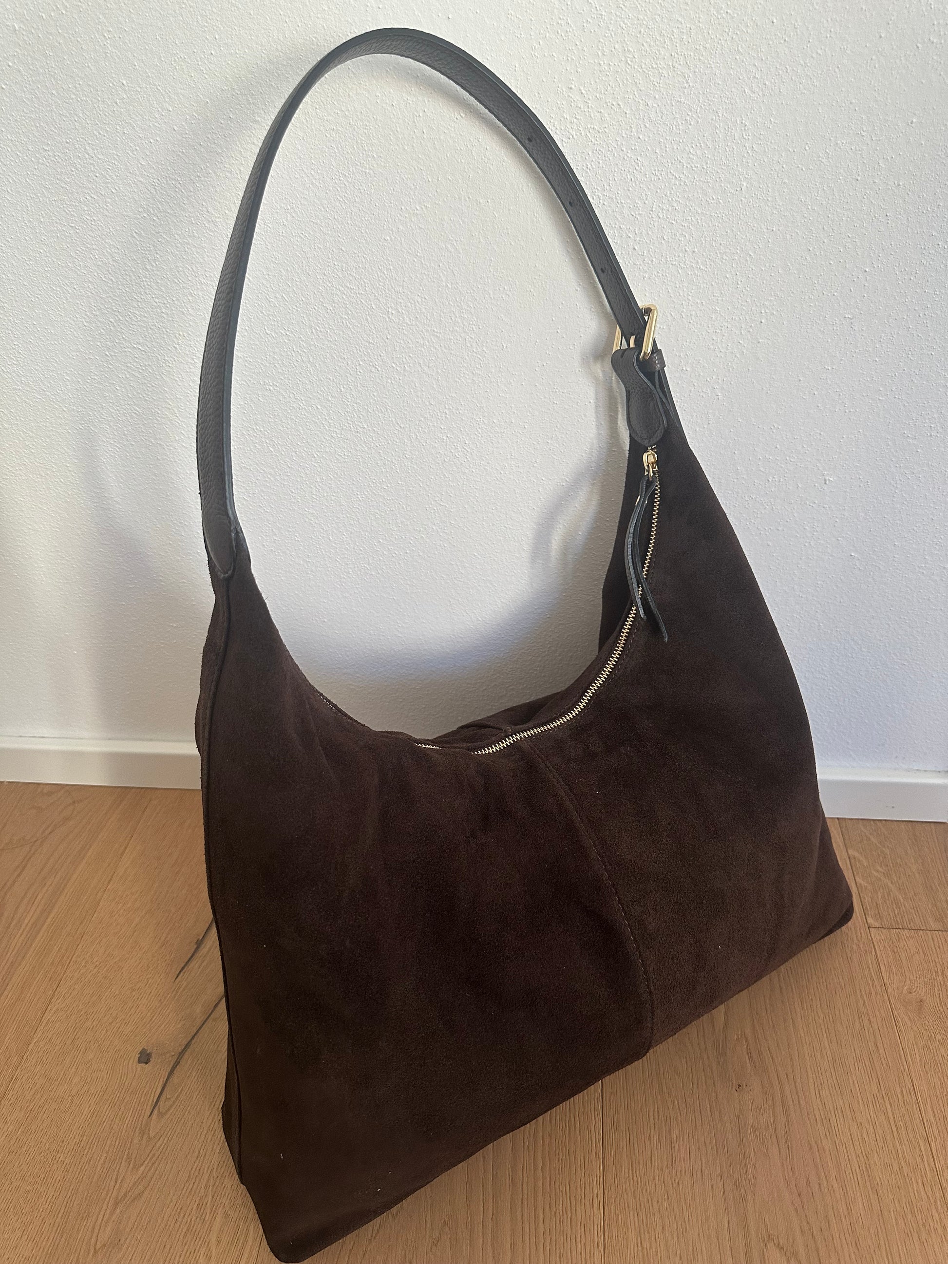 Borsa in vera pelle scamosciata di alta qualità, interamente realizzata in Italia. Pellame scamosciato pregiato, manico singolo regolabile da portare a spalla o tracolla.