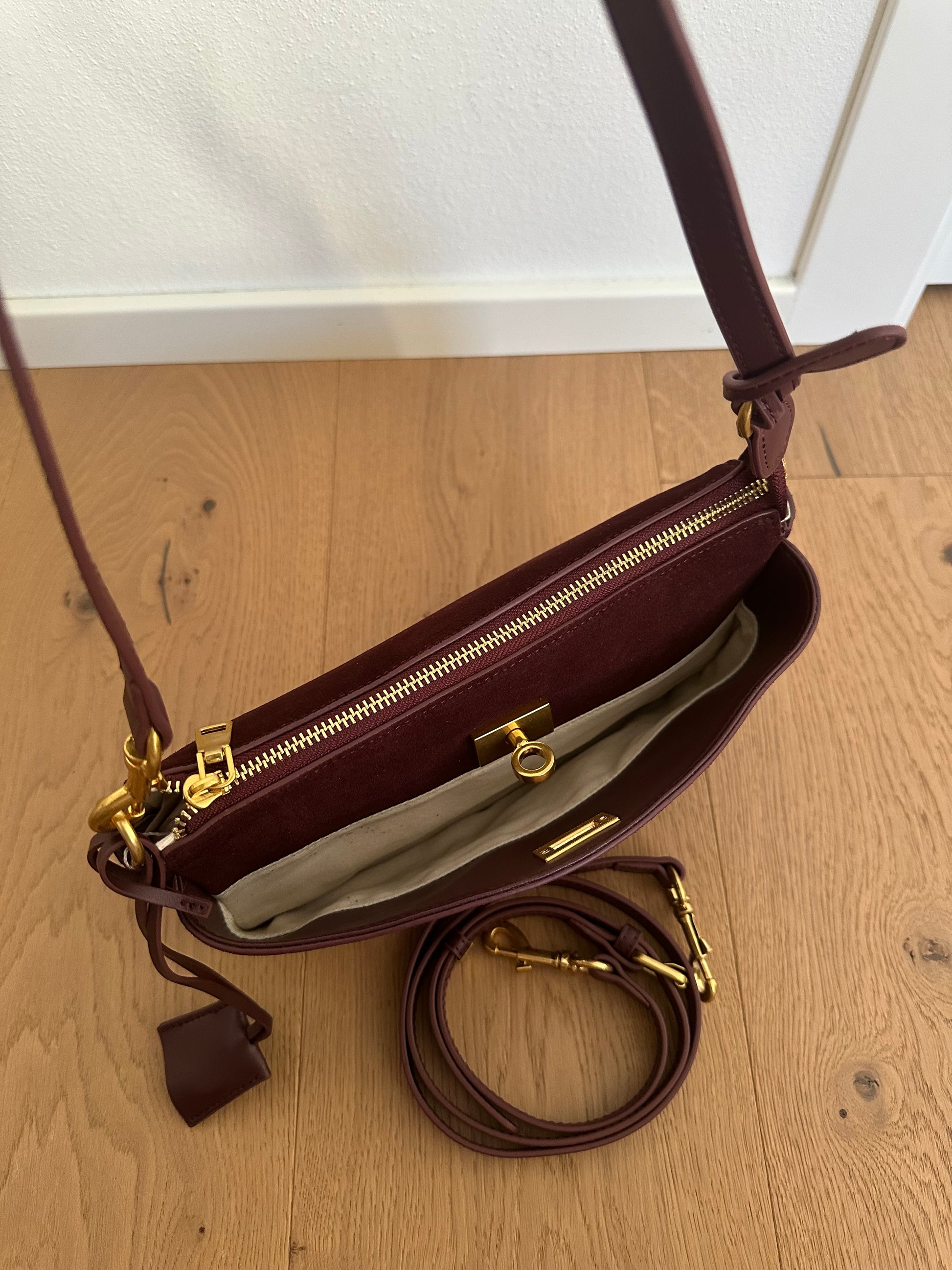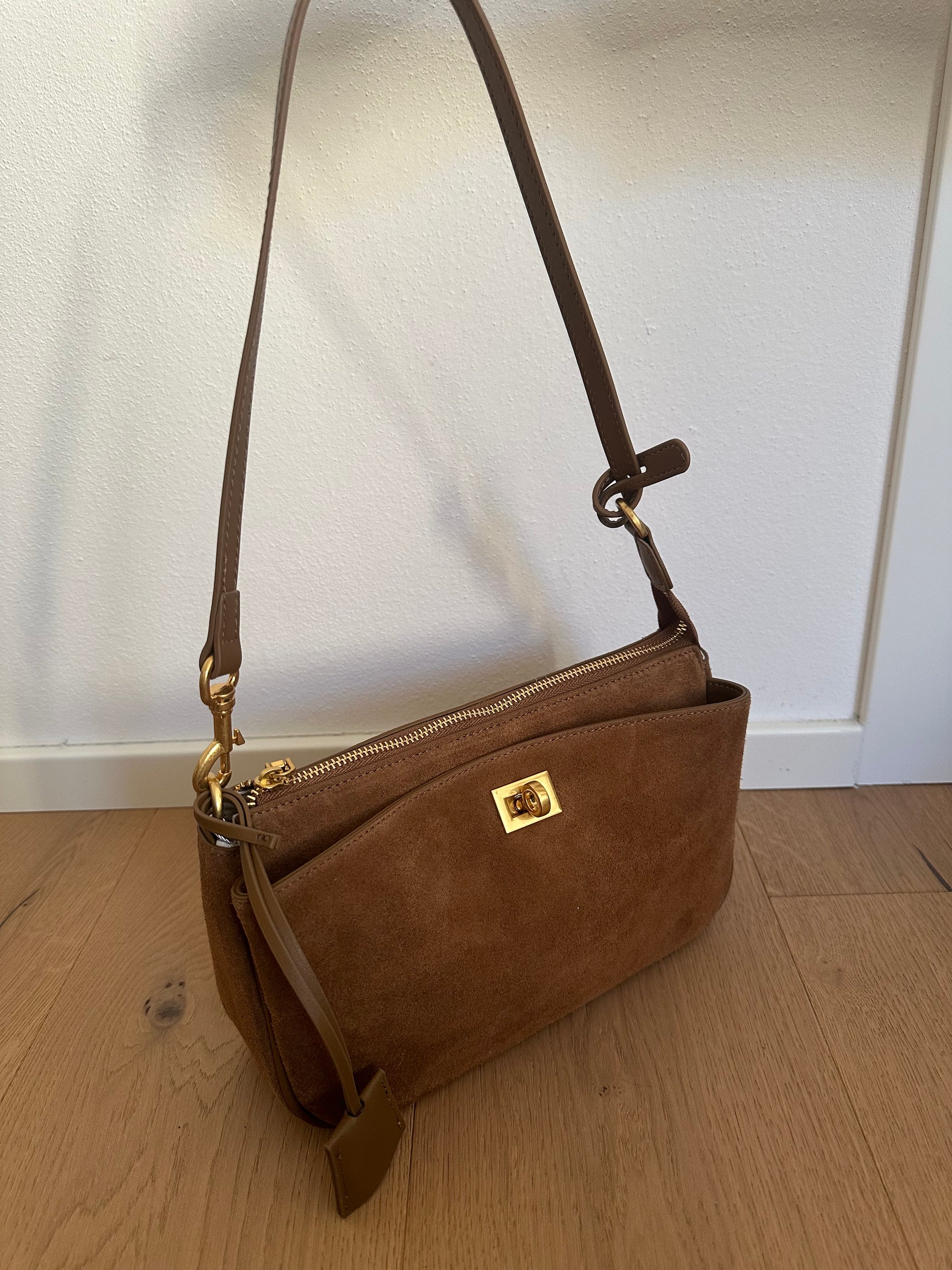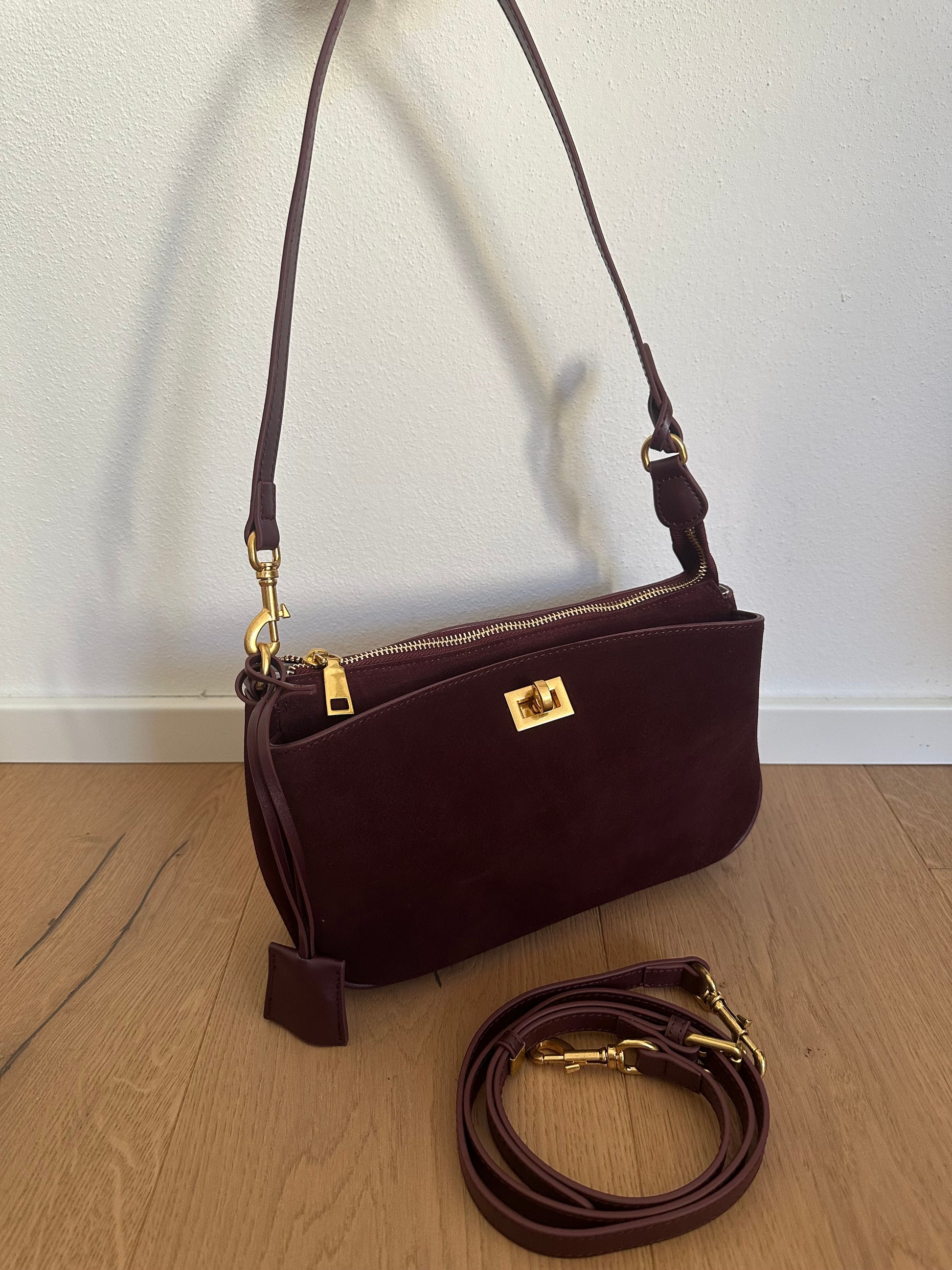 Borsa piccola in vera pelle di vitello scamosciata e rifiniture in vera pelle liscia.