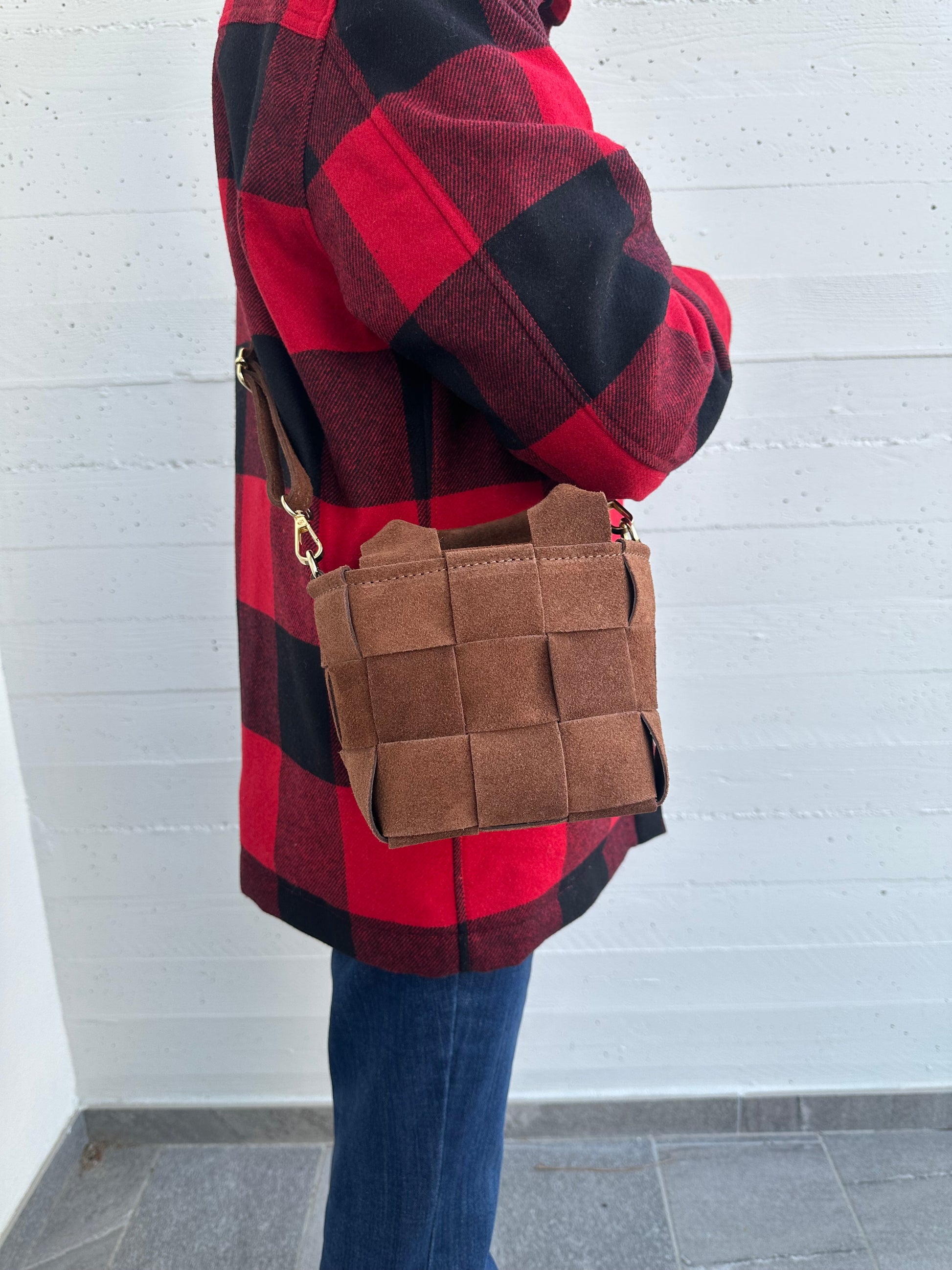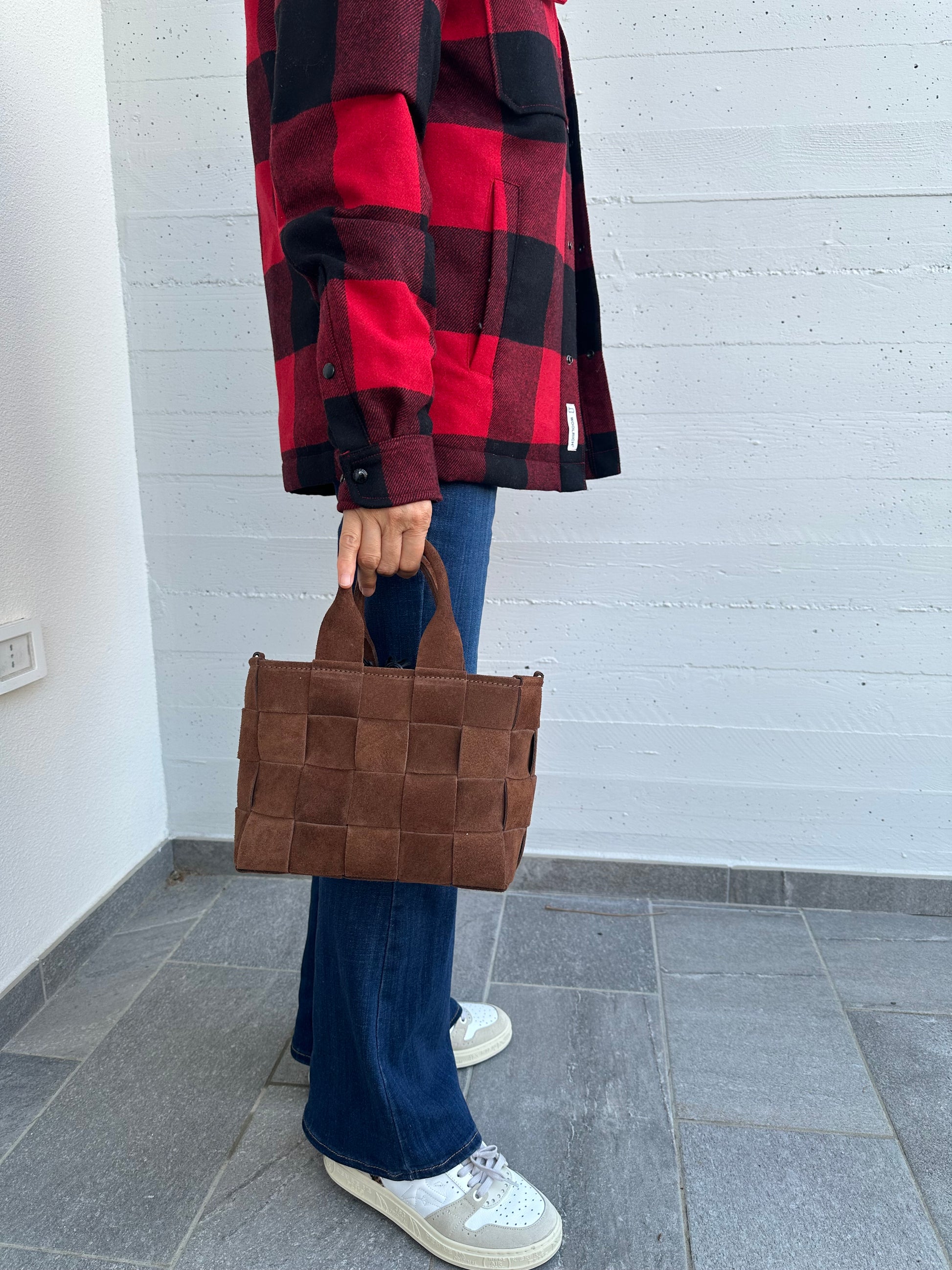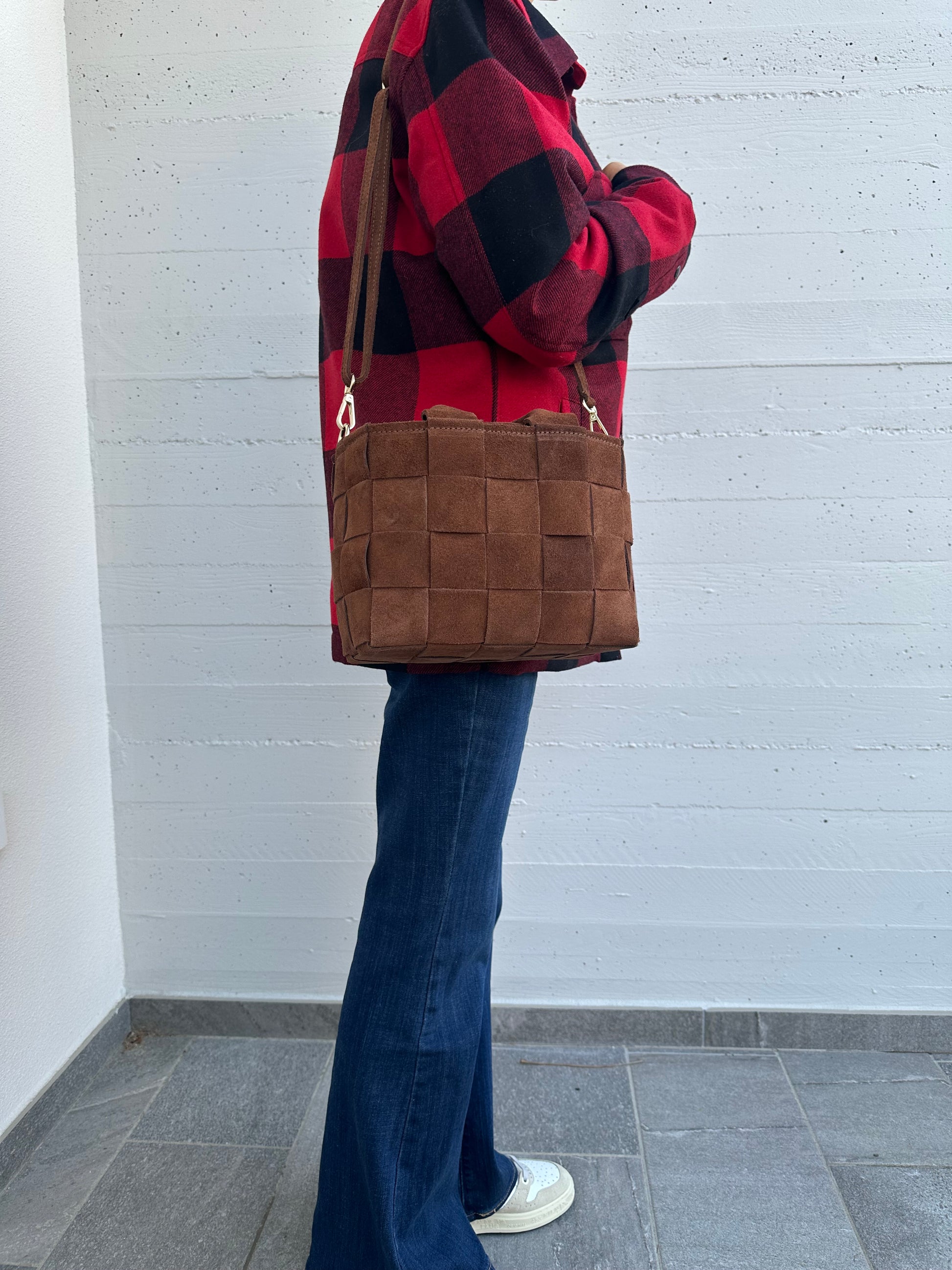 šBorsa secchiello intrecciata in vera pelle scamosciata di altissima Made in Italy.