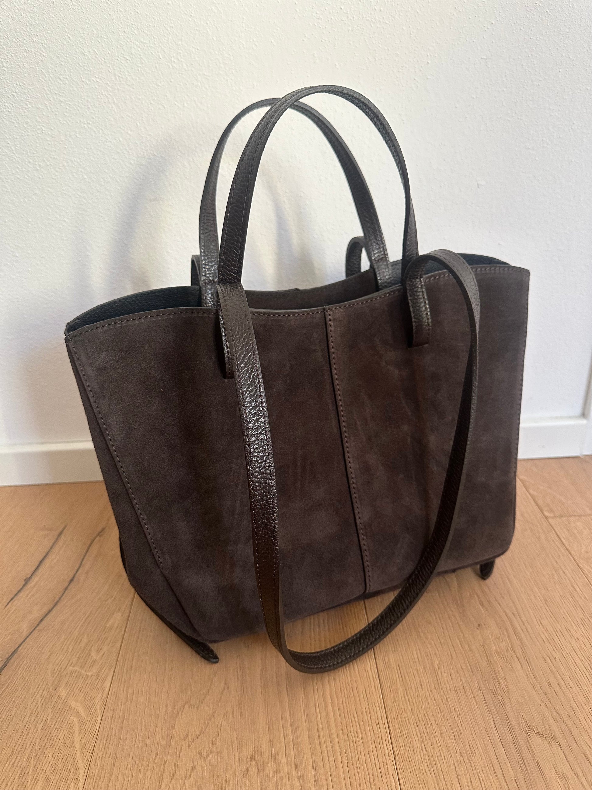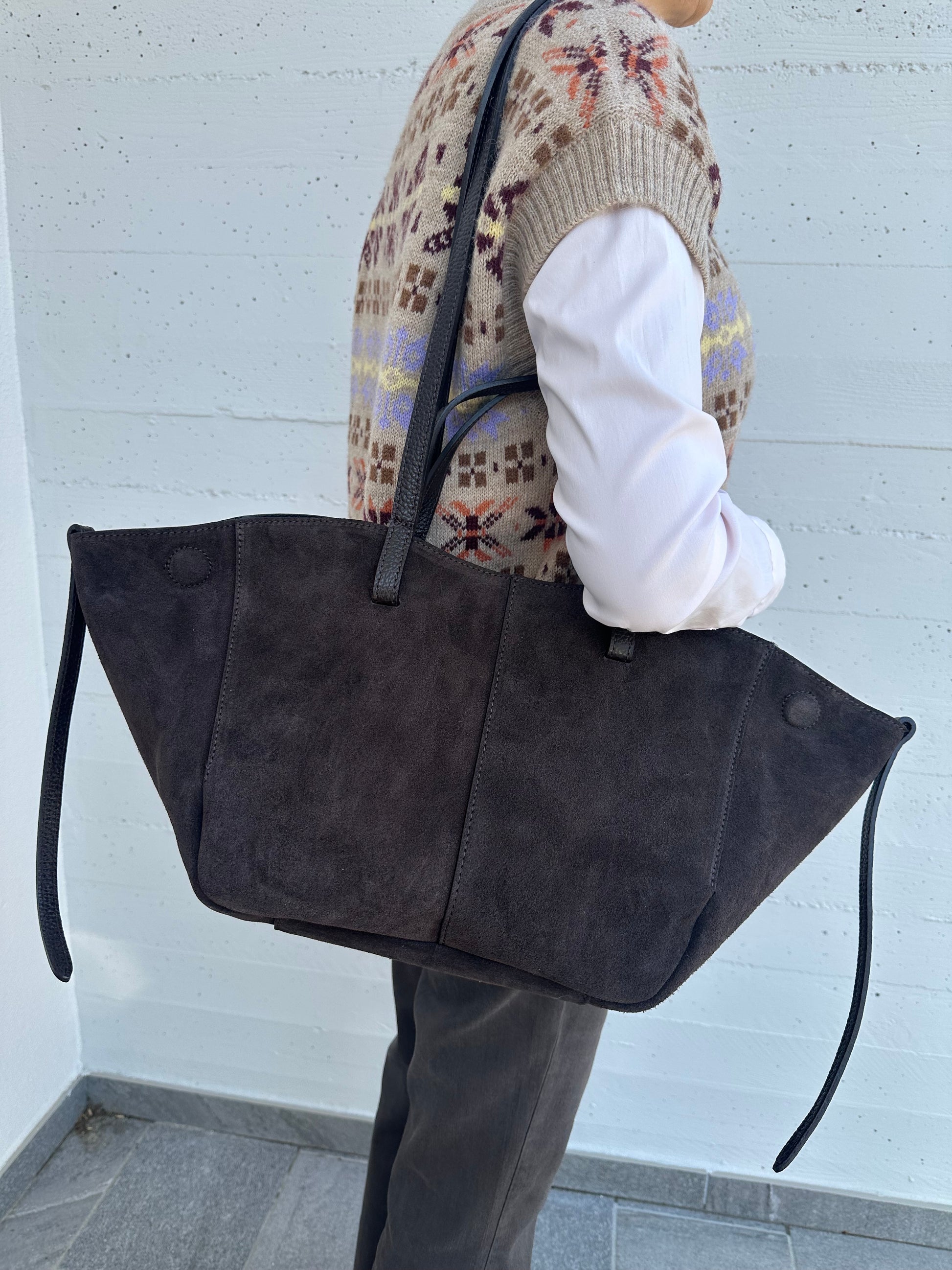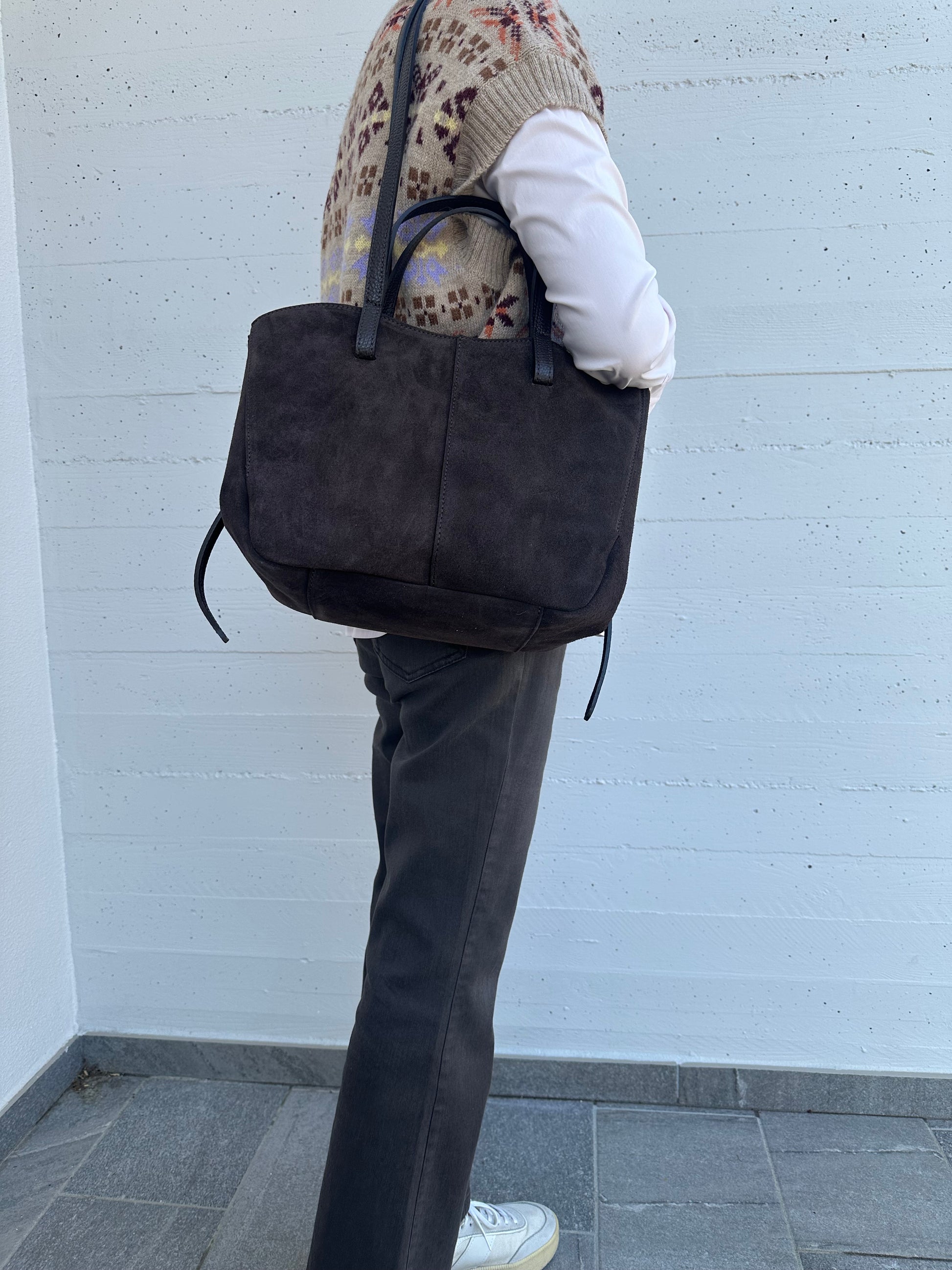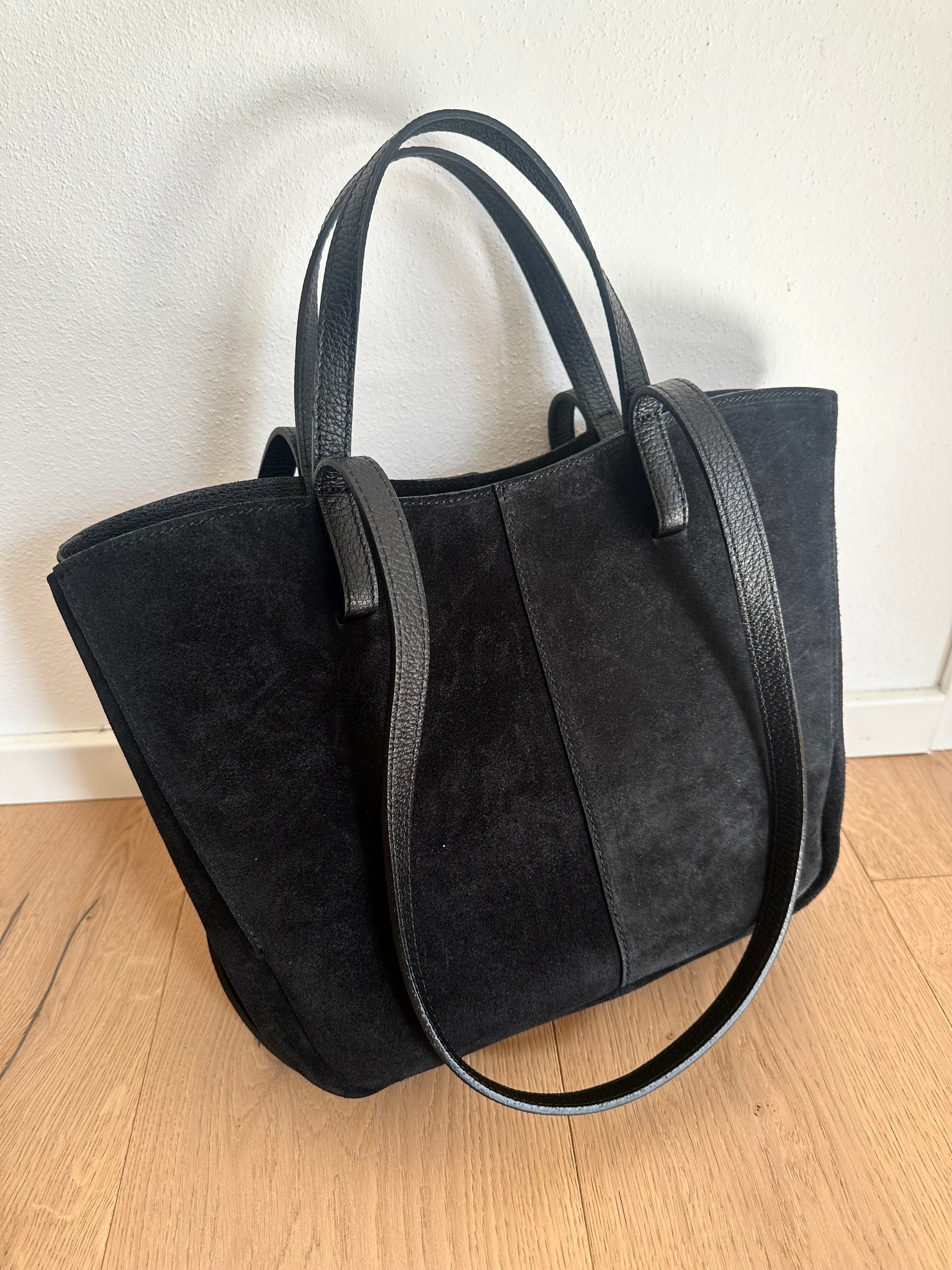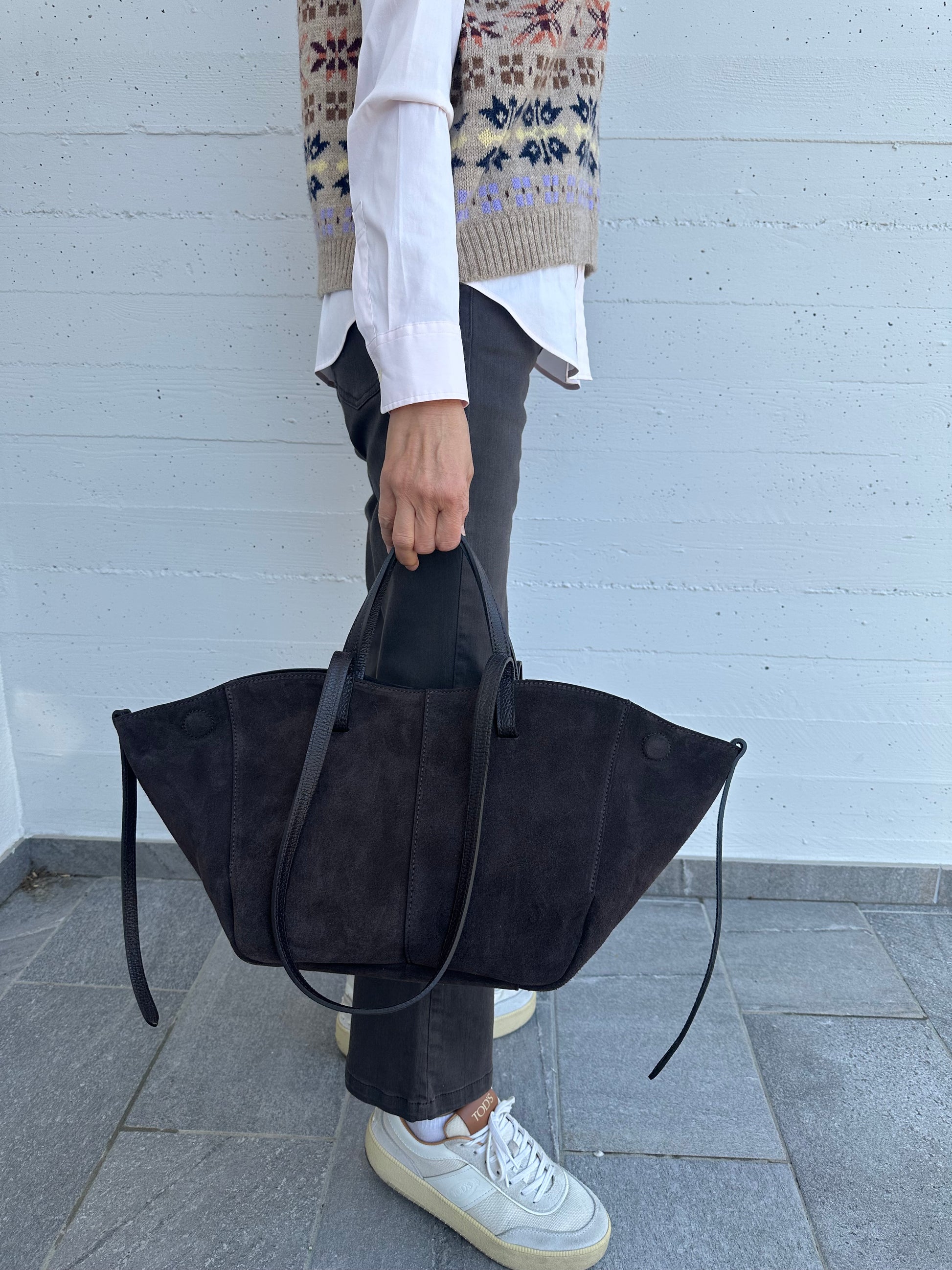 Realizzata interamente in vera pelle scamosciata/ suede e rifiniture in vera pelle dollaro Made in Italy, puo essere usata in due modi a seconda di come viene chiusa la borsa con le sue due calamite laterali.