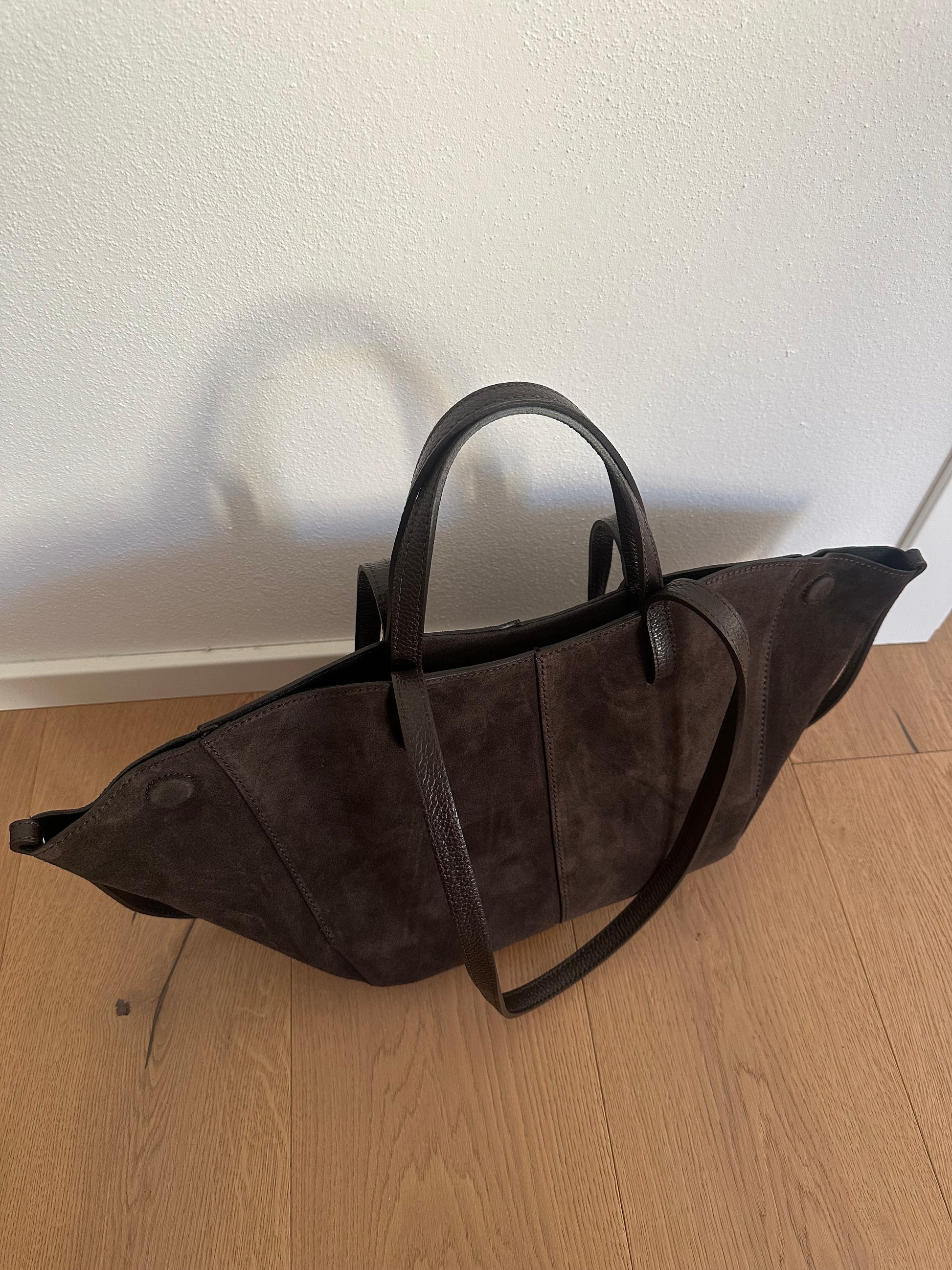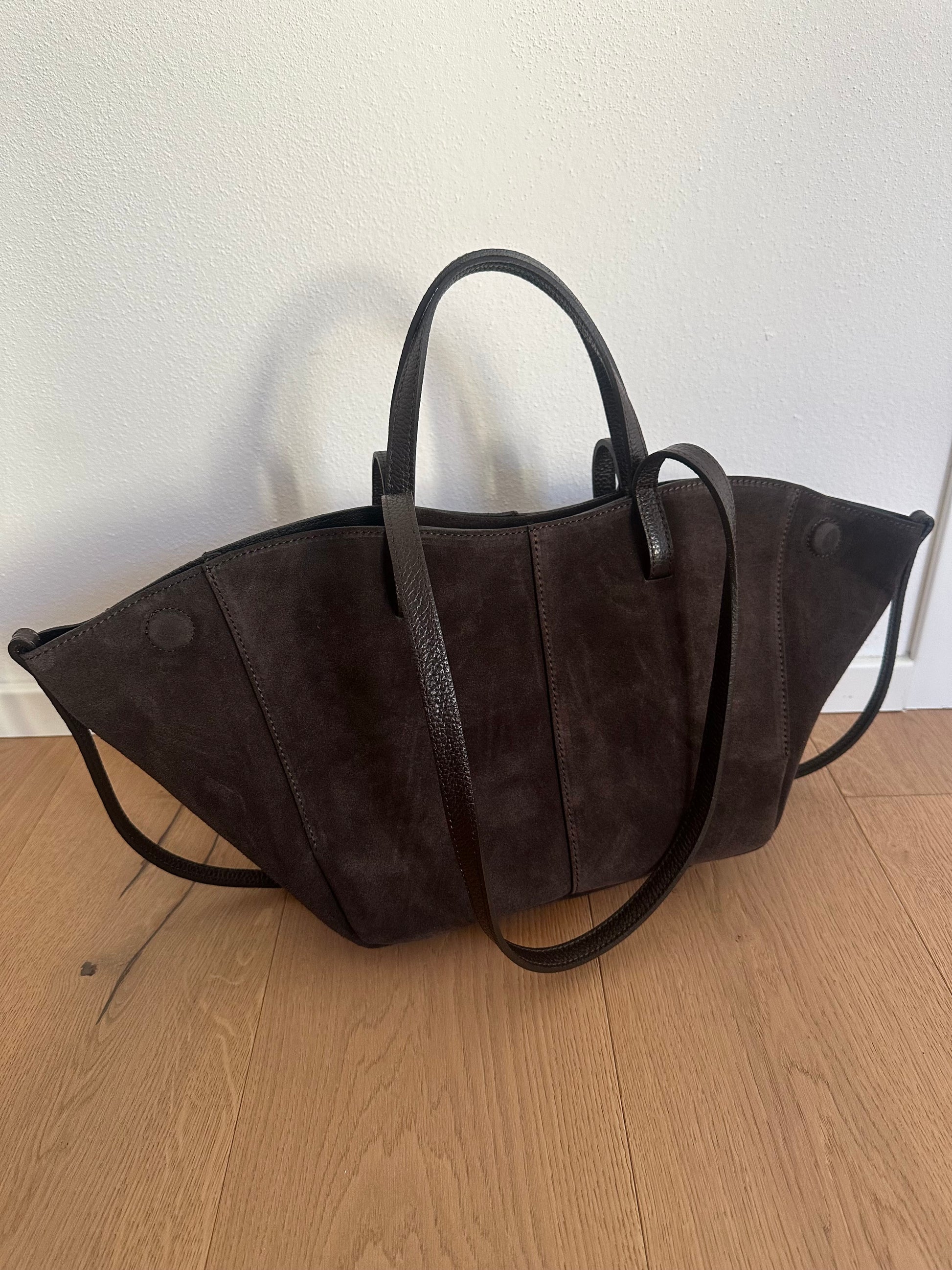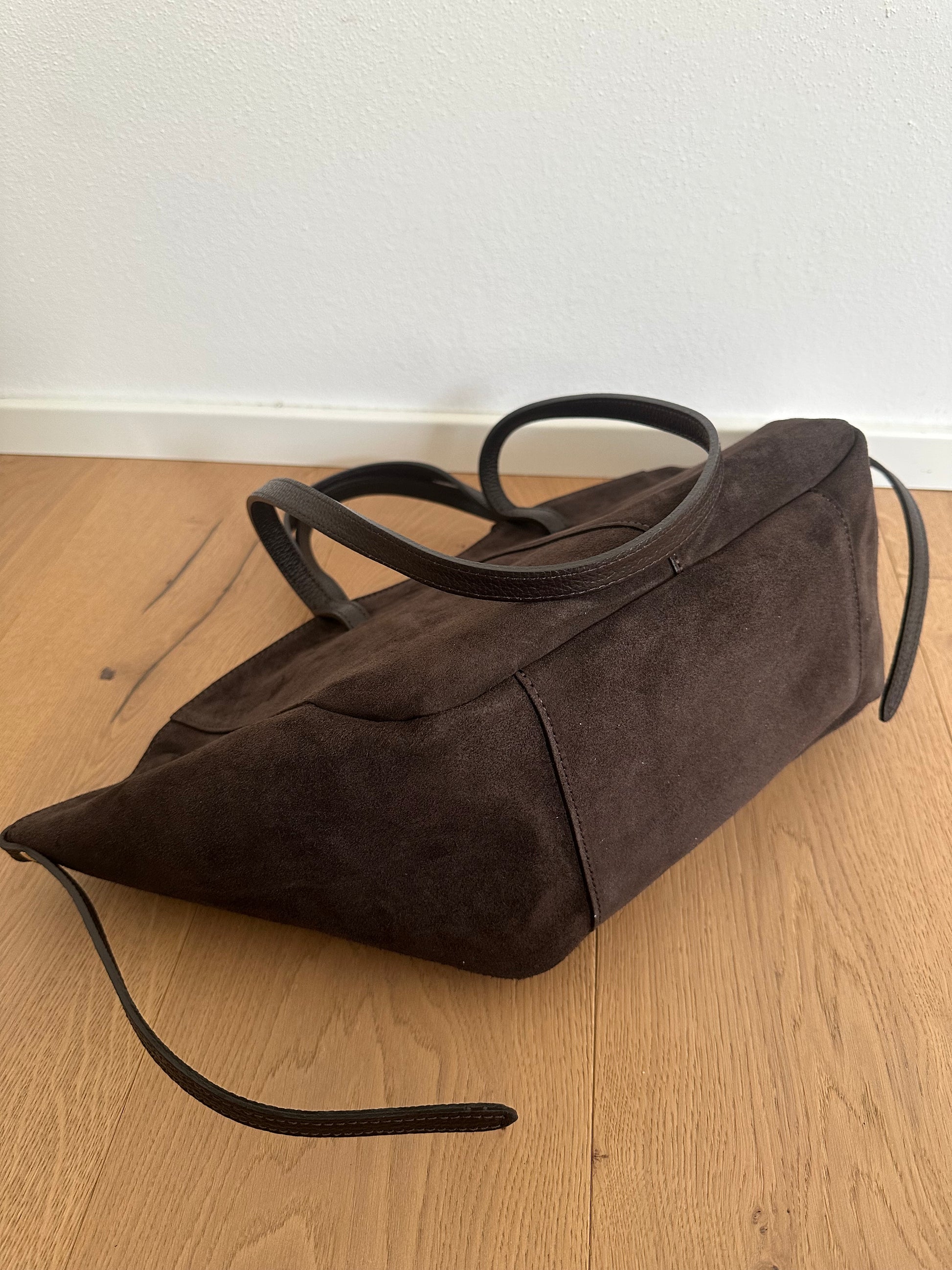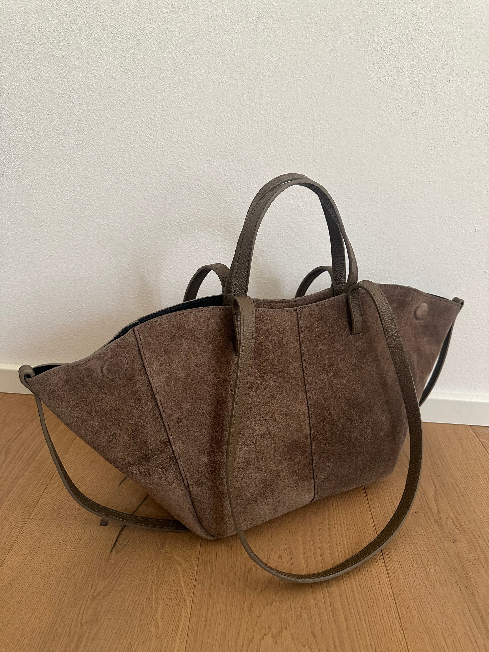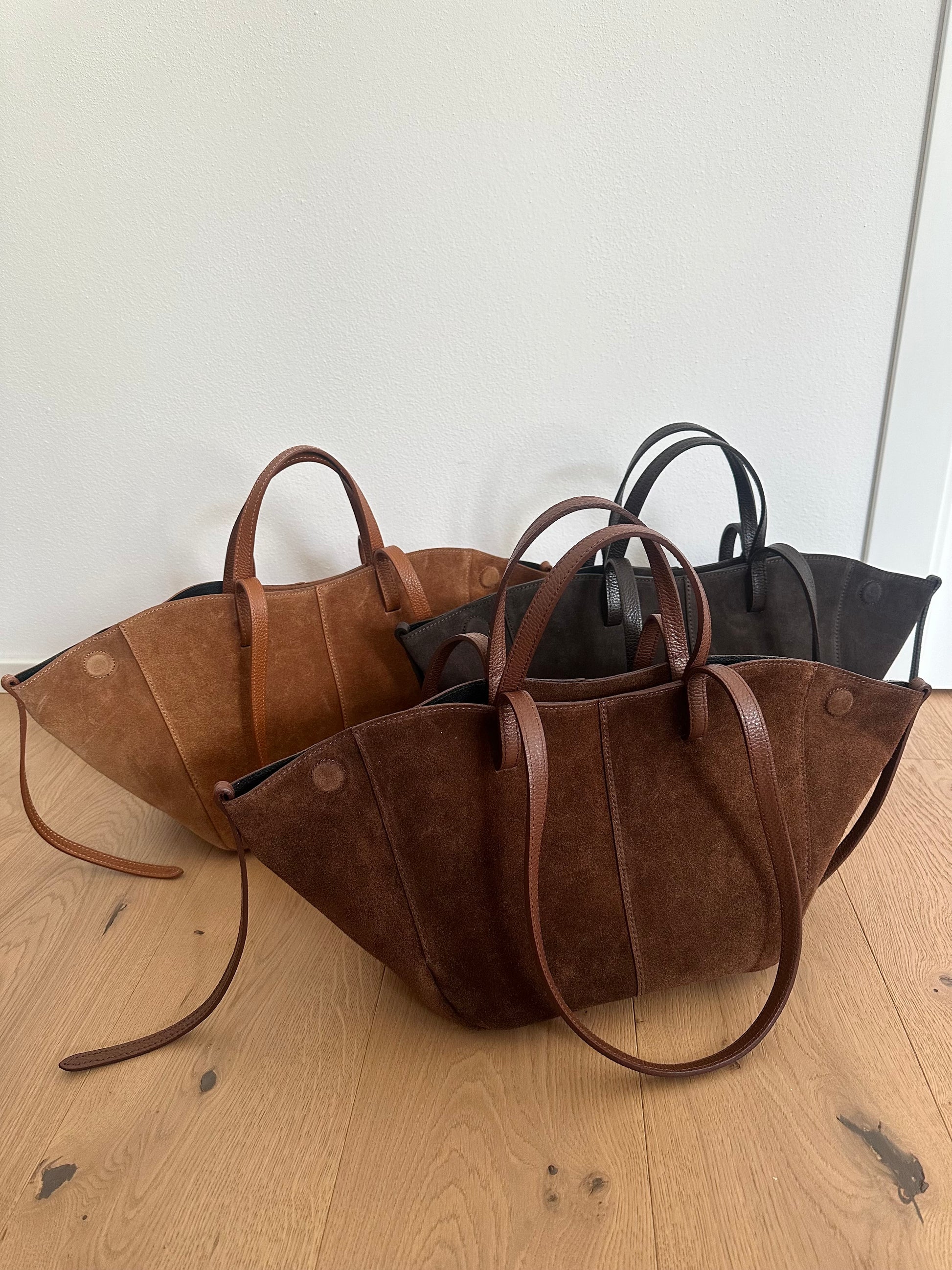 Realizzata interamente in vera pelle scamosciata/ suede e rifiniture in vera pelle dollaro Made in Italy, puo essere usata in due modi a seconda di come viene chiusa la borsa con le sue due calamite laterali.
