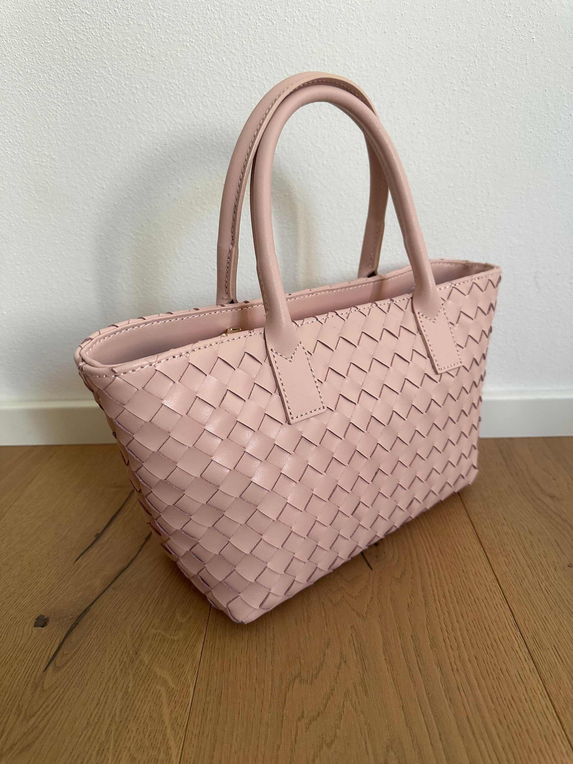 Doppio manico per essere portata a mano, interno foderato in tessuto con tasca interna con cerniera.