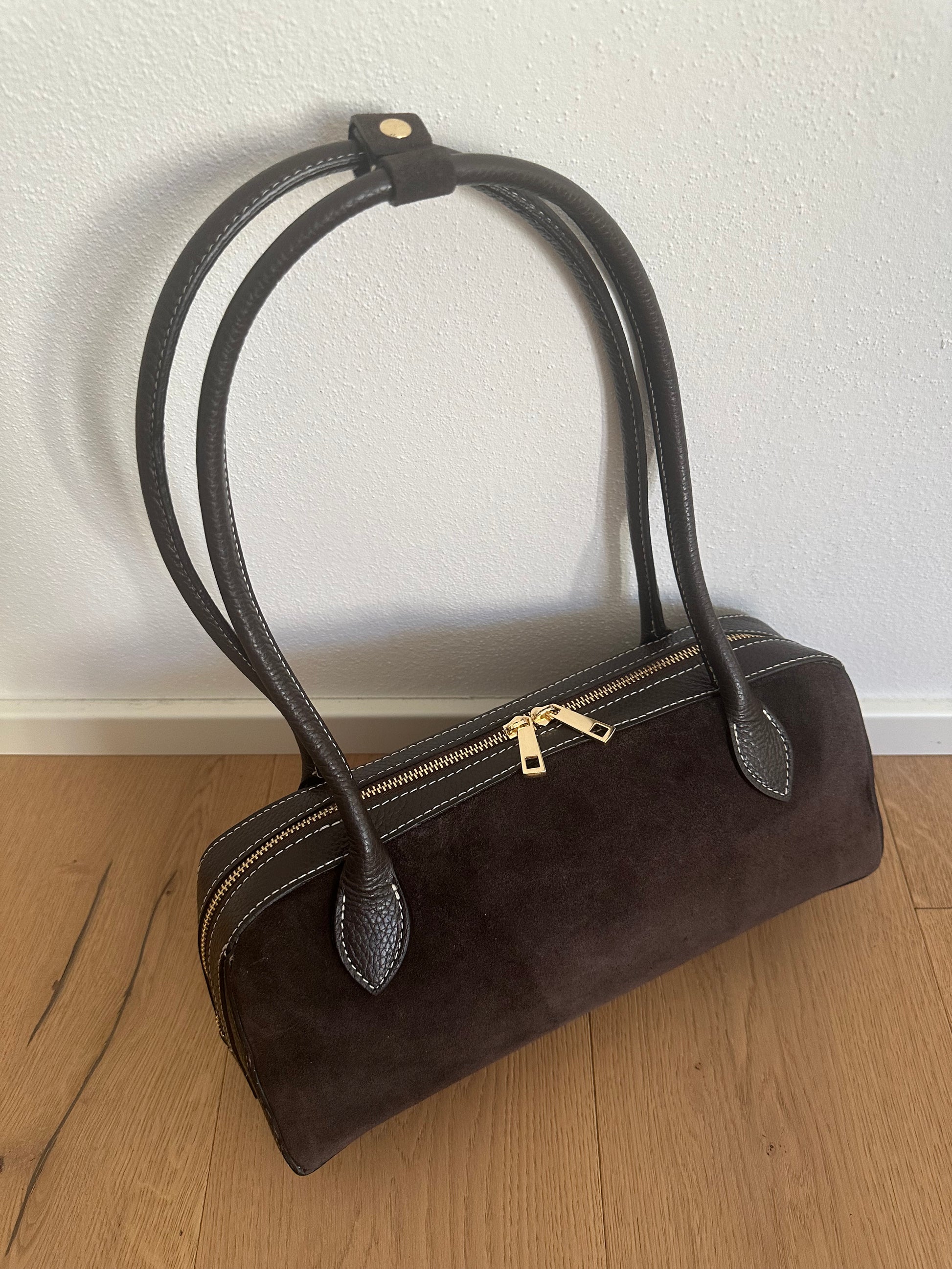 Borsa in vera pelle scamosciata e rifiniture in vera pelle realizzata in Italia.