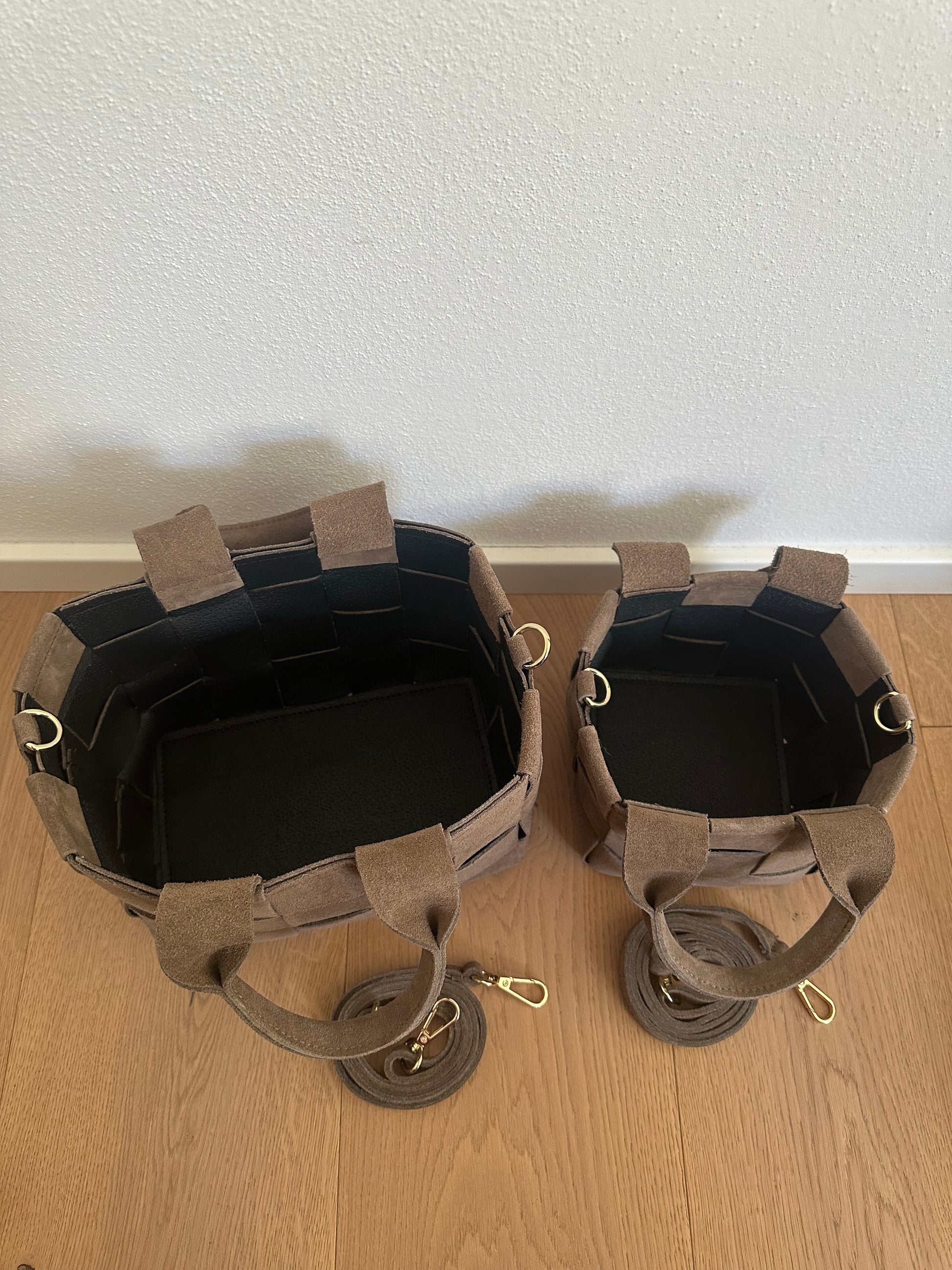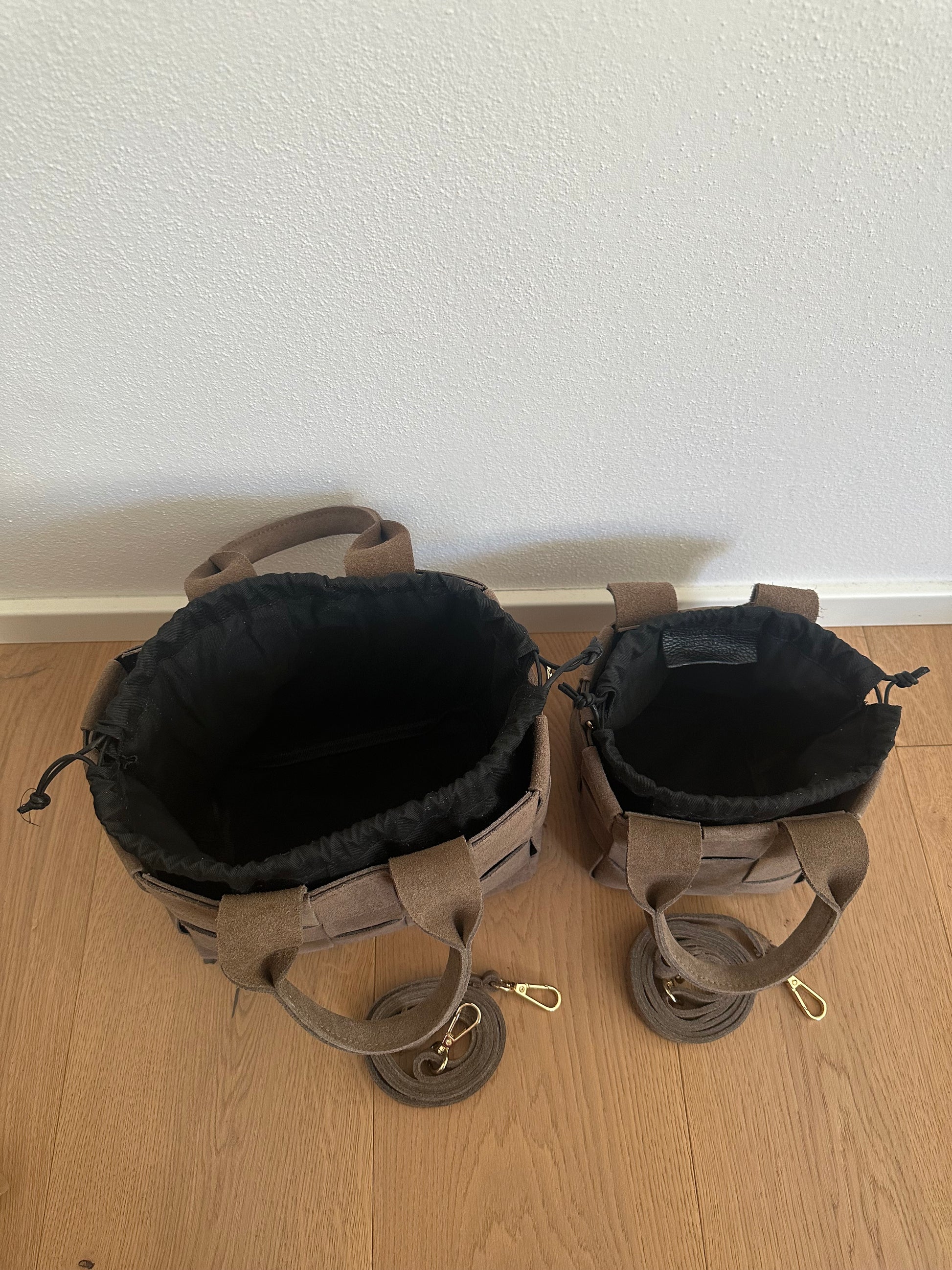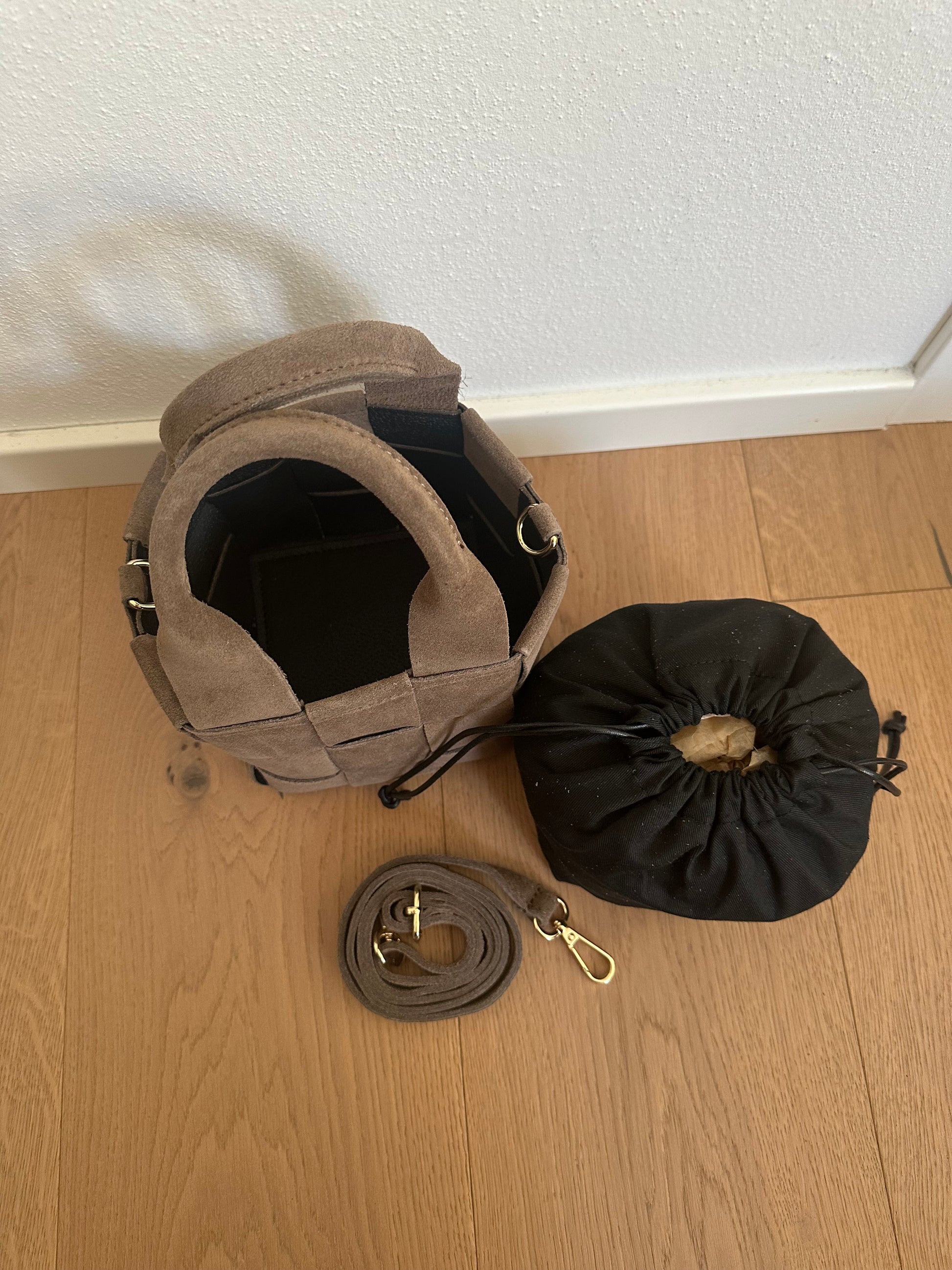 🍁Borsa secchiello intrecciata in vera pelle scamosciata di altissima Made in Italy.