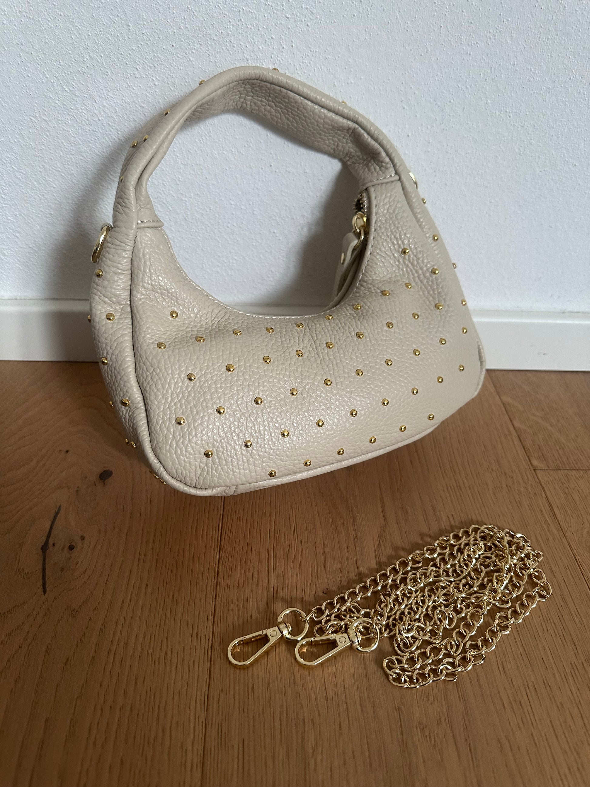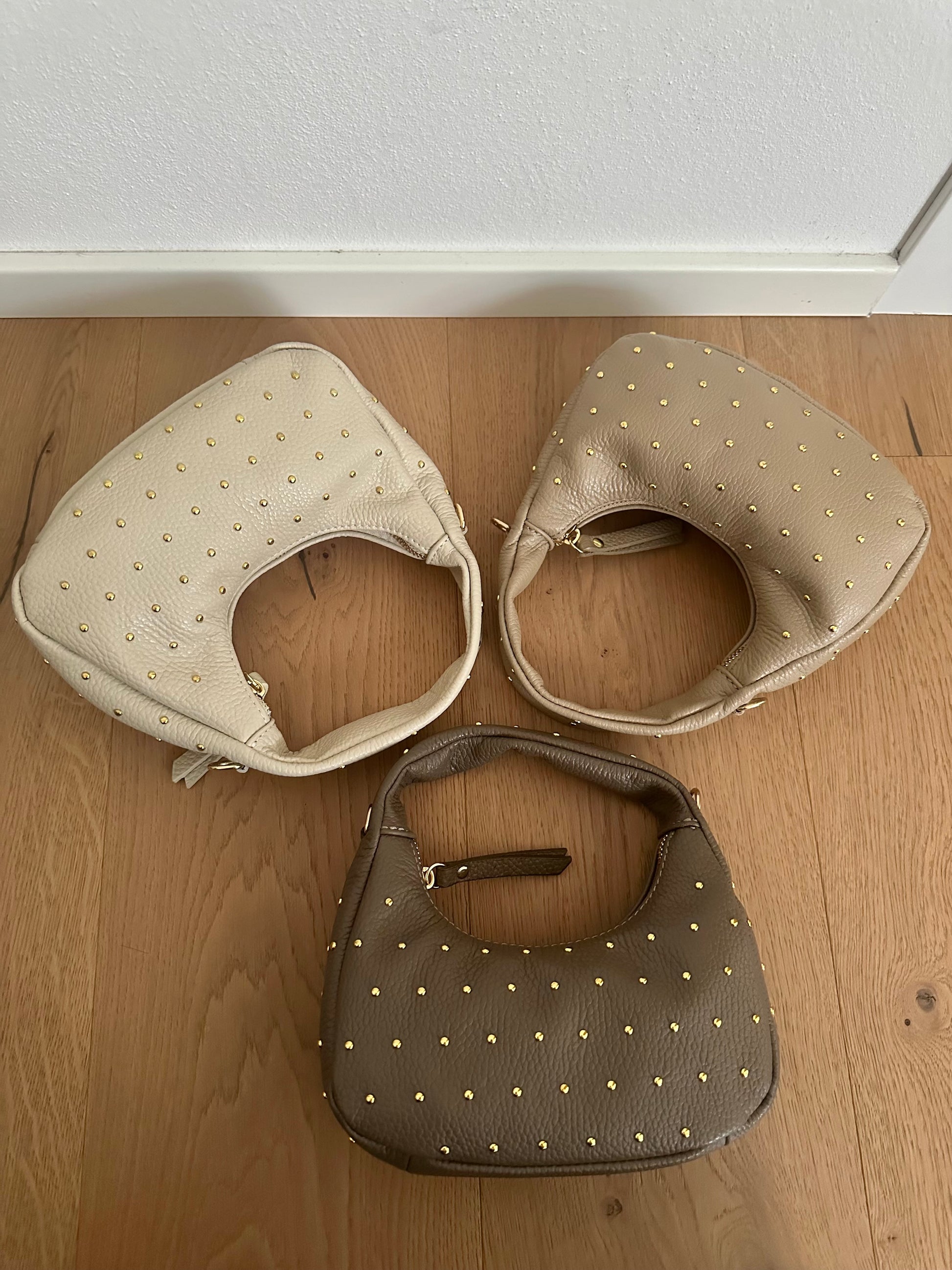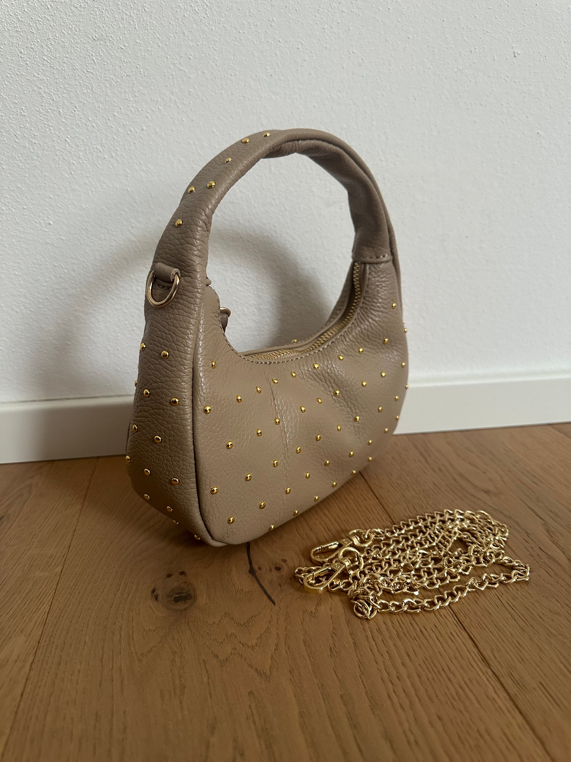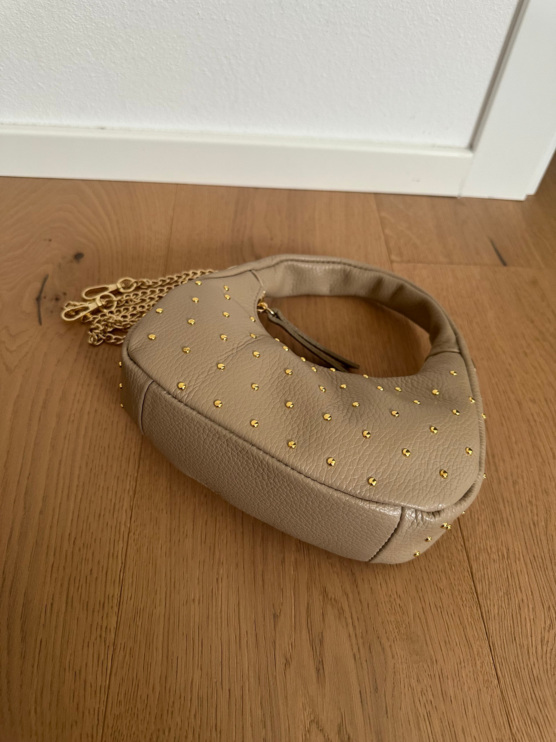 ✨ Mini Hobo bag in vera pelle Made in Italy, con borchie color oro.
