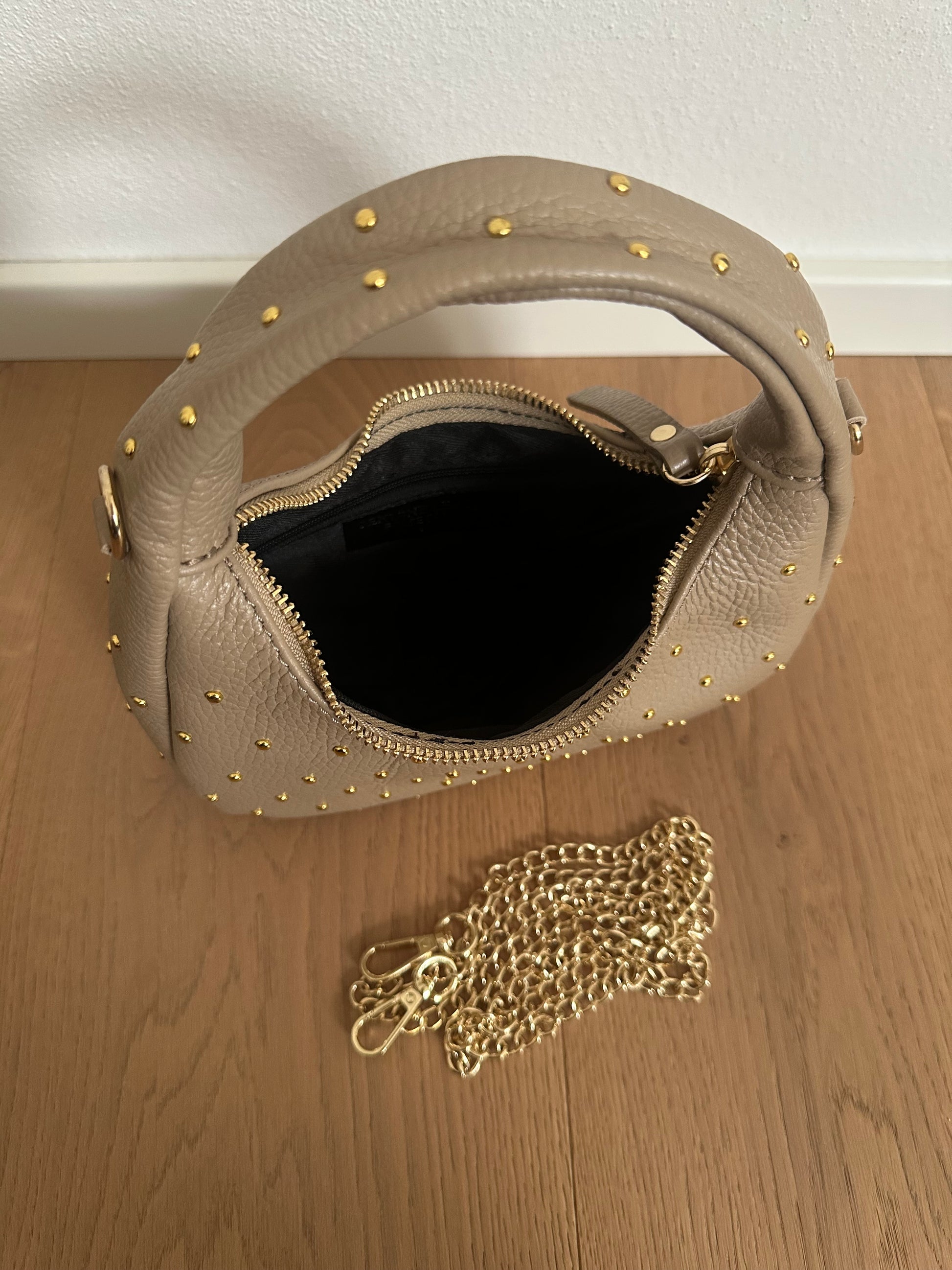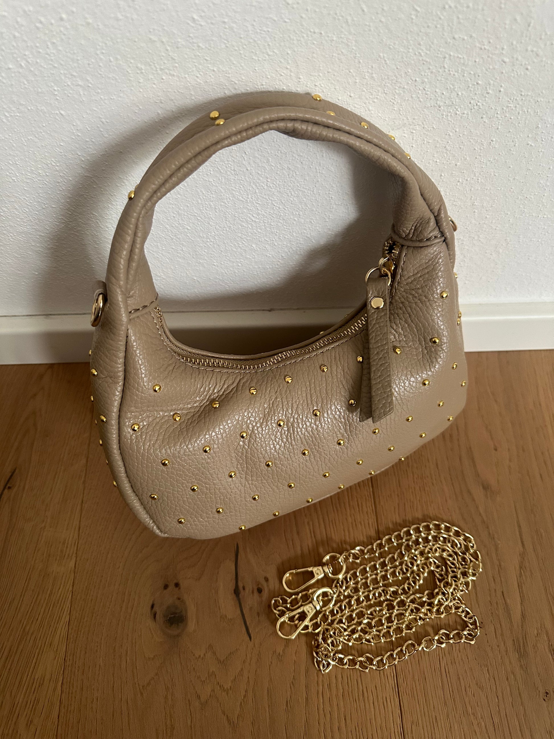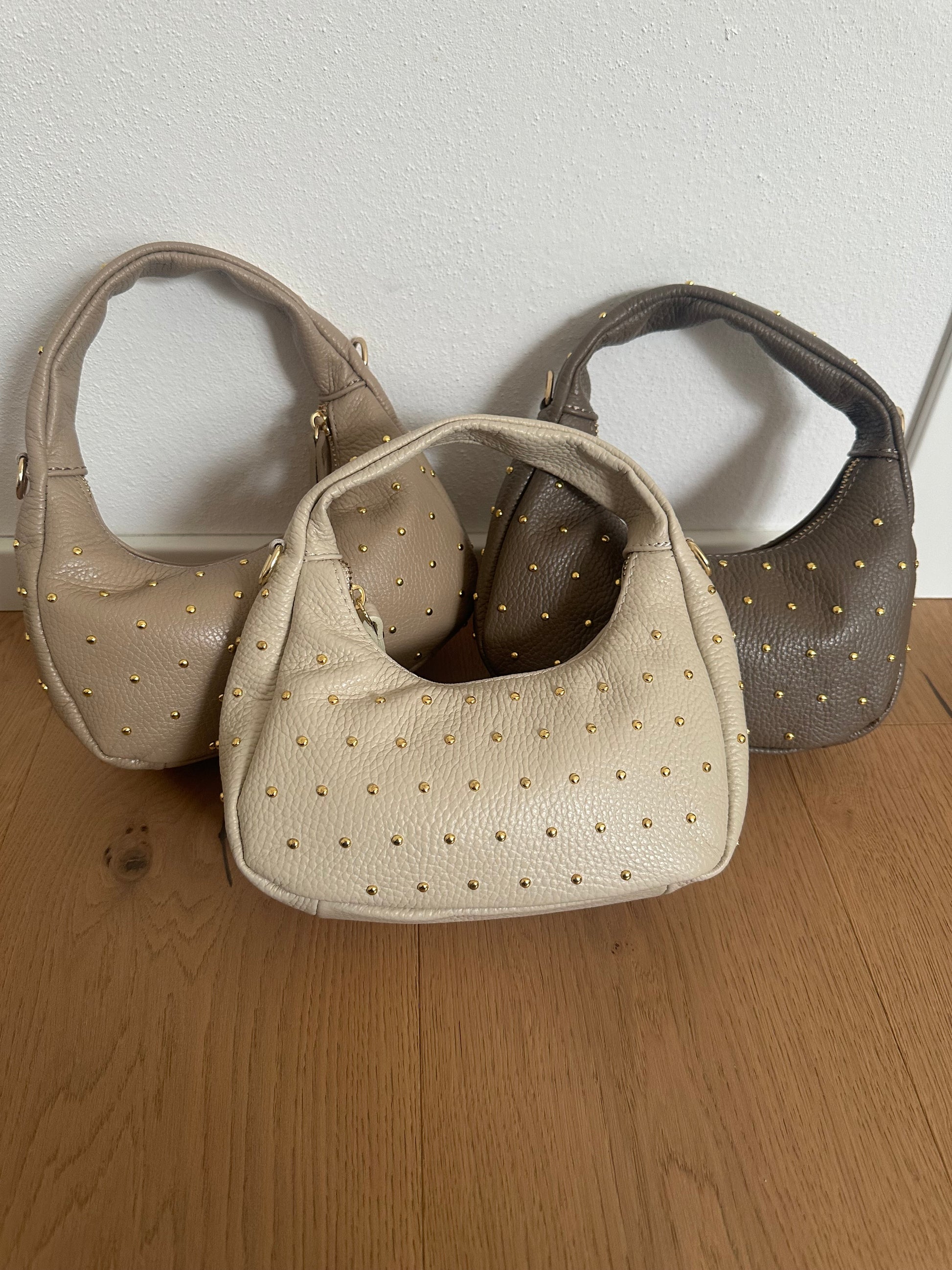 ✨ Mini Hobo bag in vera pelle Made in Italy, con borchie color oro.