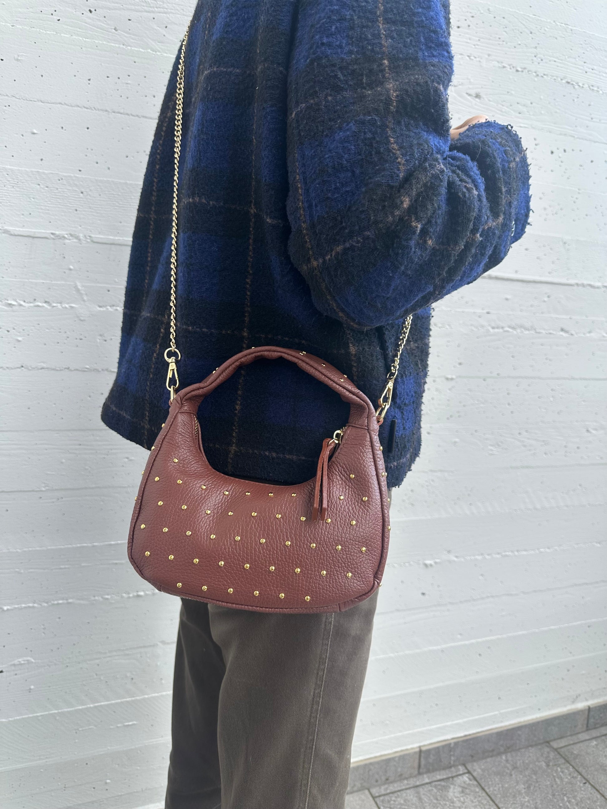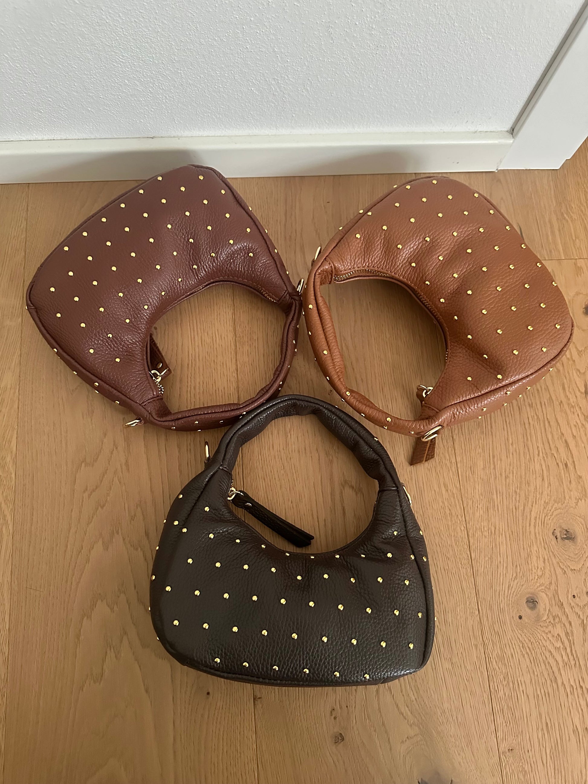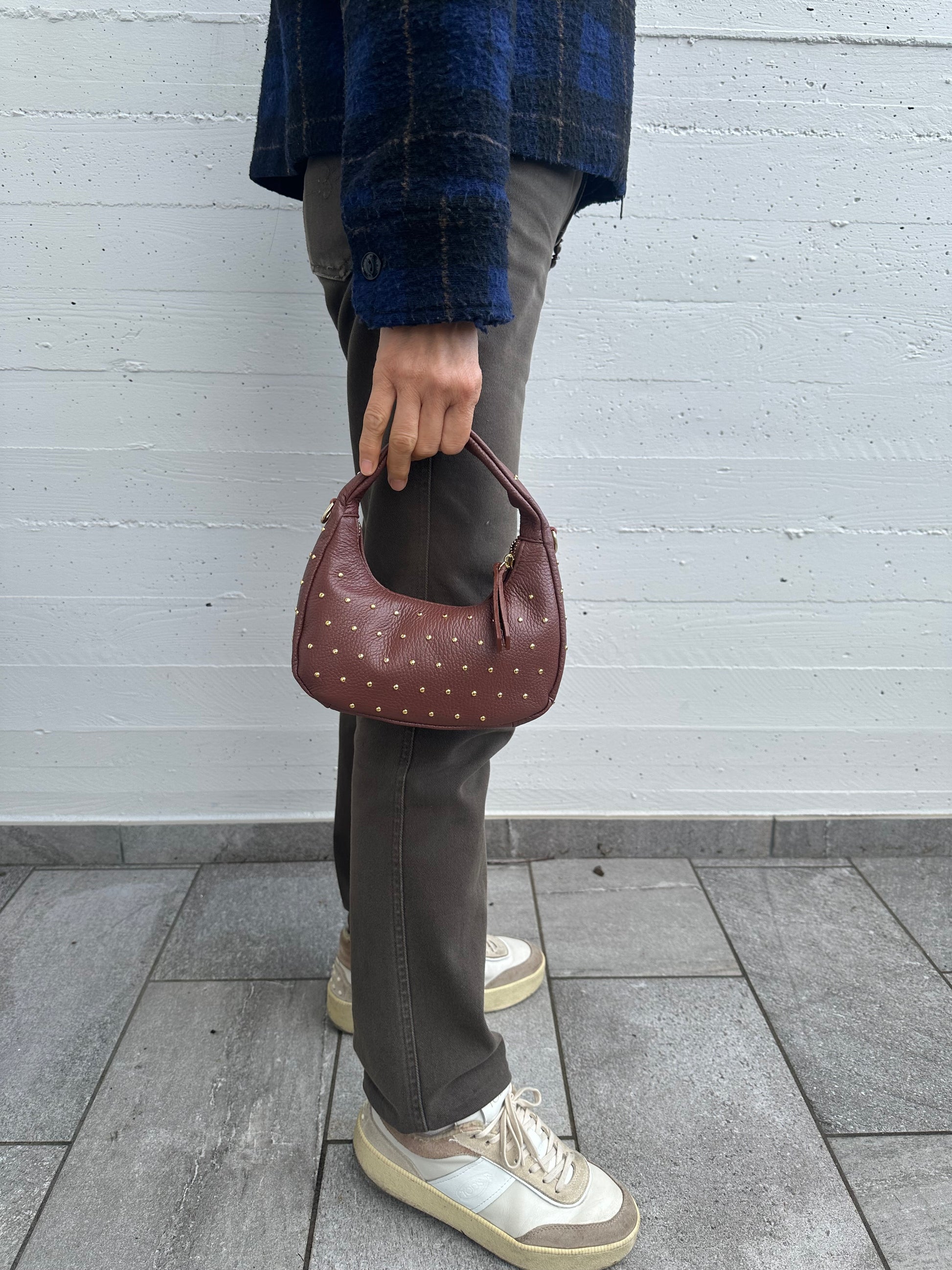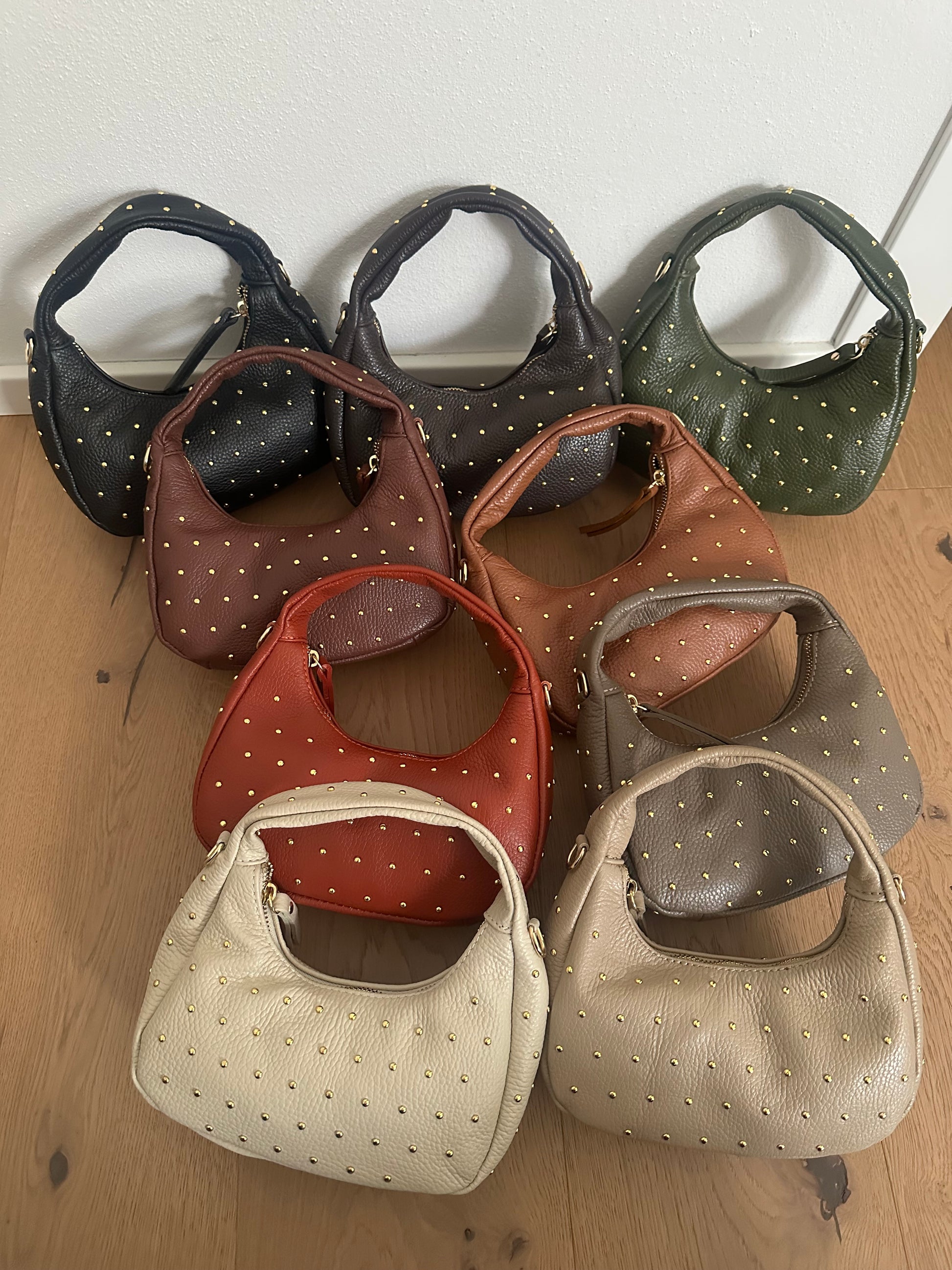 ✨ Mini Hobo bag in vera pelle Made in Italy, con borchie color oro.