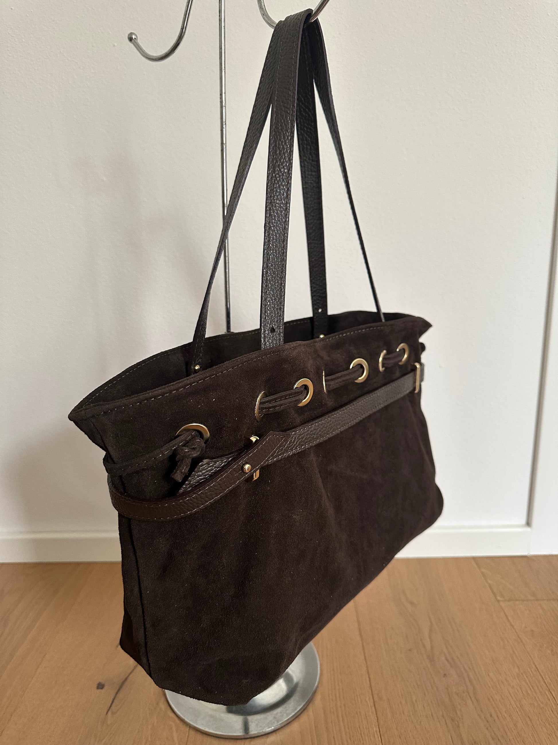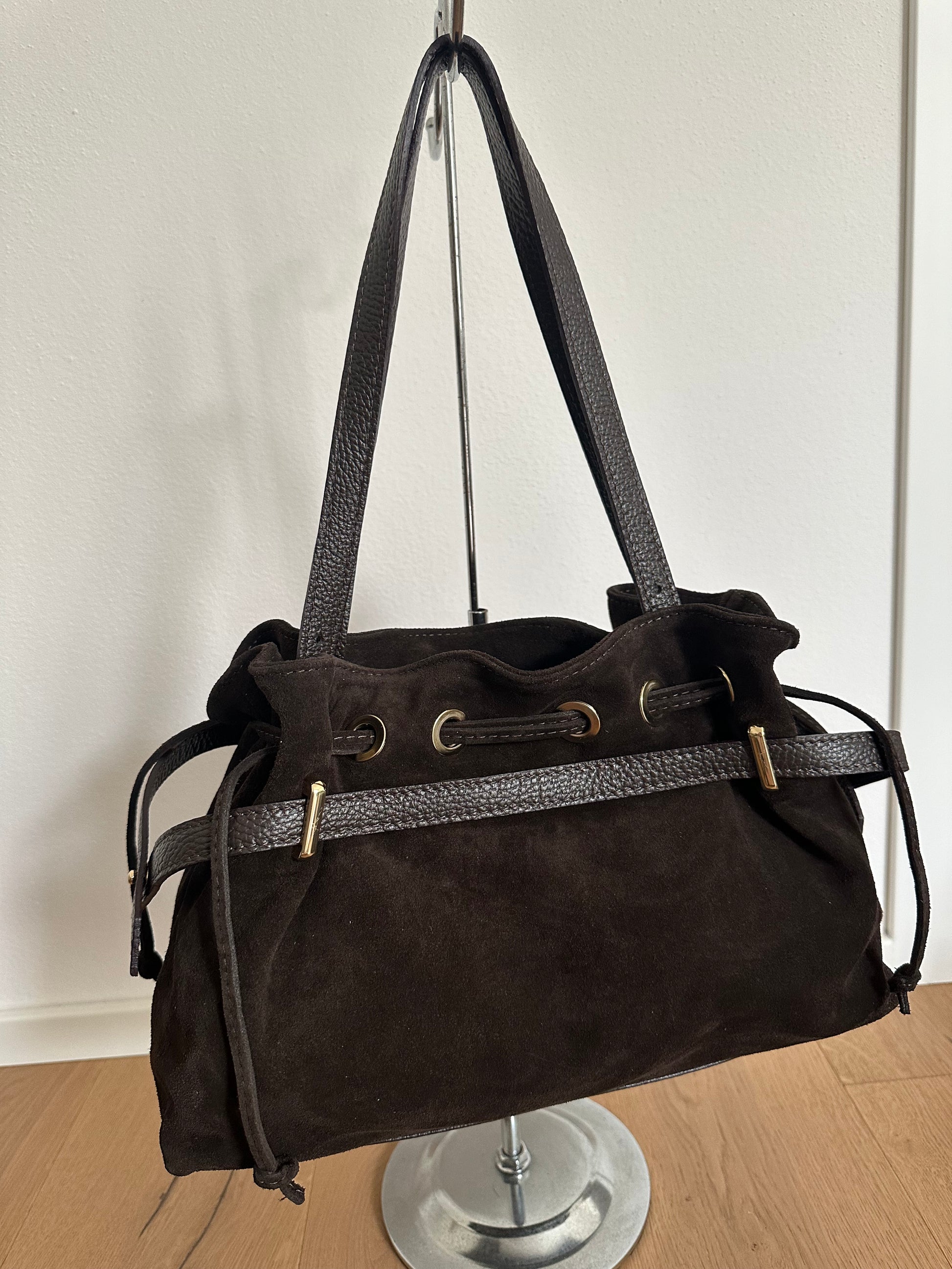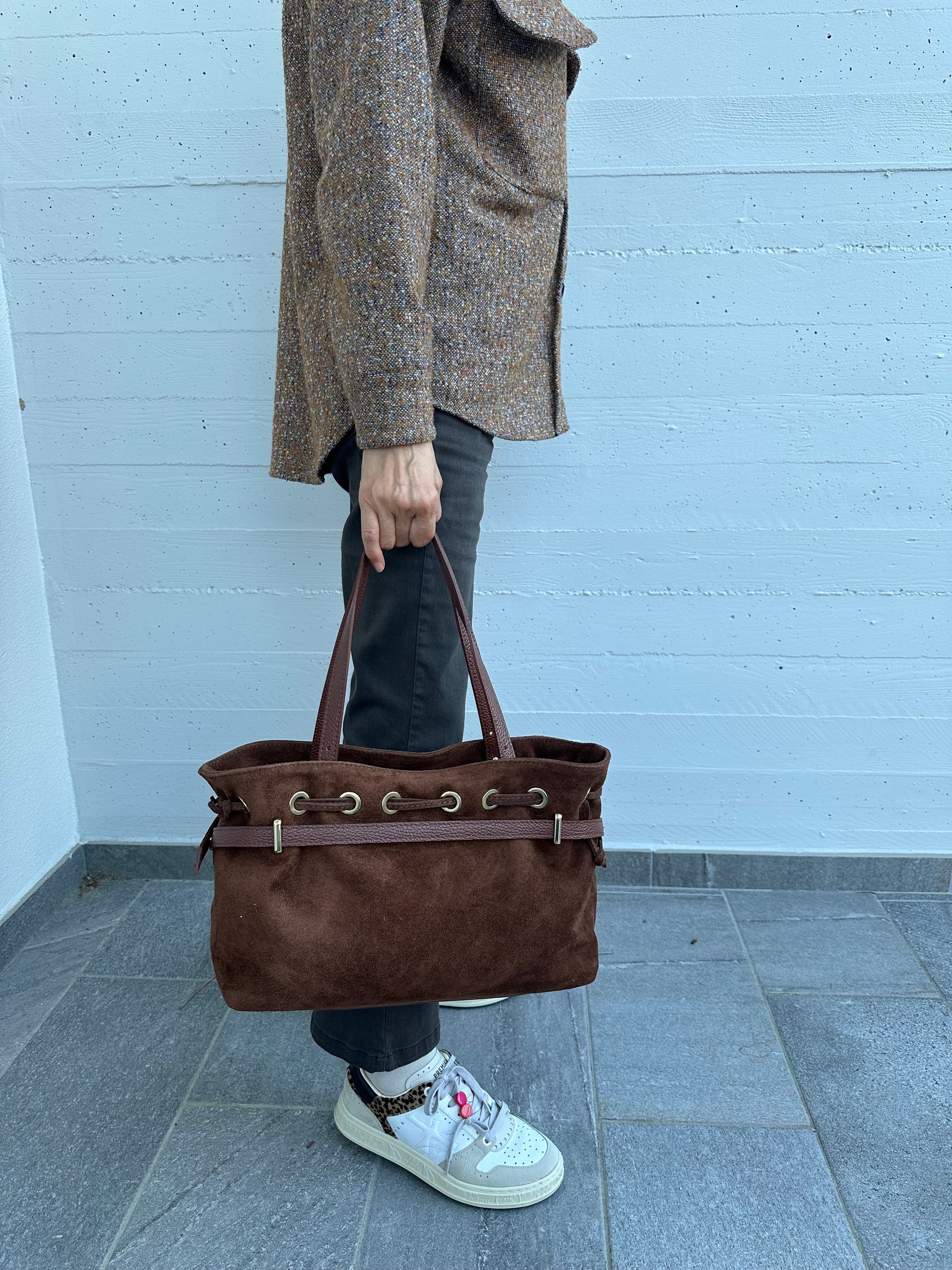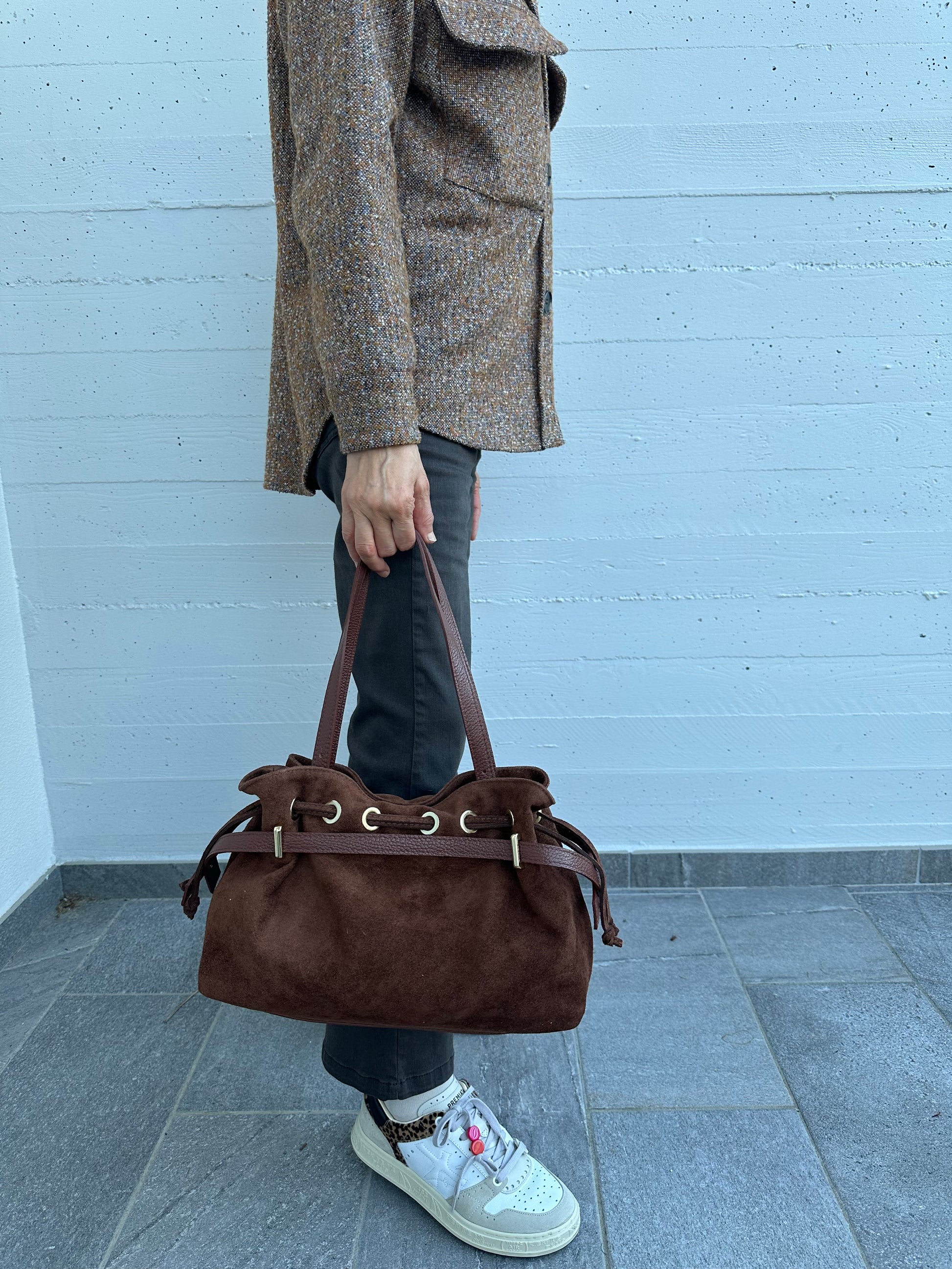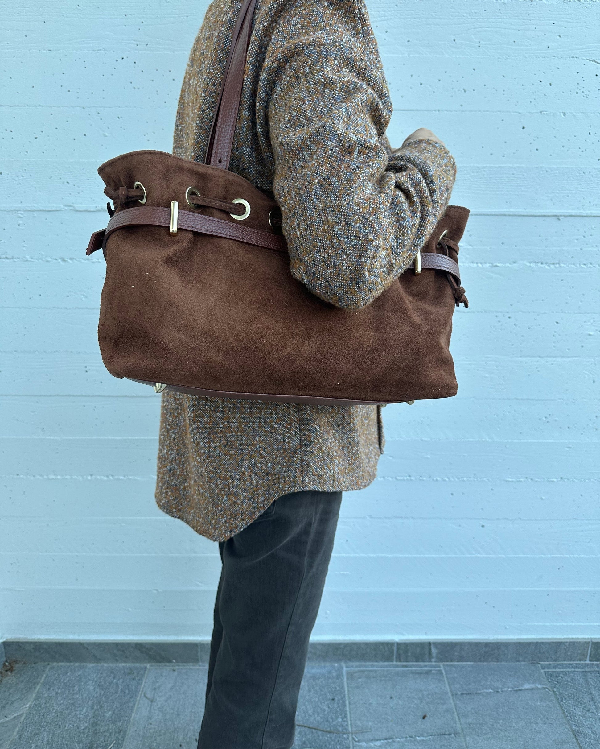 Borsa a spalla in vera pelle scamosciata con rifiniture in vera pelle dollaro Made in Italy.