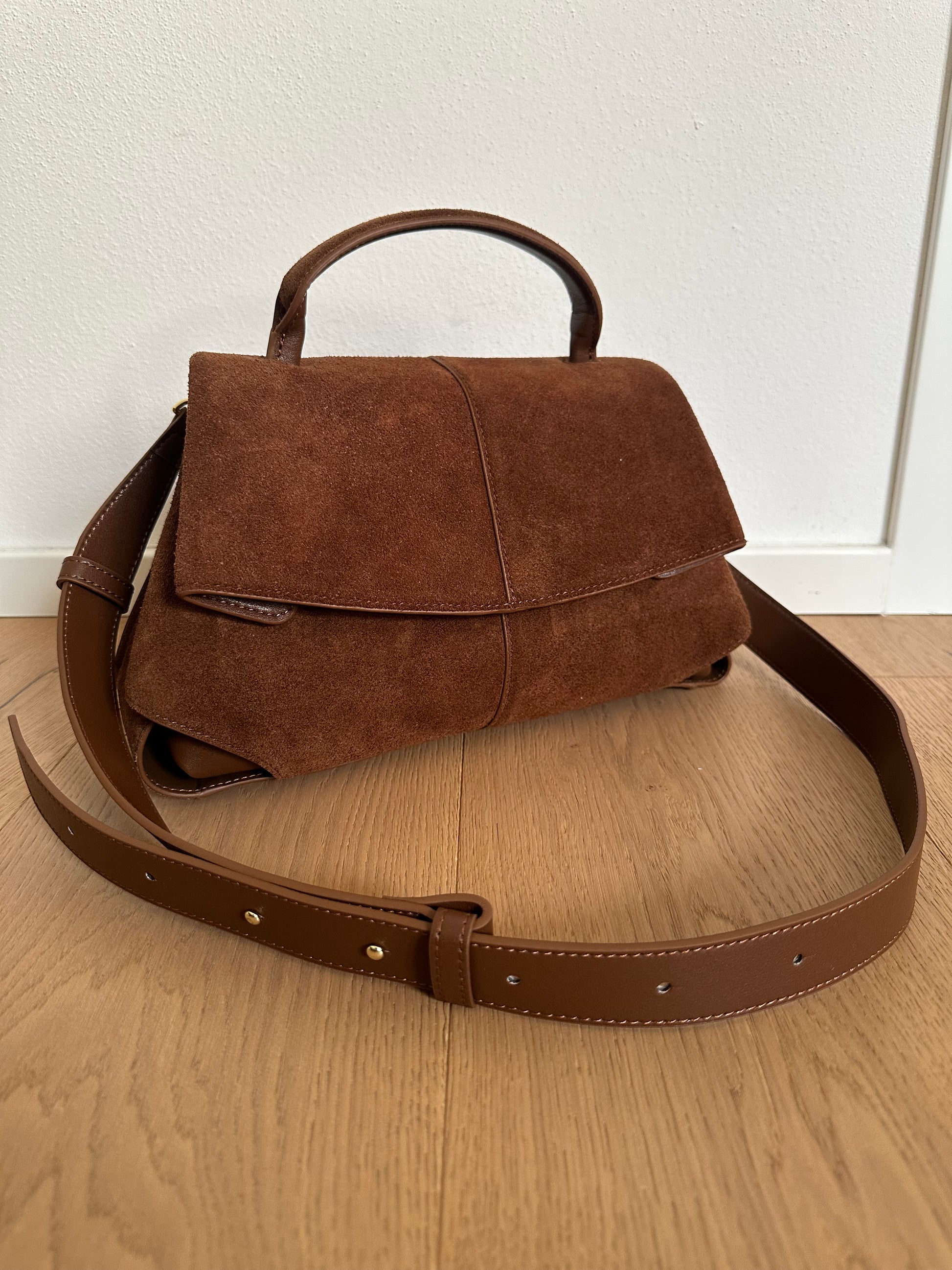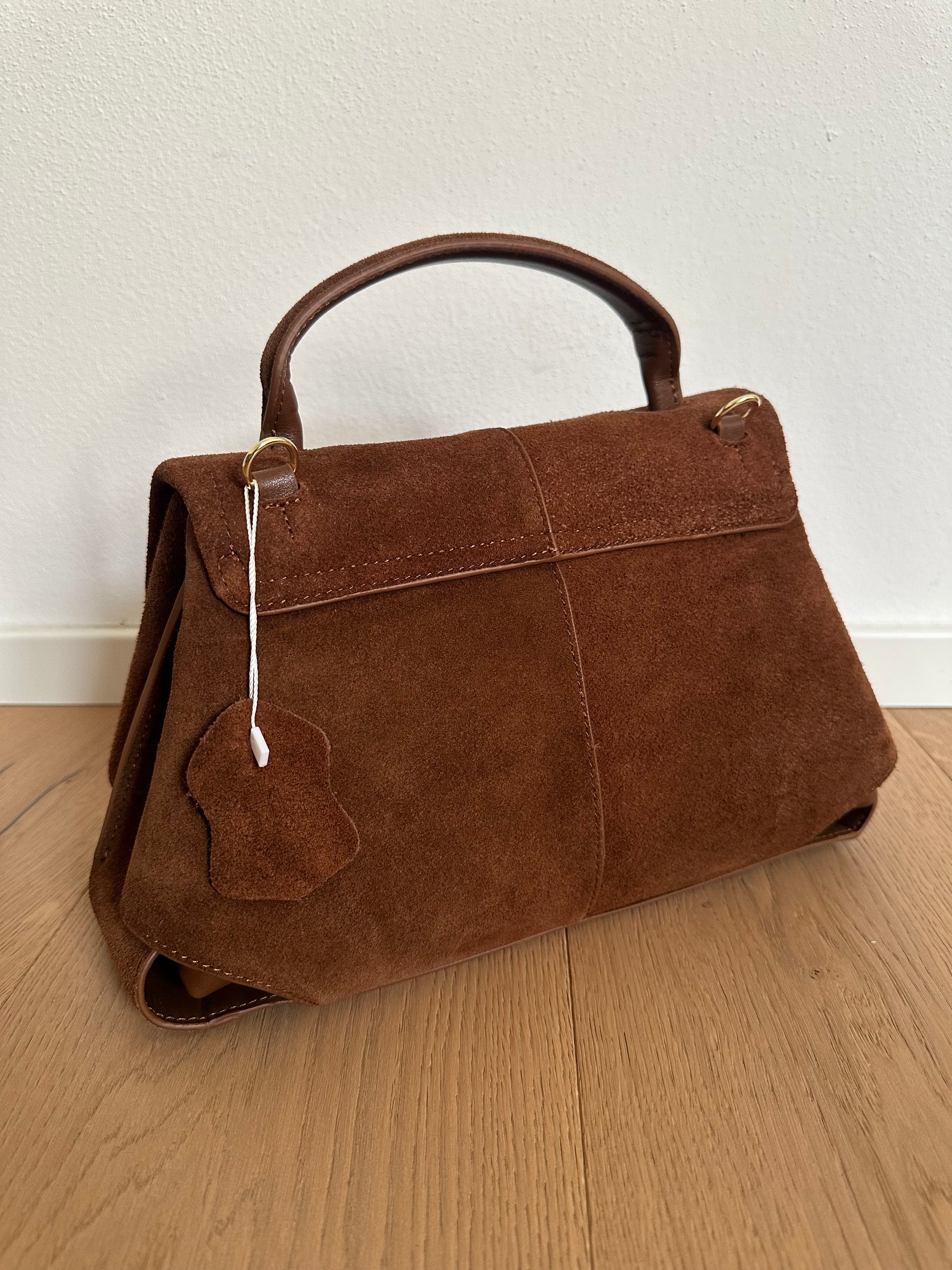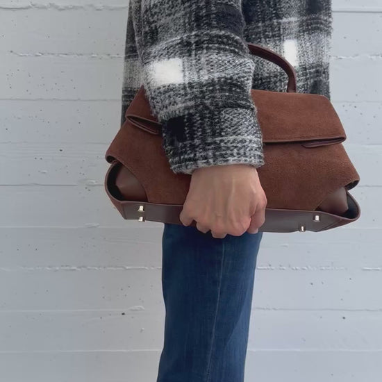 Il modello “ZAYNA” é realizzata in vera pelle di vitello scamociata con angoli tagliati che mostrano la pelle interna.